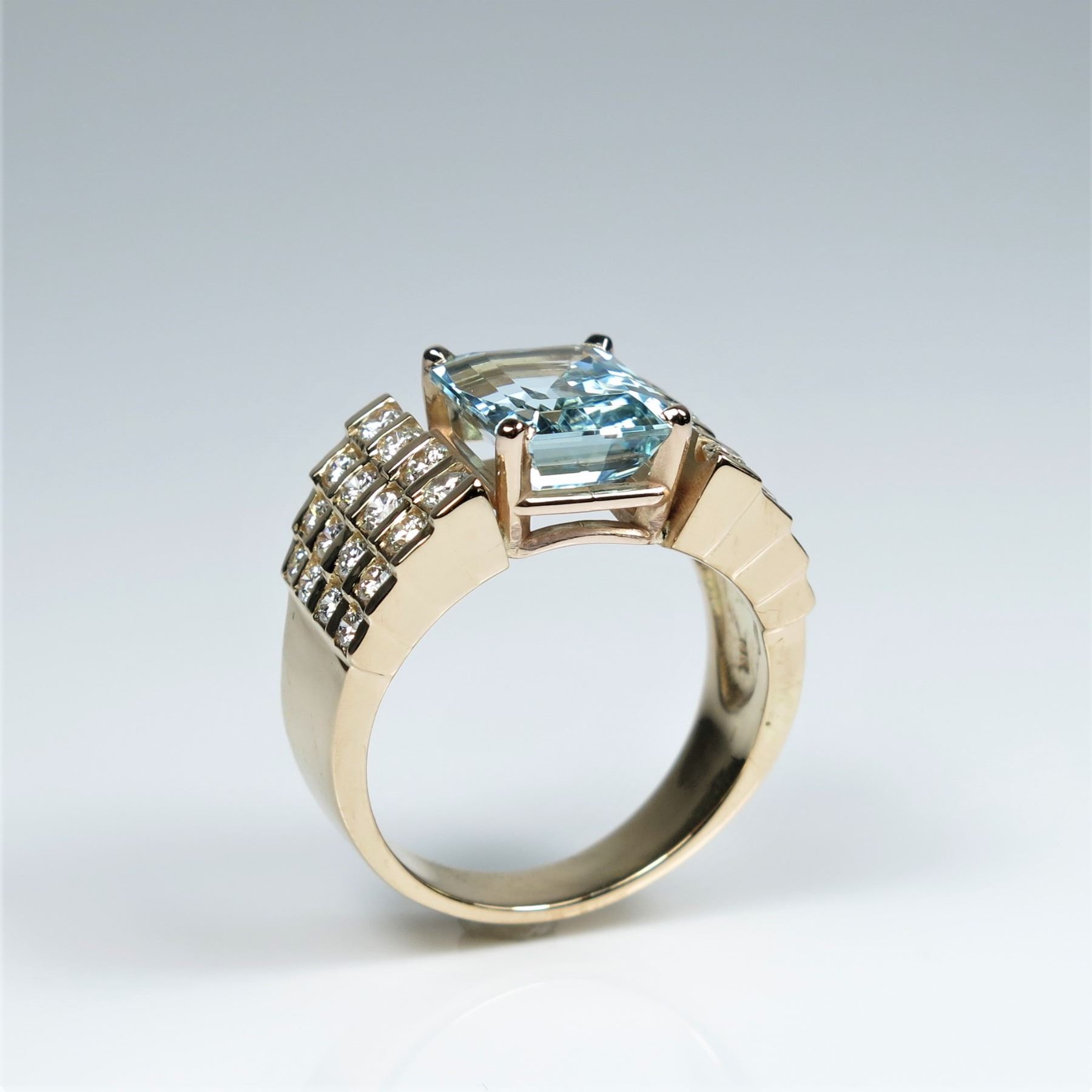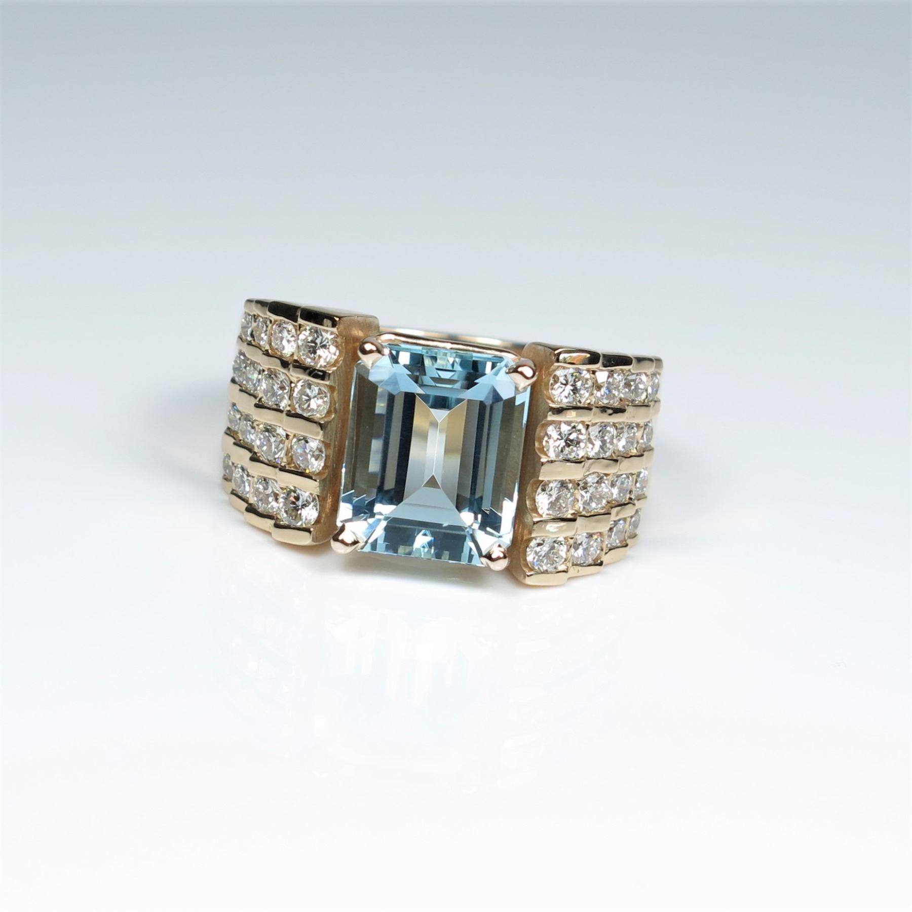 Exquisite Fine Santa Maria Aquamarine and White Diamond Ring featuring an emerald cut Aquamarine weighing approx. 4.00 carats accented with 32 ‘IDEAL’ cut Diamonds weighing approx. 1.50 carats with F-G colorsand VS clarity set in a custom made 14 karat Rose gold setting. Retail $5,000-$6,000 Estimates $3,000-$4,000