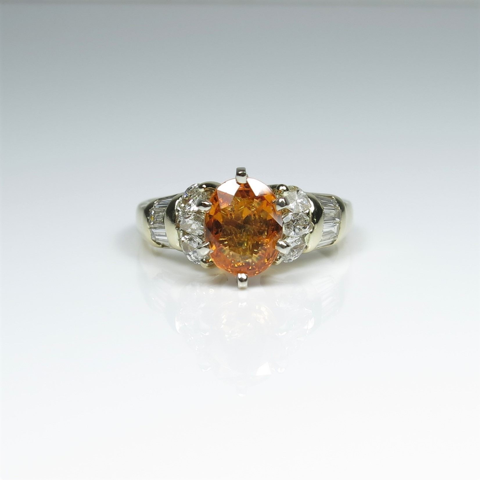 Exquisite Extra Fine Mandarin Garnet and Diamond Ring featuring a 3.00 carat oval cut bright orange Garnet accented with 14 marquise and baguette cut Diamonds weighing approx. 1.20 carats with G-H colors and VS clarity set in 14 karat yellow gold. Retail $4,000-$5,000 Estimates $2,000-$3,000