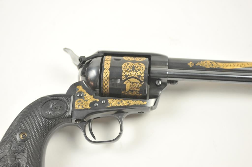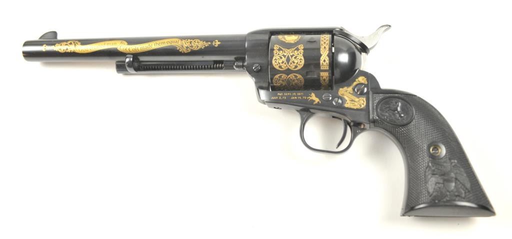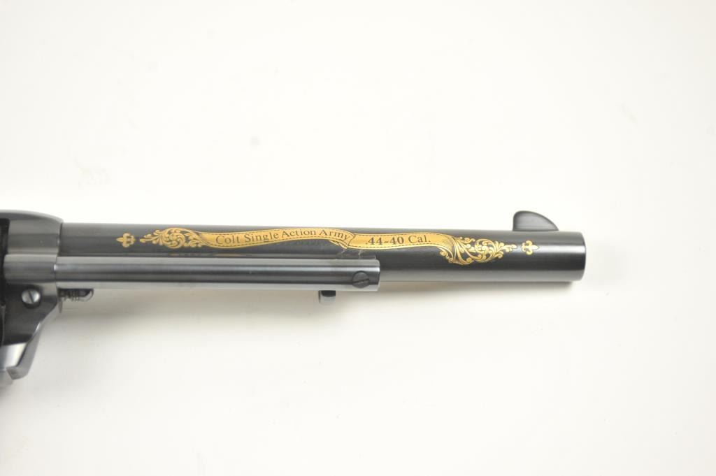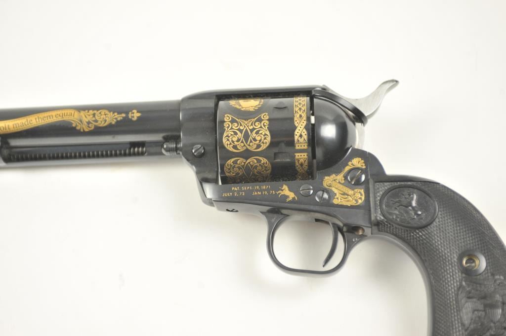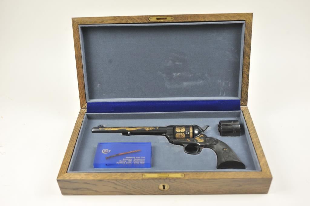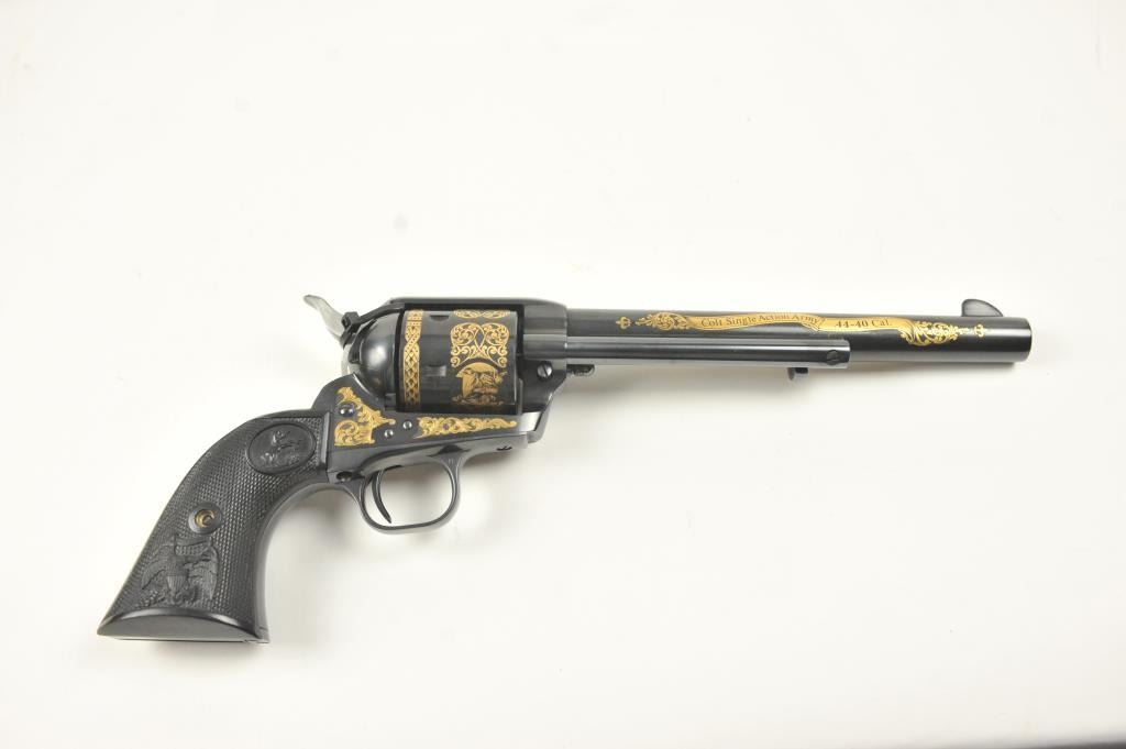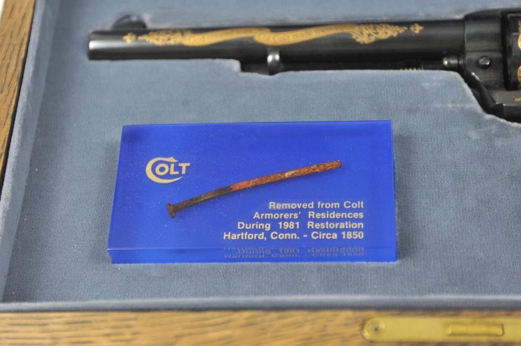 Colt Single Action Army revolver, #SA60351, 7 ½” barrel, .44-40 cal., custom workshop ordered Armory model with blued finish, gold decorations, presentation cased with 2 cylinders and a Lucite block containing anail from Colt’s original armorer’s residences in Hartford excavated in 1981. Excellent condition overall, showing no firing or use, in fitted Colt Custom Shop wooden box, with both shipping boxes andcustom workshop end label. (Modern/PPT) Est. $1500-3000