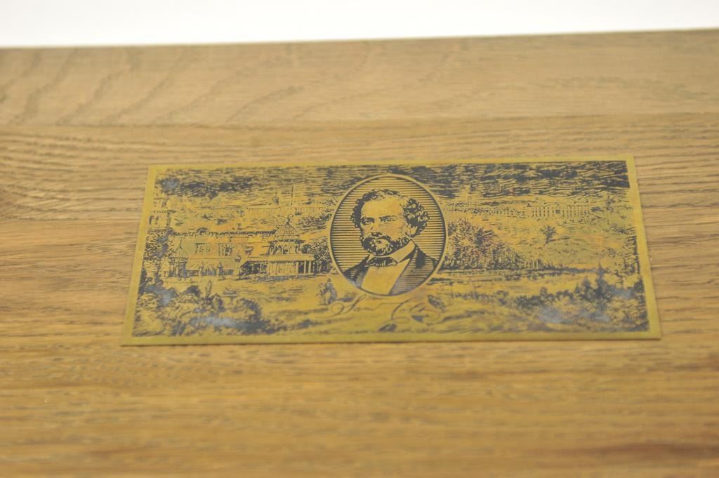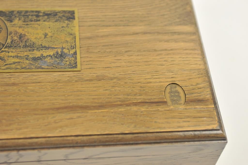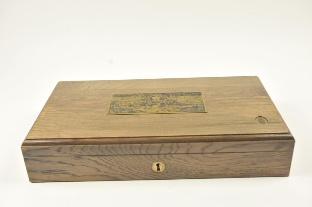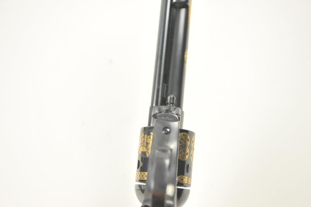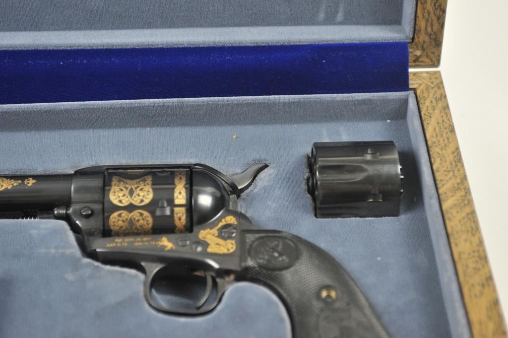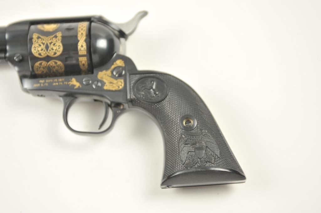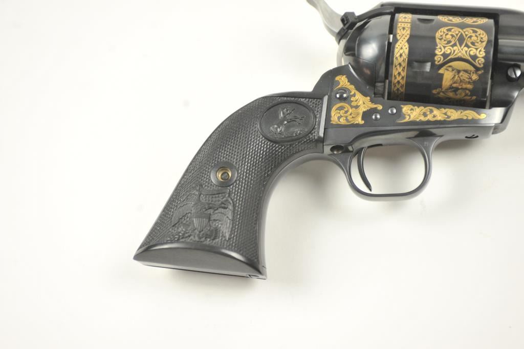 Colt Single Action Army revolver, #SA60351, 7 ½” barrel, .44-40 cal., custom workshop ordered Armory model with blued finish, gold decorations, presentation cased with 2 cylinders and a Lucite block containing anail from Colt’s original armorer’s residences in Hartford excavated in 1981. Excellent condition overall, showing no firing or use, in fitted Colt Custom Shop wooden box, with both shipping boxes andcustom workshop end label. (Modern/PPT) Est. $1500-3000