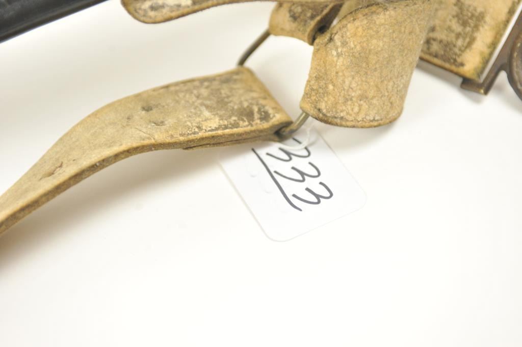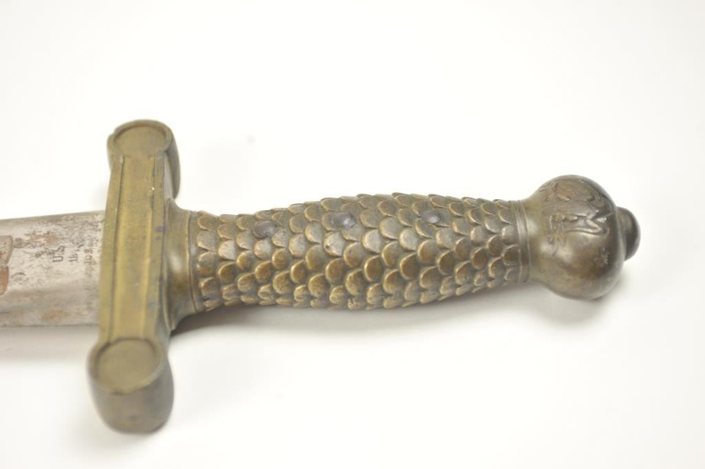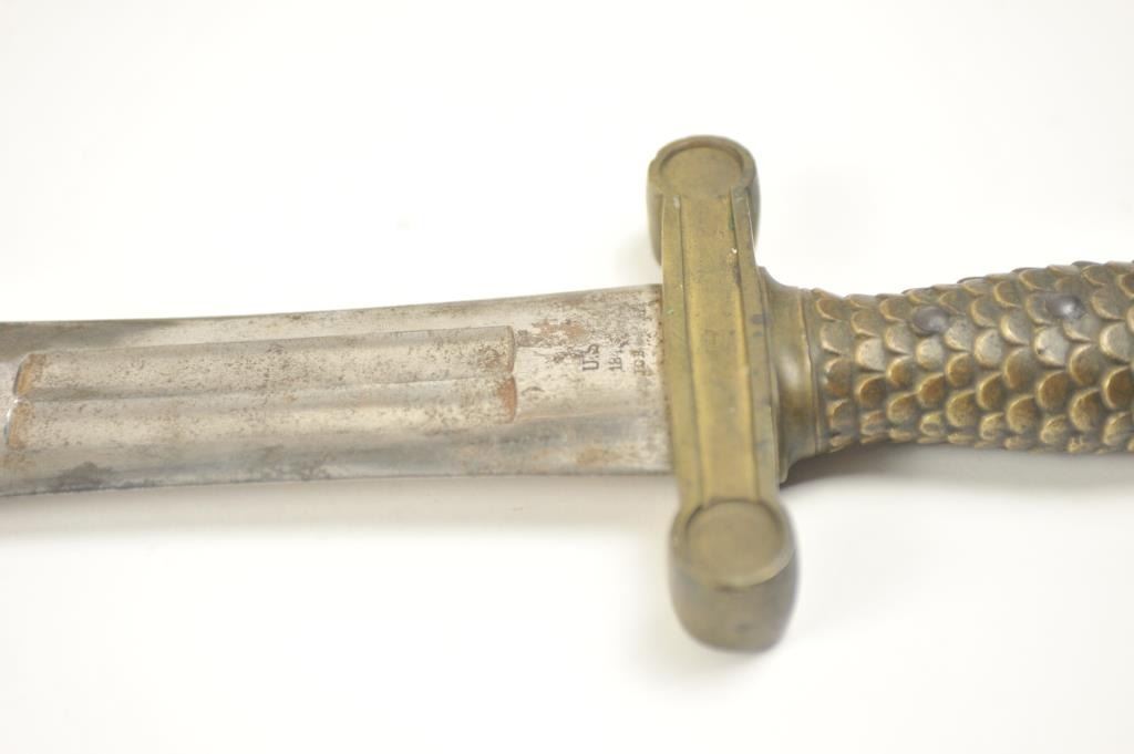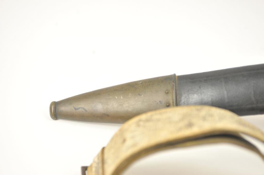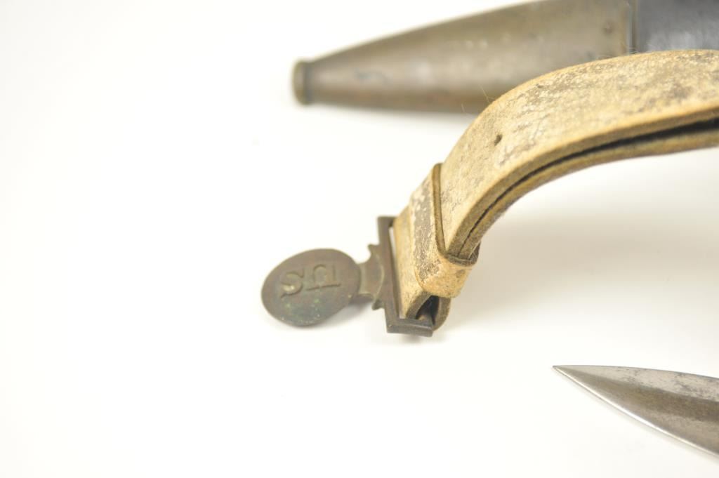 U.S. Model 1832 Artillery short sword by Ames with scabbard, belt, hanger and blade stamped U.S., “184” with the last digit not visible, “J.C.B.” and on the reverse, N.P. AMES, Springfield, with “W.A.T.” inspectionon the cross guard. The scabbard is very good plus with minor cracking, scuffs and losses. The hilt is sharp with a rich uncleaned dark patina. The buff leather belt and hanger are good plus with staining. The U.S. buckle is original to this belt with deep patina. The blade shows bright with light to moderate finish erosion and pitting. An 8 on a scale of 1-10. Est.: $900-$1,800.
