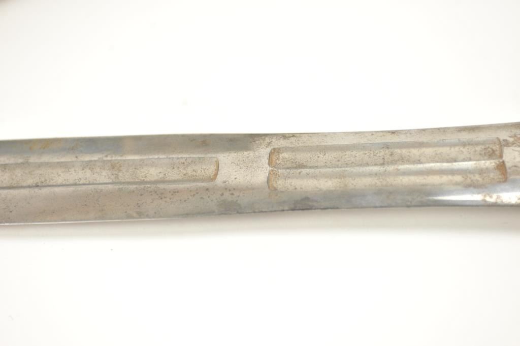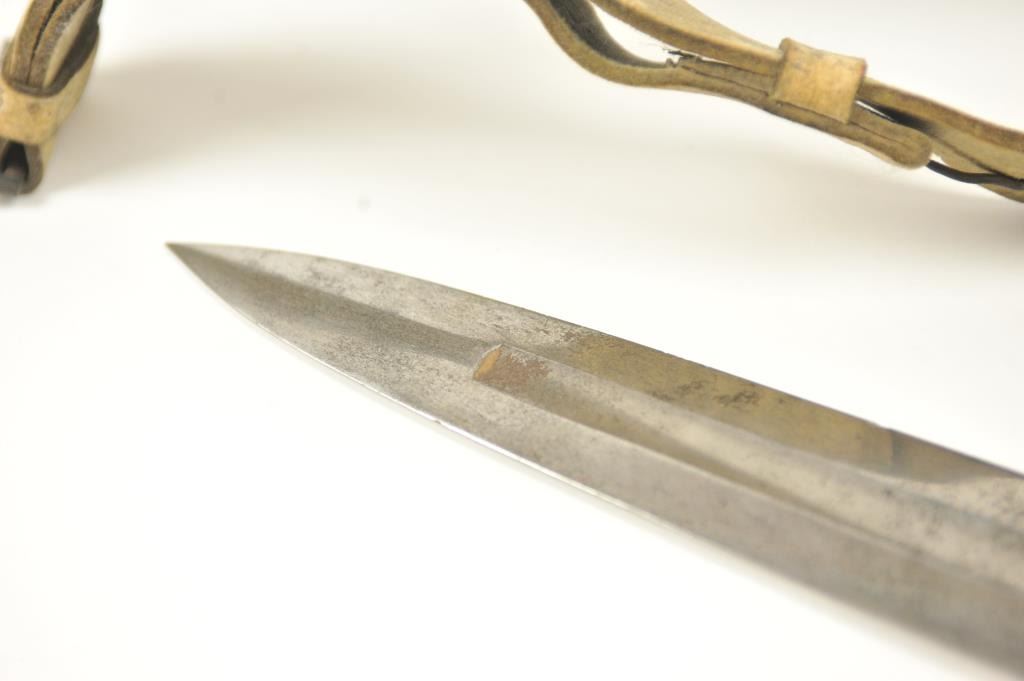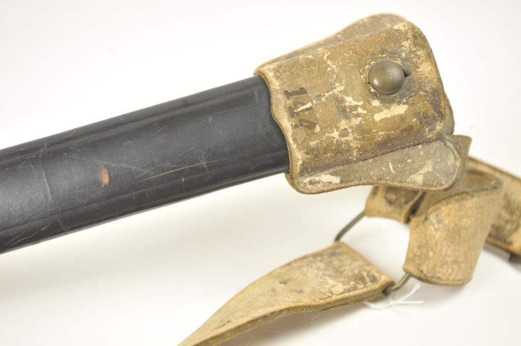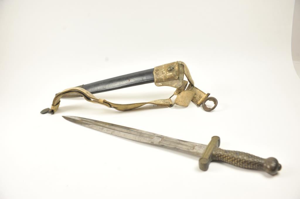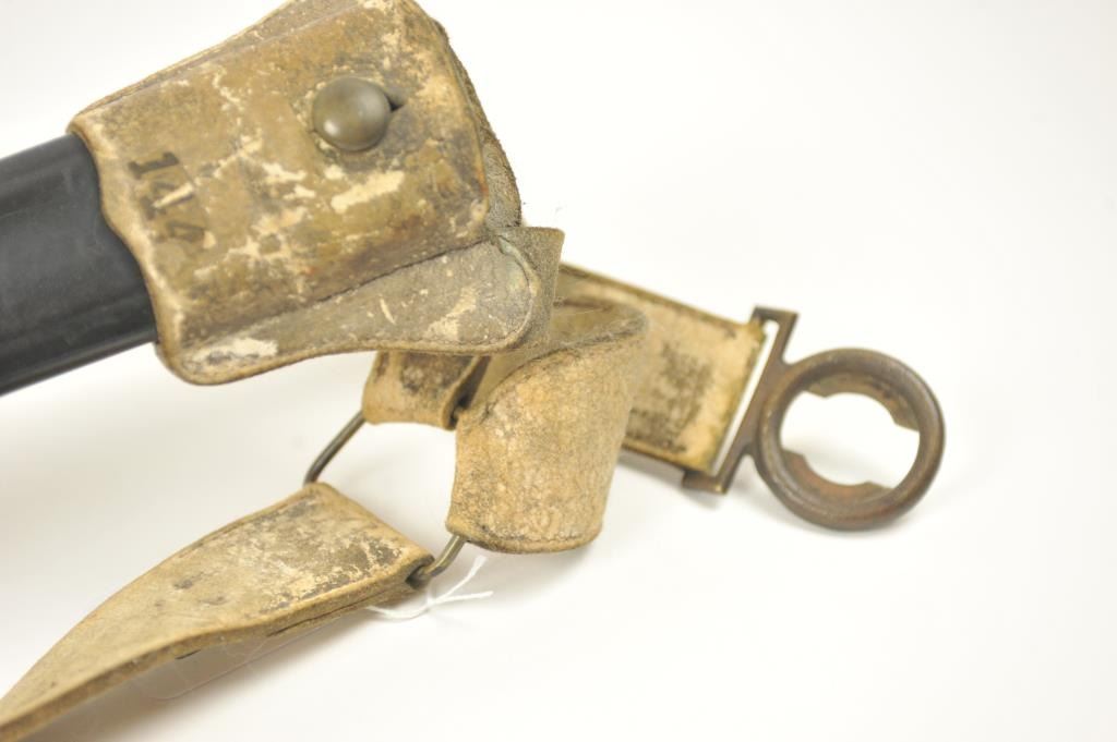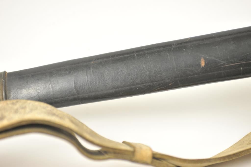 U.S. Model 1832 Artillery short sword by Ames with scabbard, belt, hanger and blade stamped U.S., “184” with the last digit not visible, “J.C.B.” and on the reverse, N.P. AMES, Springfield, with “W.A.T.” inspectionon the cross guard. The scabbard is very good plus with minor cracking, scuffs and losses. The hilt is sharp with a rich uncleaned dark patina. The buff leather belt and hanger are good plus with staining. The U.S. buckle is original to this belt with deep patina. The blade shows bright with light to moderate finish erosion and pitting. An 8 on a scale of 1-10. Est.: $900-$1,800.