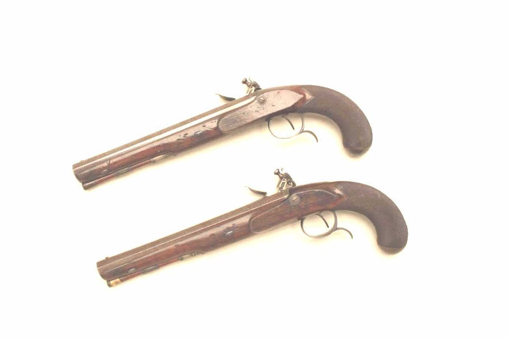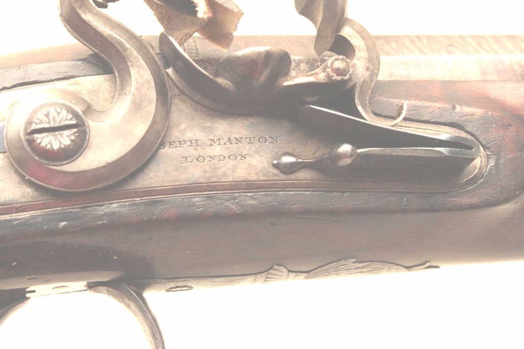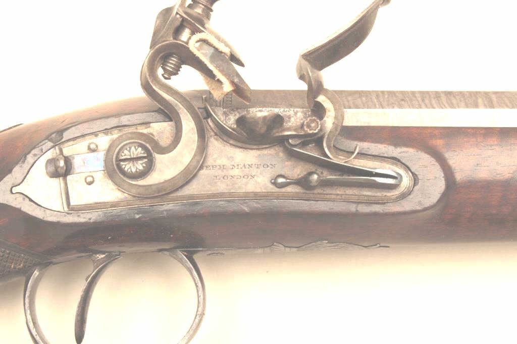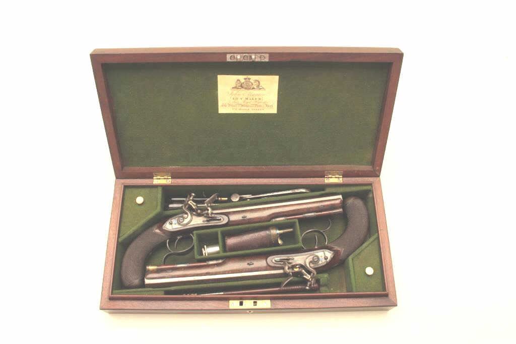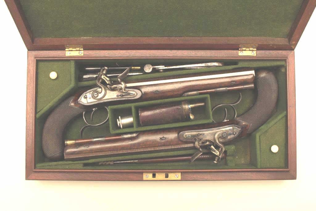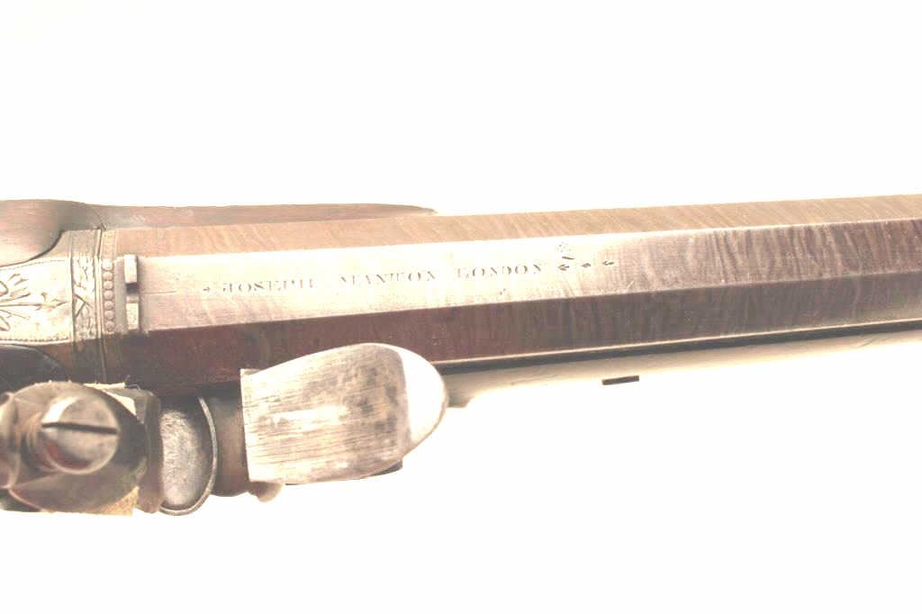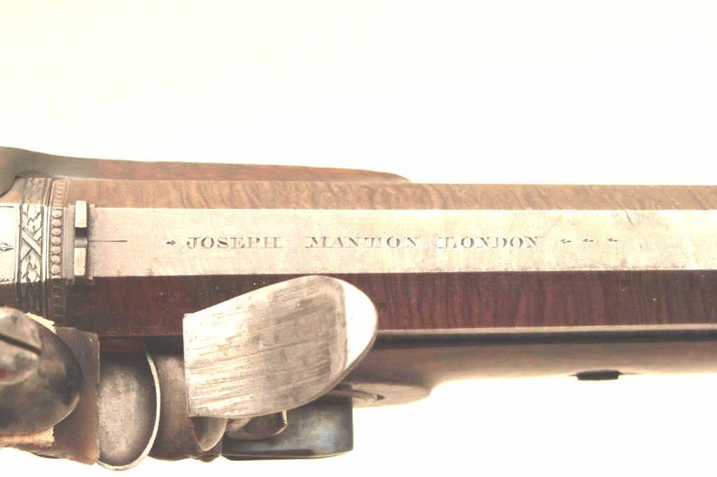 Lot 336 Pair of John Manton flintlock dueling pistols in case with accessories. Measures 15 ½” overall wit