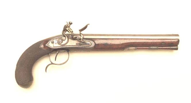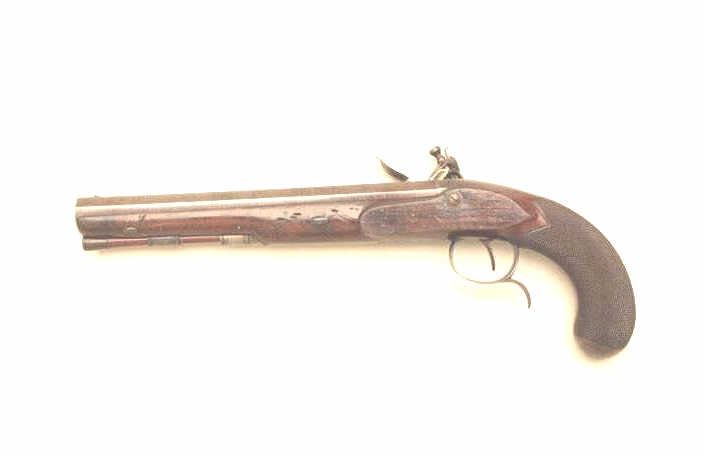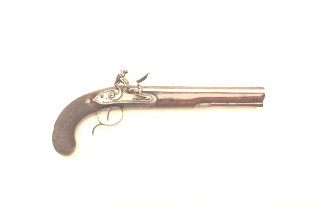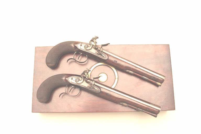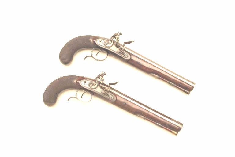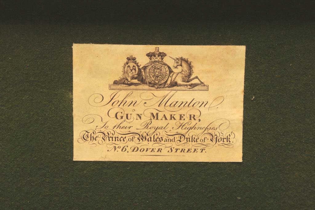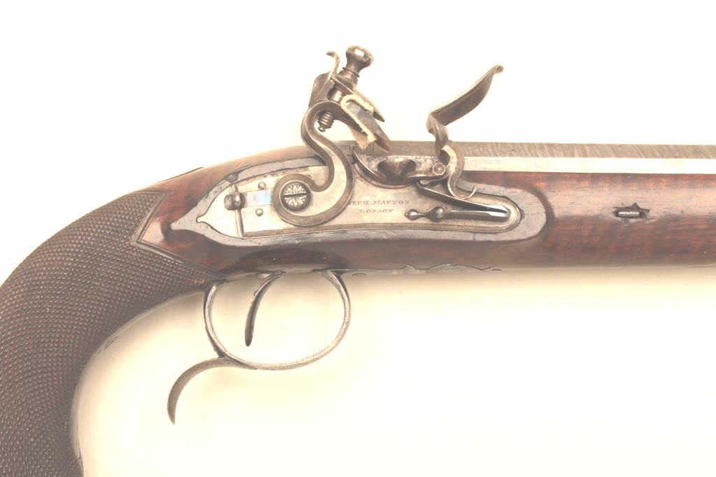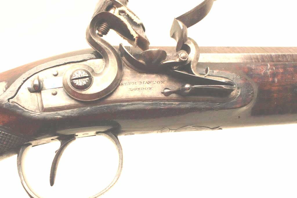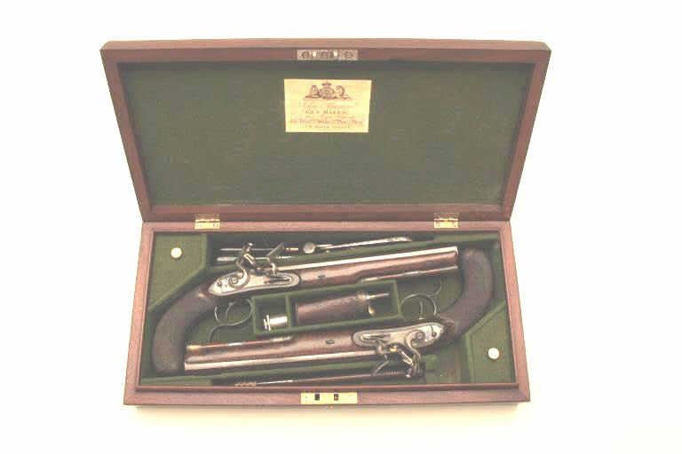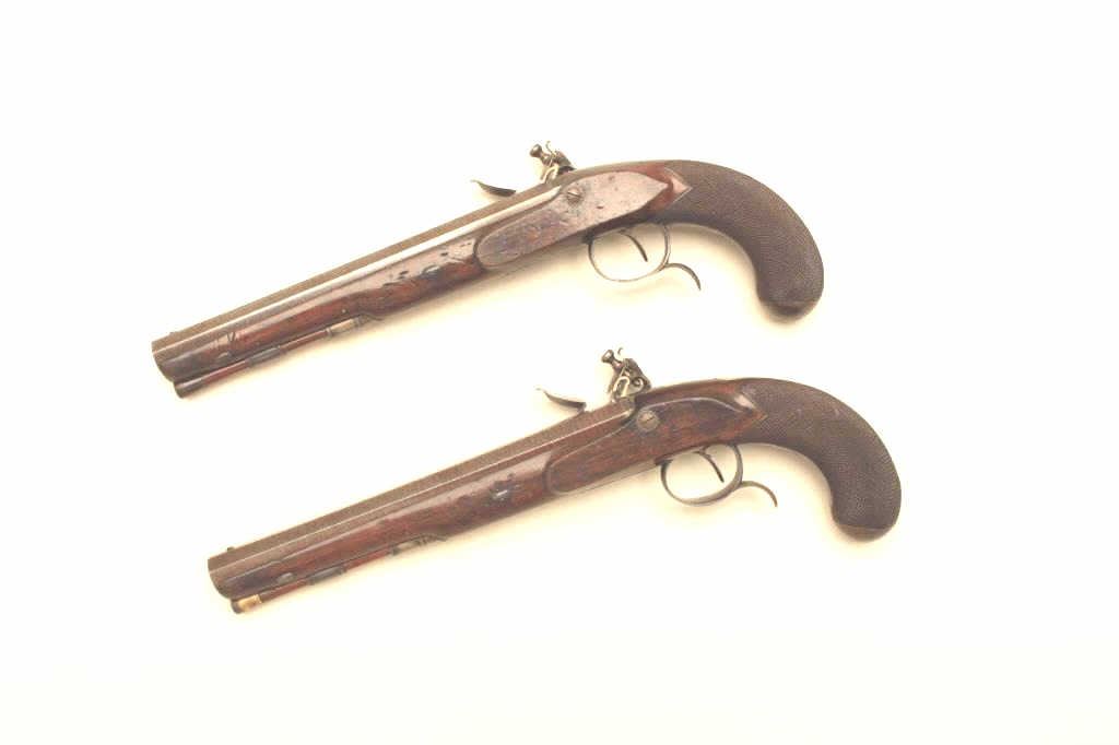 Lot 336 Pair of John Manton flintlock dueling pistols in case with accessories. Measures 15 ½” overall wit