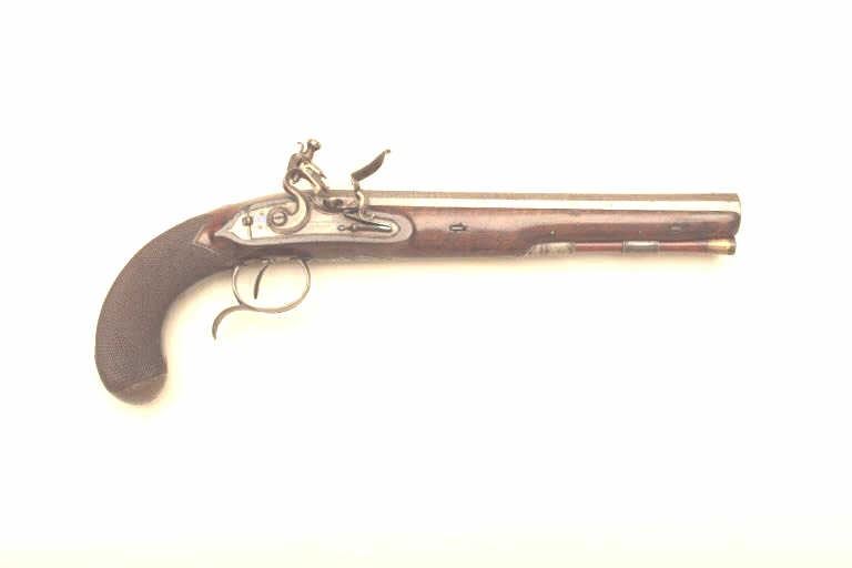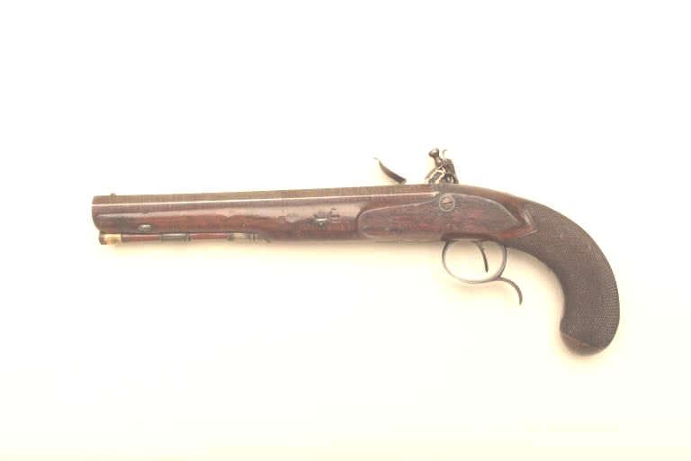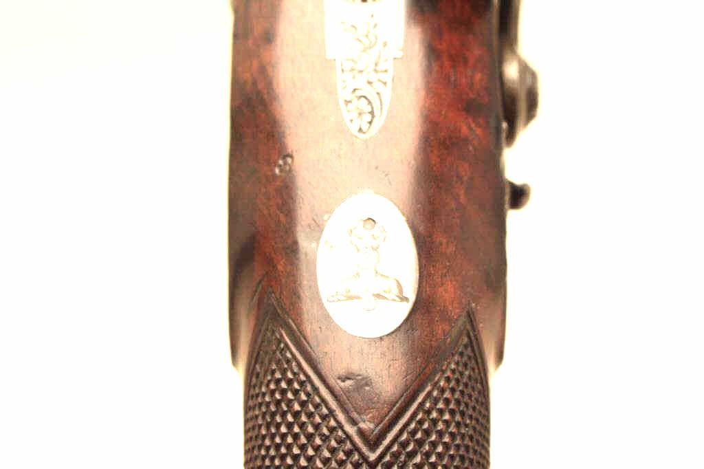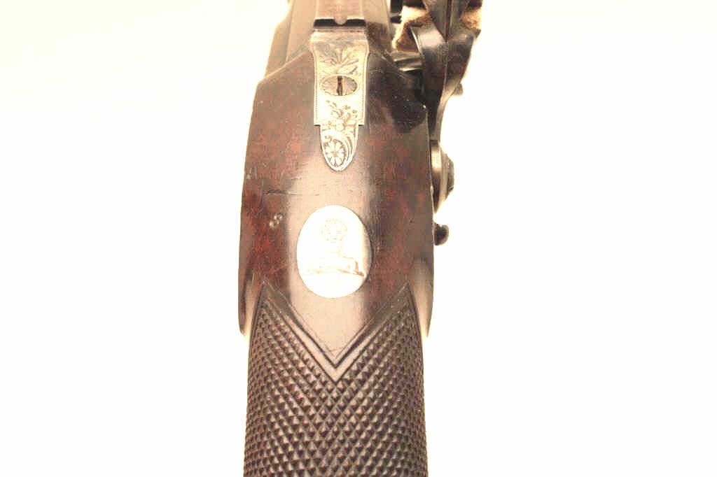 Pair of John Manton flintlock dueling pistols in case with accessories. Measures 15 ½” overall with 9 ½” barrels of .58 caliber smoothbore. Most of the brown and case hardened English finished remain. The stocksare very good with crisp checkering and some minor dents and scratches. Sharp markings and crisp edges. In original English case showing John Manton label in the lid. Correct style English leather covered flask, moldand screw driver. The wrist is inlaid with a silver plaque that is engraved. A crest of bearded man wearing wreath on head (Similar to ancient coins). The pair show Manton quality features with gold plugs andwaterproof pans. An exceptional set by top maker to British royalty. (Antique) Est.: $12,500-$25,000