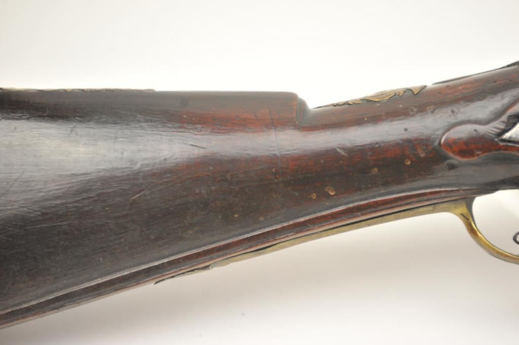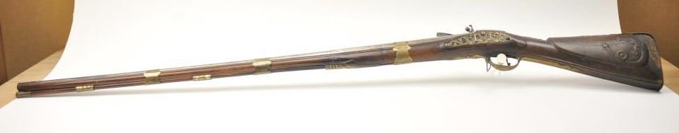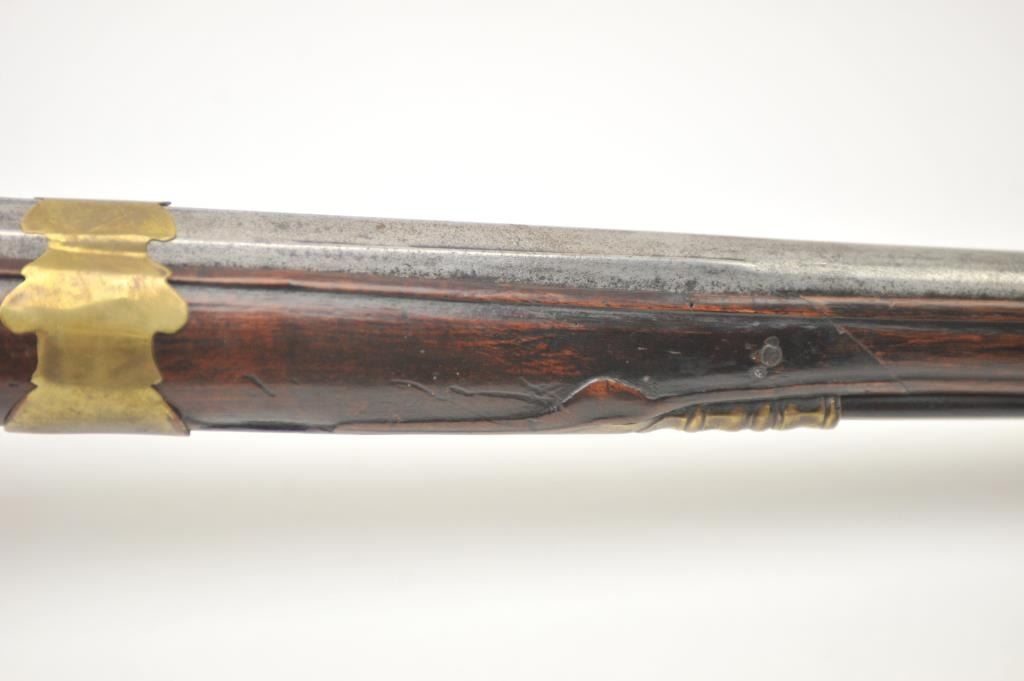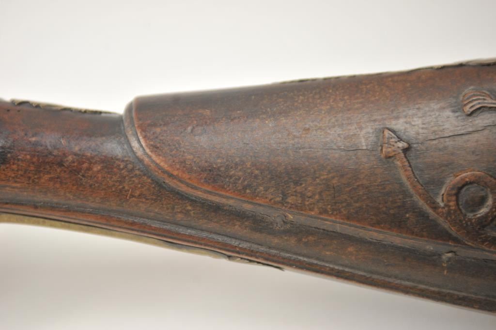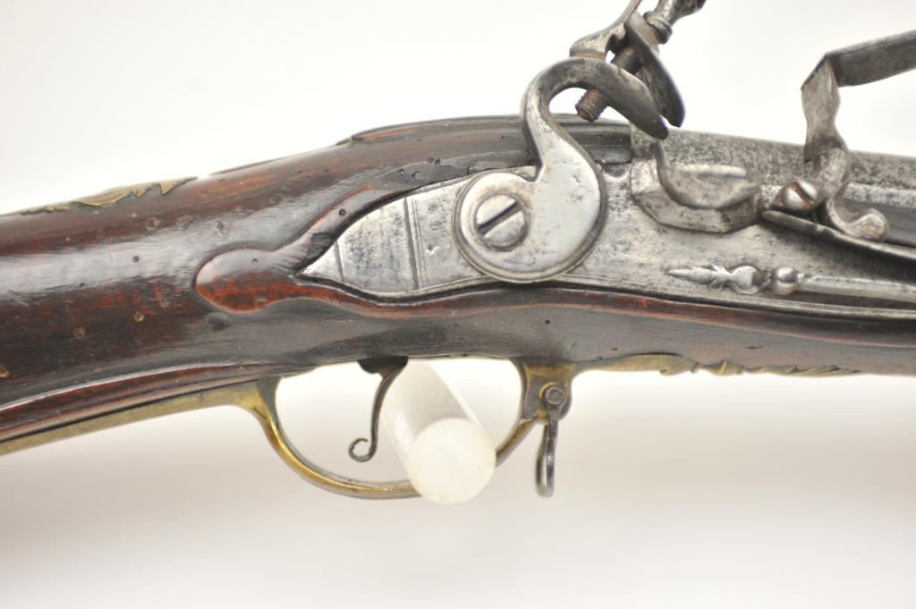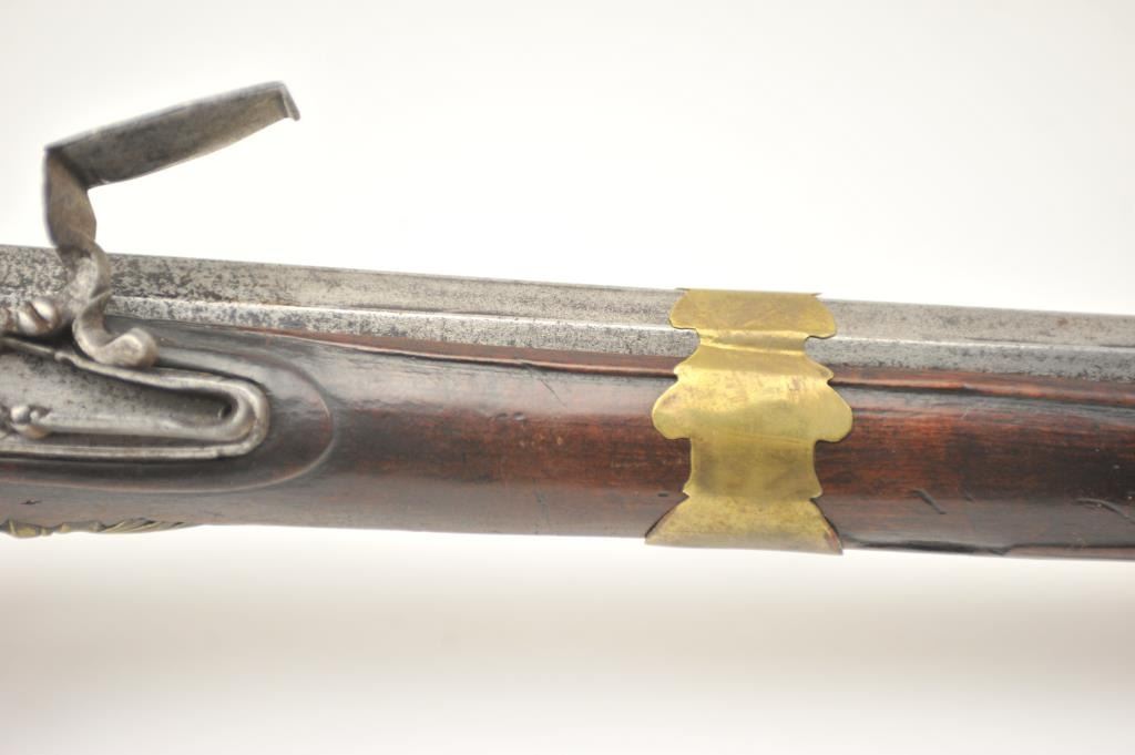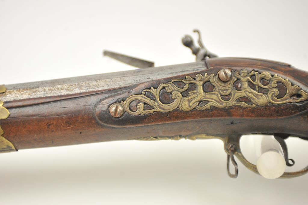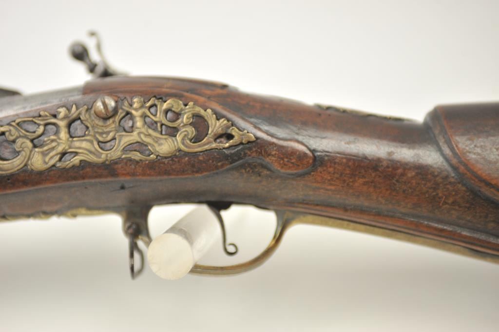Early Germanic full stock musket with a full stock and brass hardware. The lock shows a curved banana shape circa 1680-1790’s, fancy brass mounts with a pierced side plate showing angels with trumpets. There is araised carved serpent around the cheek piece. The metal shows light to moderate pitting and erosion and was lightly cleaned long ago. The stock is good with weathering and shrinkage around the butt plate along withsome small round worms in the wood. The musket is 53” in overall length with a 38 ½” barrel of approximately .58-.60 caliber smoothbore. Thin sheet brass bands and brass tipped ramrod included. The lock isoriginal with correct period parts and works well. Just the type arm used in early colonial America. Est.: $750-$1,500. (Antique).