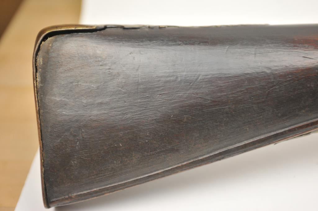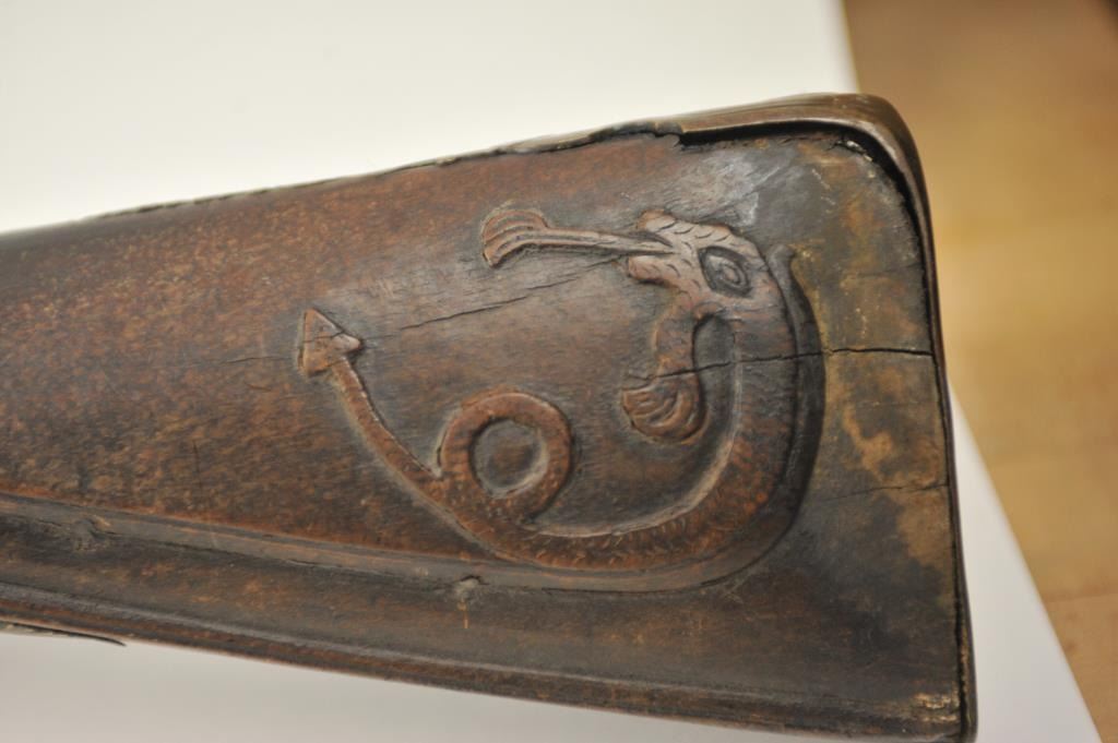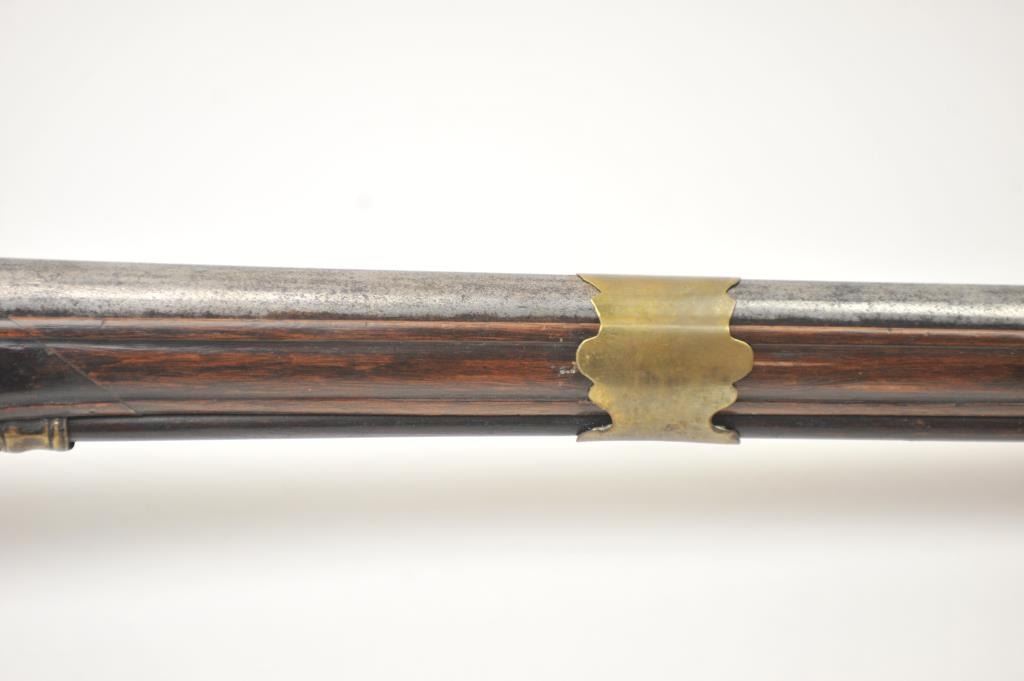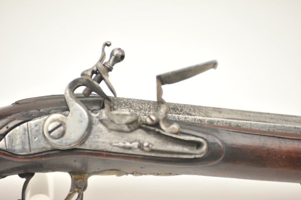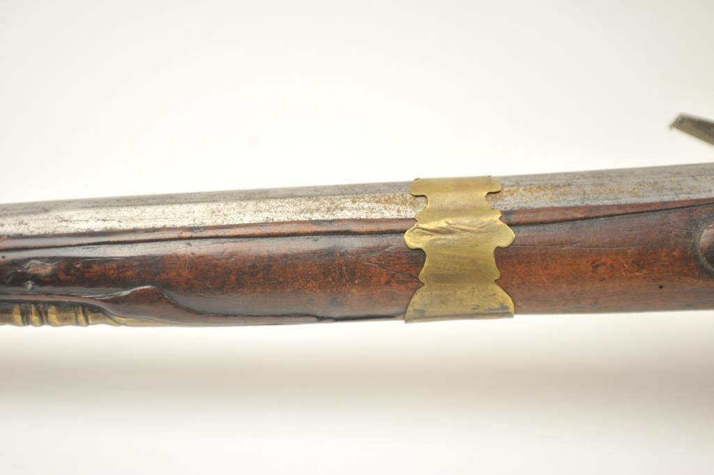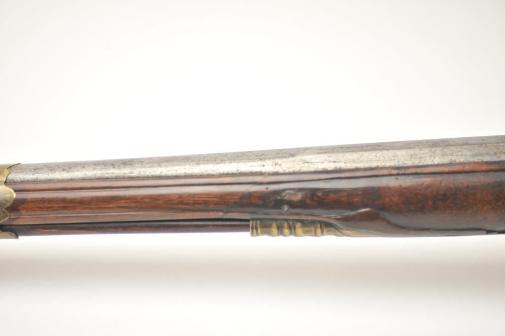 Early Germanic full stock musket with a full stock and brass hardware. The lock shows a curved banana shape circa 1680-1790’s, fancy brass mounts with a pierced side plate showing angels with trumpets. There is araised carved serpent around the cheek piece. The metal shows light to moderate pitting and erosion and was lightly cleaned long ago. The stock is good with weathering and shrinkage around the butt plate along withsome small round worms in the wood. The musket is 53” in overall length with a 38 ½” barrel of approximately .58-.60 caliber smoothbore. Thin sheet brass bands and brass tipped ramrod included. The lock isoriginal with correct period parts and works well. Just the type arm used in early colonial America. Est.: $750-$1,500. (Antique).