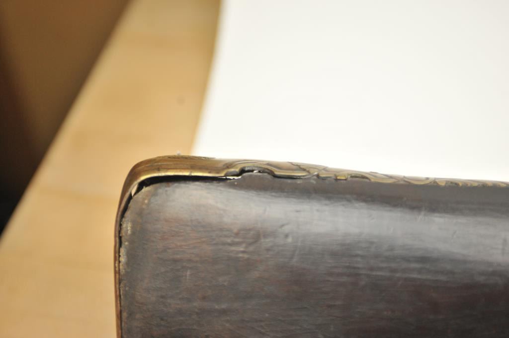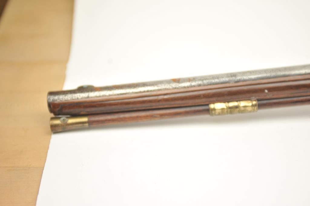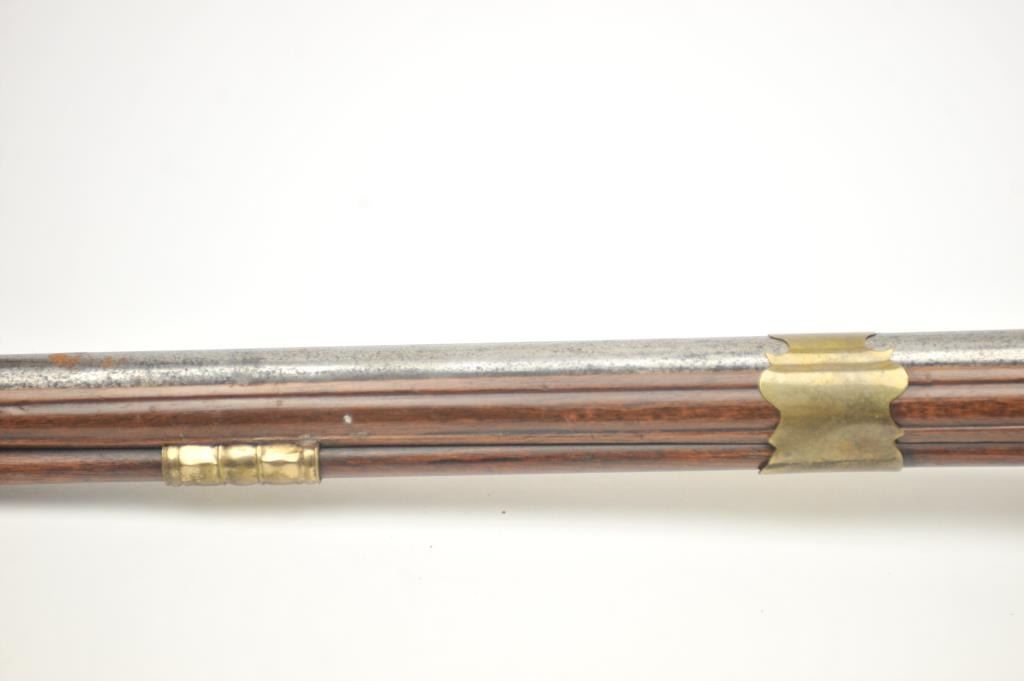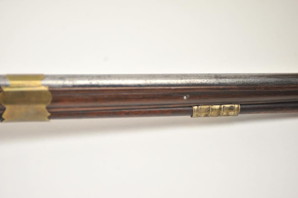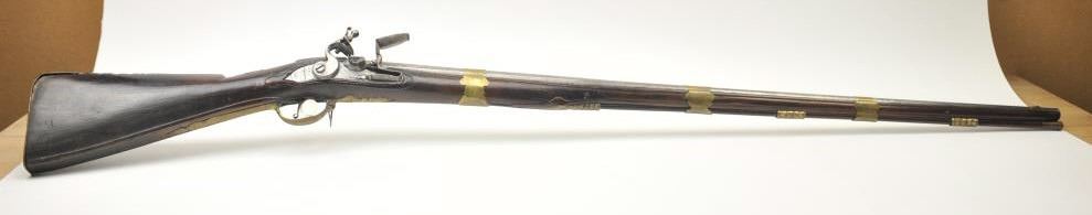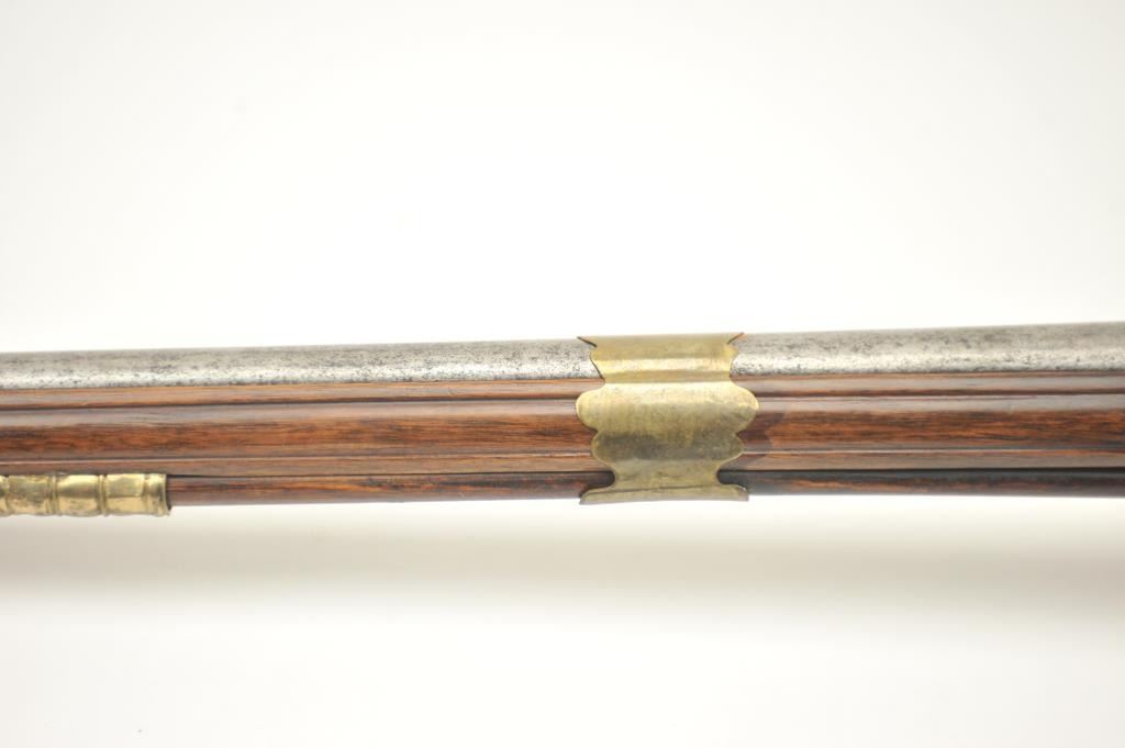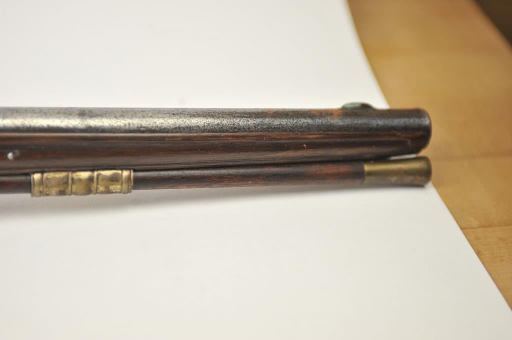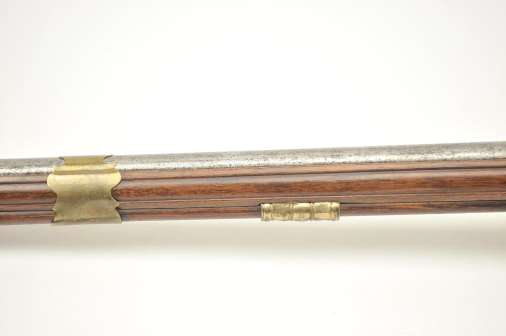 Early Germanic full stock musket with a full stock and brass hardware. The lock shows a curved banana shape circa 1680-1790’s, fancy brass mounts with a pierced side plate showing angels with trumpets. There is araised carved serpent around the cheek piece. The metal shows light to moderate pitting and erosion and was lightly cleaned long ago. The stock is good with weathering and shrinkage around the butt plate along withsome small round worms in the wood. The musket is 53” in overall length with a 38 ½” barrel of approximately .58-.60 caliber smoothbore. Thin sheet brass bands and brass tipped ramrod included. The lock isoriginal with correct period parts and works well. Just the type arm used in early colonial America. Est.: $750-$1,500. (Antique).