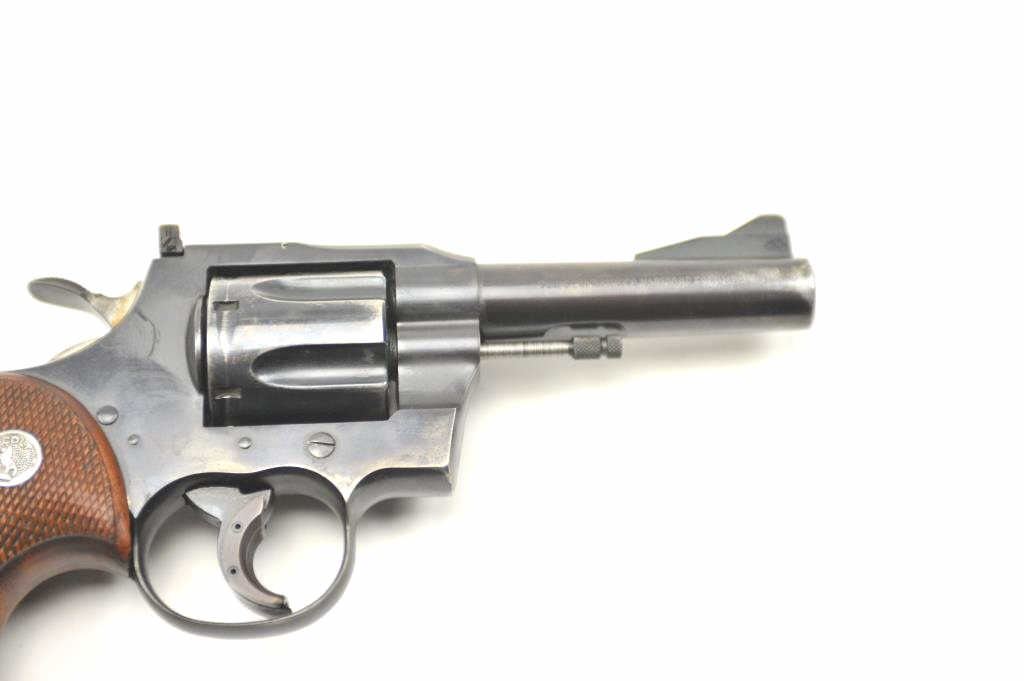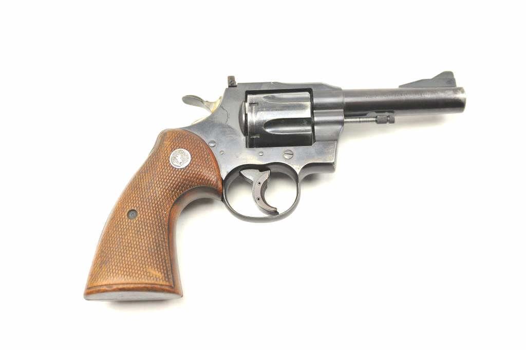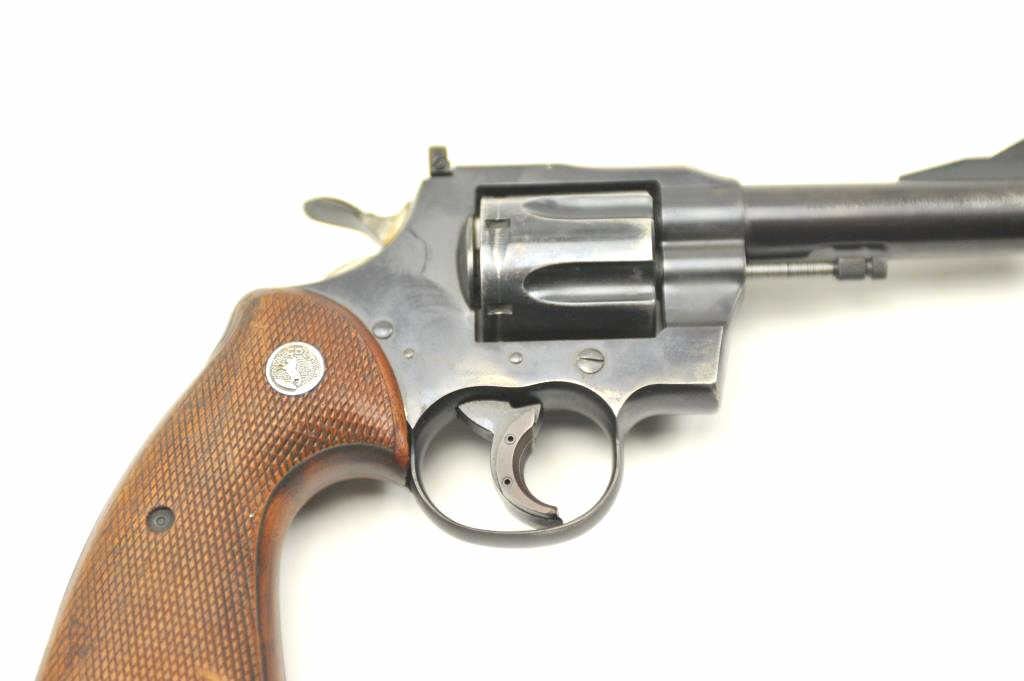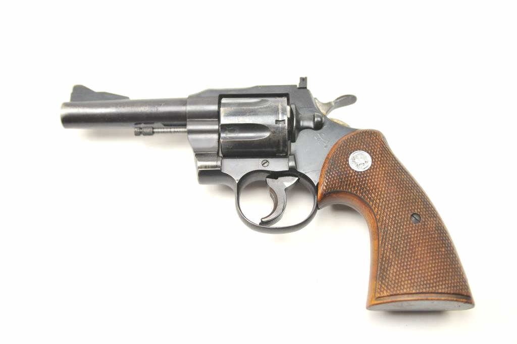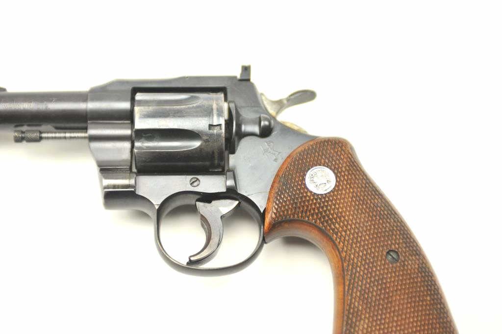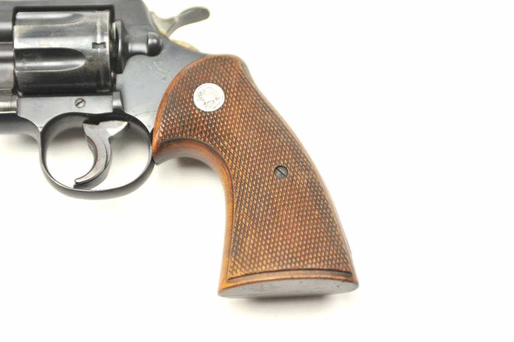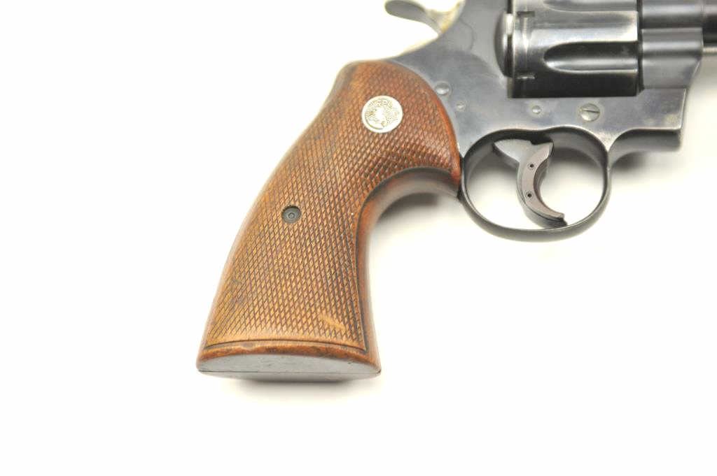 Colt “357” Double Action Revolver in .357 mag caliber with a 4” barrel remaining in good condition, S/N 11021. This revolver was Colt’s 1st attempt at a .357 magnum double action revolver in the 1950s preceding Python and trooper models. 75%-85% original blue with loss from carry and use by California Police officer (Maywood), Trigger show added and positive action. The grips are good showing carry in holster. Good bore andaction. (C&R/PPT) Est.: $500-$1000