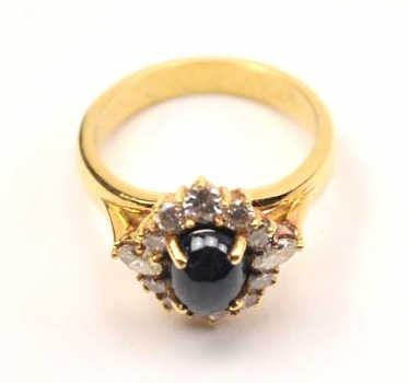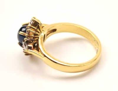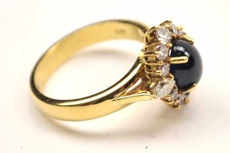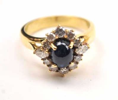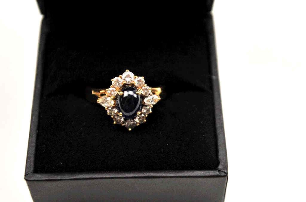 Outstanding blue sapphire and diamond ladies ring set in 18K yellow gold. The ring features a great cabochon blue sapphire of approximately 1 ct. surrounded by ten round and two marquise cut high white diamonds.The ring is marked, “18K”. A nice vintage piece from a local estate. Est.: $300-$600.