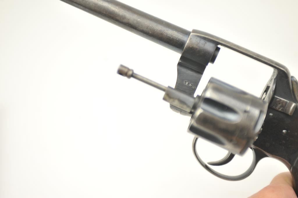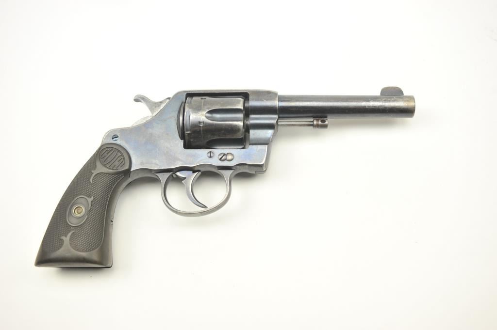 Colt 1895 Double Action Revolver in .41 L.C. with a 4 ½” barrel in good to very good original condition, S/N 229912. 50%-60% original blue with some surface rust, minor erosion and slight pinprick pitting. Goodaddress and markings. Early hard rubber grips are good to very good with minor wear. Mechanically sound and very tight lock up with good bore. (C&R/PPT) Est.: $250-$500