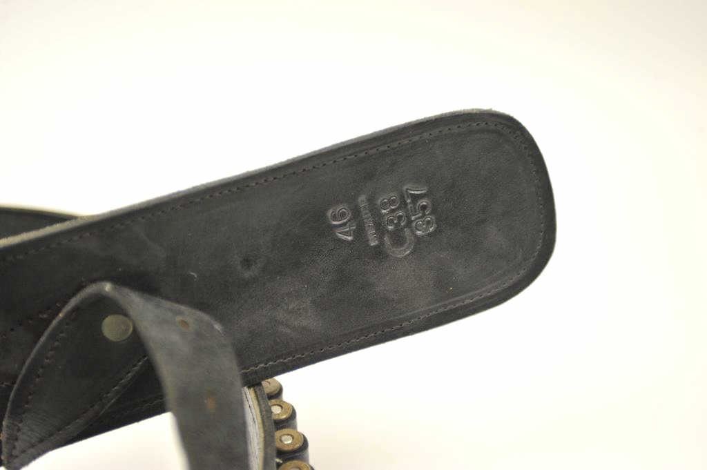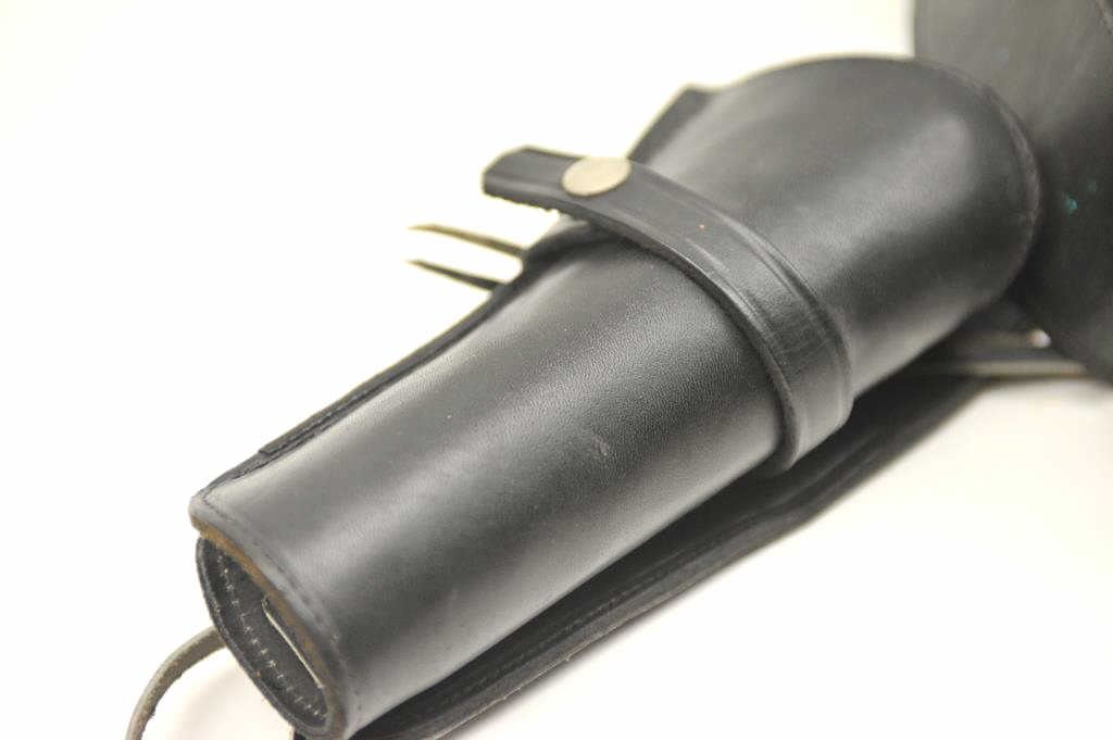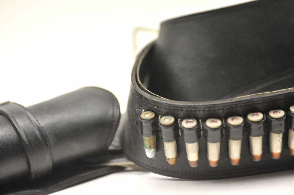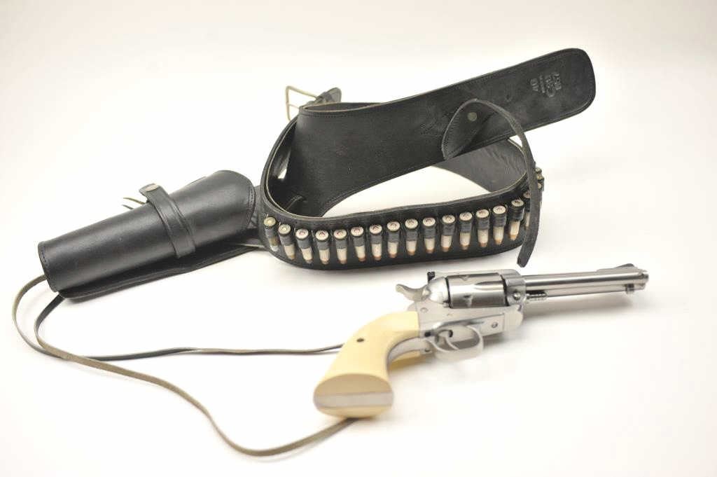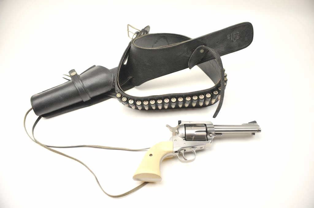 Ruger New Model Blackhawk .357 magnum Single Action Revolver with a 4 ¾” barrel, stainless steel, faux ivory grips and western holster rig, S/N 36-55702. This pistol remains in very good plus used condition showing someuse. The belt and holster are size 46 and needs restitching to the belt and tab. (Modern/PPT) Est.: $350-$700