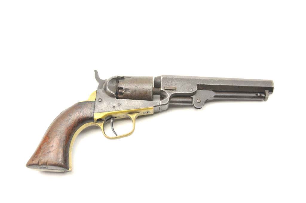 Colt 1849 Pocket Model .31 caliber percussion with 1 line New York Address, 6 shot cylinder, and 5” barrel, S/N 234067. Fair to good condition with gray/brown patina finish. All matching visible numbers. Traces ofcylinder scene. Good markings. Scattered minor pitting and erosion. The grips show traces of varnish with small losses, tacking marks on bottom right grip and 2 cut “battle notches” on bottom right grip. Nipplereplaced and some battering and metal loss around nipples at back of the cylinder. Small gap at the rear of frame. The action is working. An honest well used ’49 with scarce 5” New York six shot configuration. (Antique) Est.: $350-$700