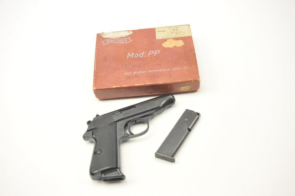 Walther PP Semi-Auto Pistol in .32 ACP with “NDS” West German police and import markings, S/N 37062 made 1967. In box with extra mag and reprint instruction book. Fine to excellent used condition. 96%-99%. Box iscorrect Walther marked with name Cracium and Abteilungsfuhrungsgruppe” on label. (C&R/PPT) Est.: $300-$600