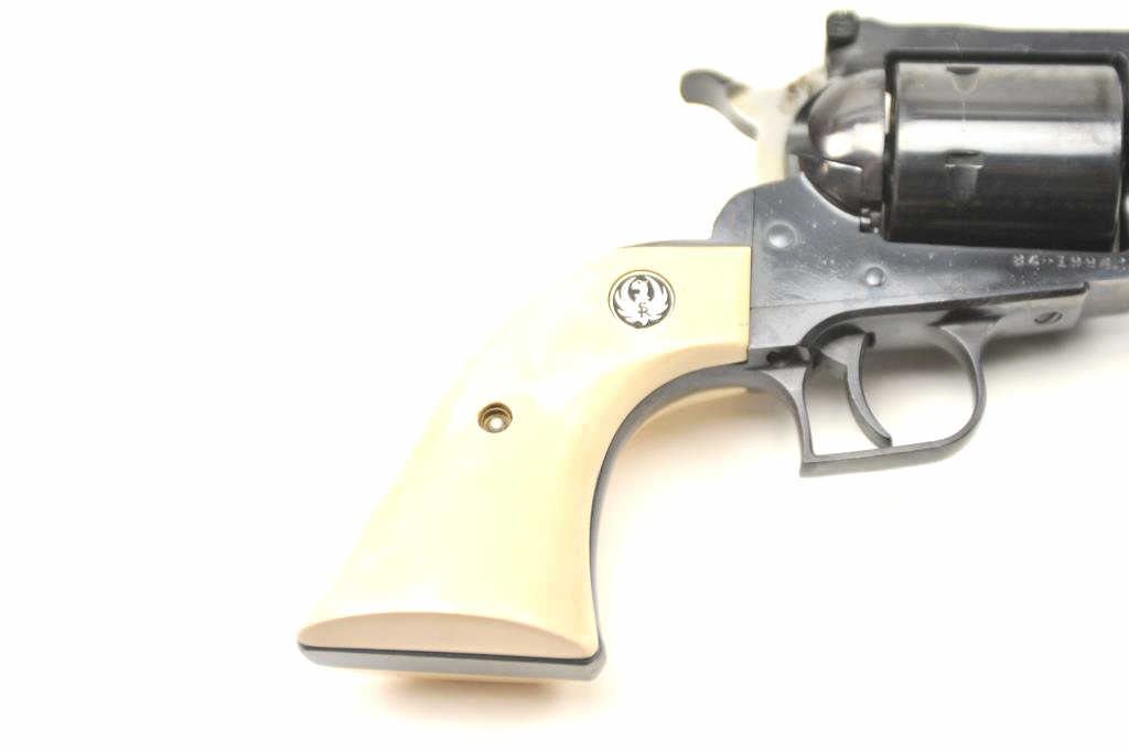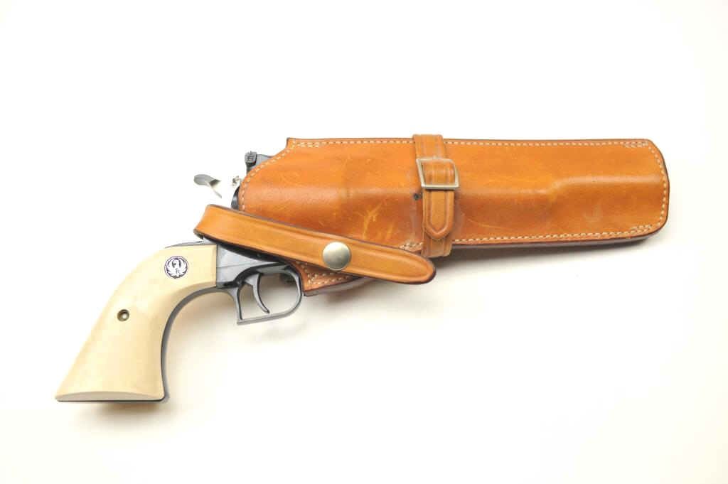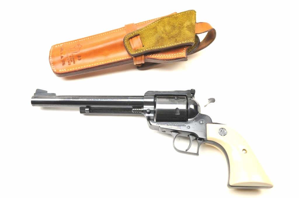 Ruger Super Blackhawk Single Action Revolver in .44 Mag caliber with a 7 ½” barrel, blued finish, and faux ivory Ruger medallion grips, S/N 84-19942. Very good plus to almost fine used condition. 96%-98% blue with slight line on the cylinder, discolorations on hammer that may clean and some minor fresh spots. With Safari Land high quality leather holster lined in green suede. (C&R/PPT) Est.: $300-$600