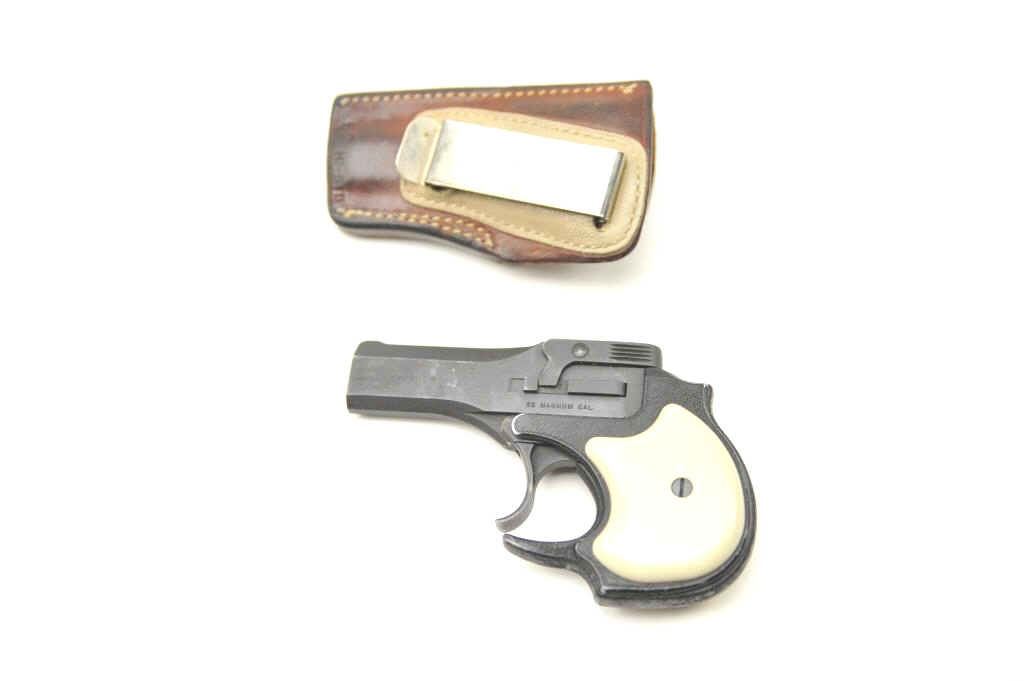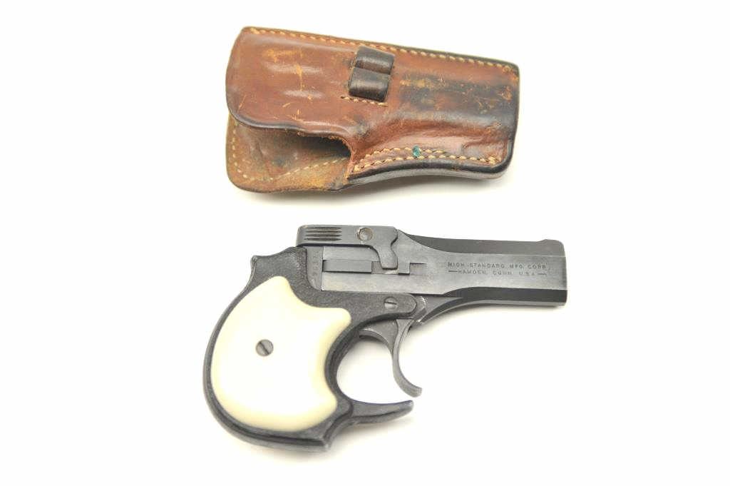 Hi Standard Model 101 O/U derringer in .22 mag caliber, S/N 96371. 95%+ original finish with carry holster as carried by detective in Maywood P.D. as a backup. Good action and bore (Modern/PPT) Est.: $200-$400
