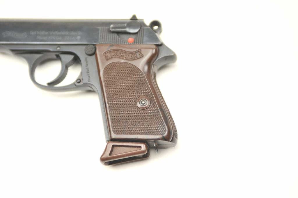 Walther PPK Double Action Semi-Auto Pistol in .22 L.R. dated 1966 and proofed with no import marks, S/N 107832LR. Fine to excellent used condition. 95%-98% original blue. Near fine grips and matching mag extender (nocracks and 1 small mark). “Made in West Germany” marking. Mechanically sound and tight. Excellent bore. (C&R/PPT) Est.: $750-$1500