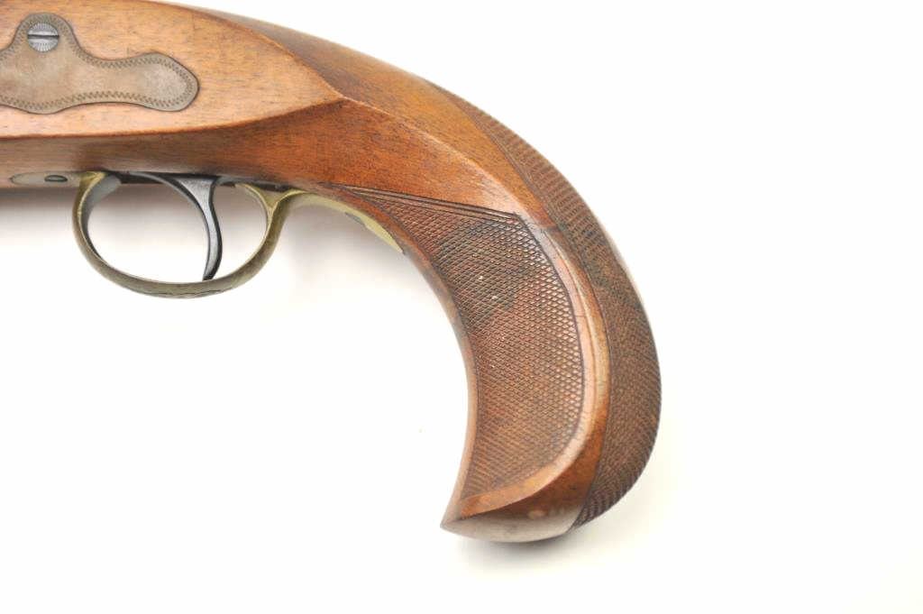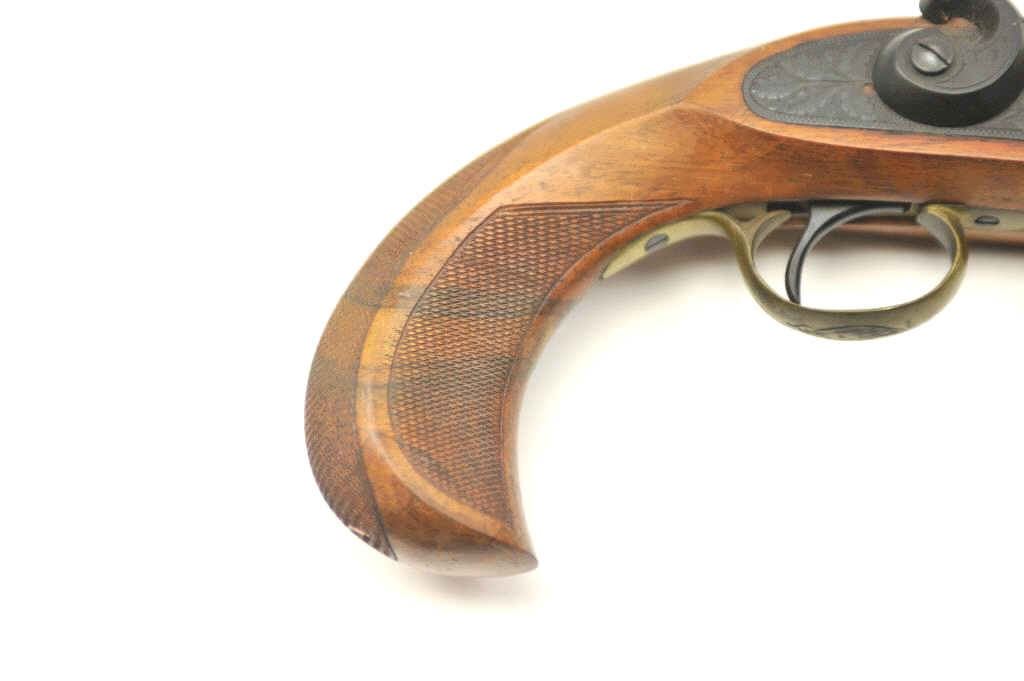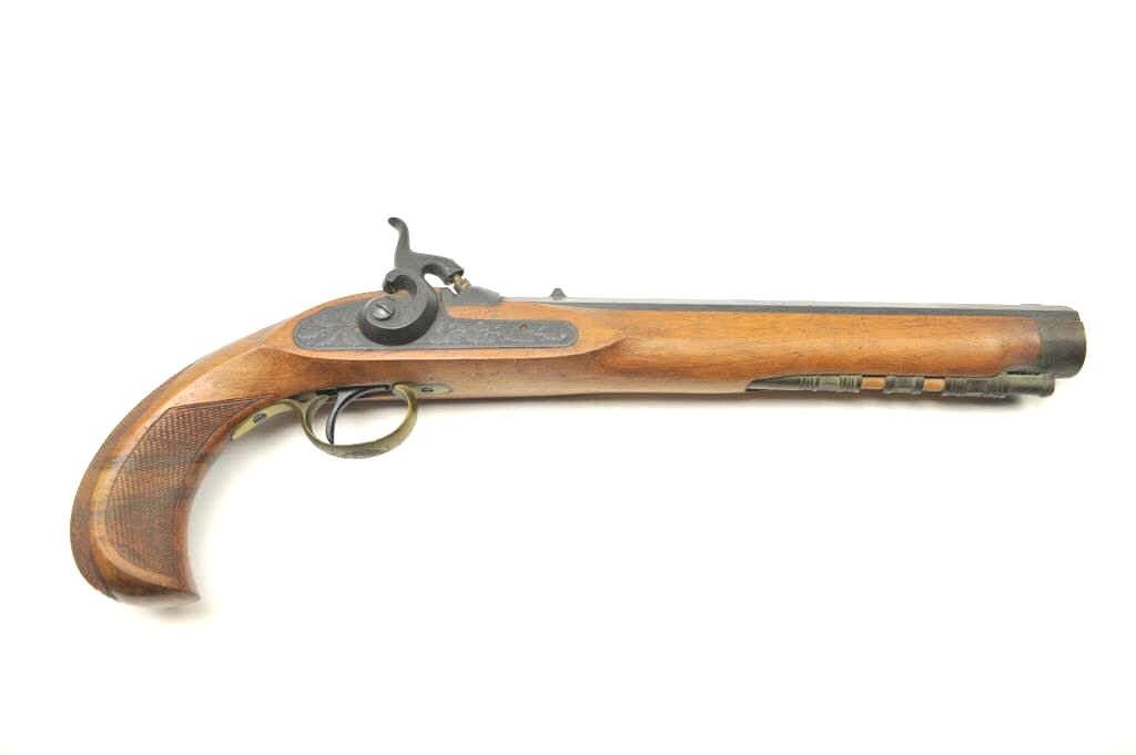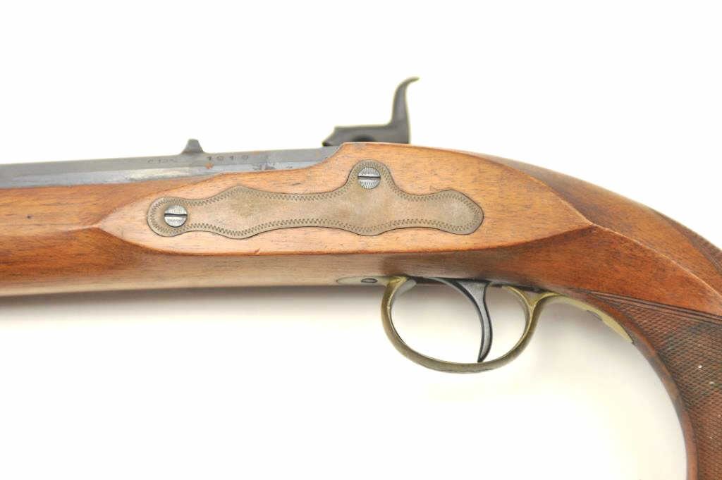 Full stock percussion American 19th century style full stock pistol in 12mm caliber by Jukar of Spain, S/N 1010. Nicely engraved lock. Good quality checkered stock. Measures 16” overall with a 10” medium to heavy weight octagon barrel. Fine to excellent condition needing cleaning. (Percussion) Est.: $100-200