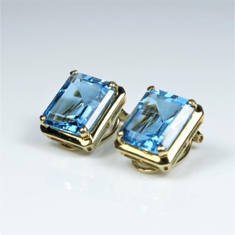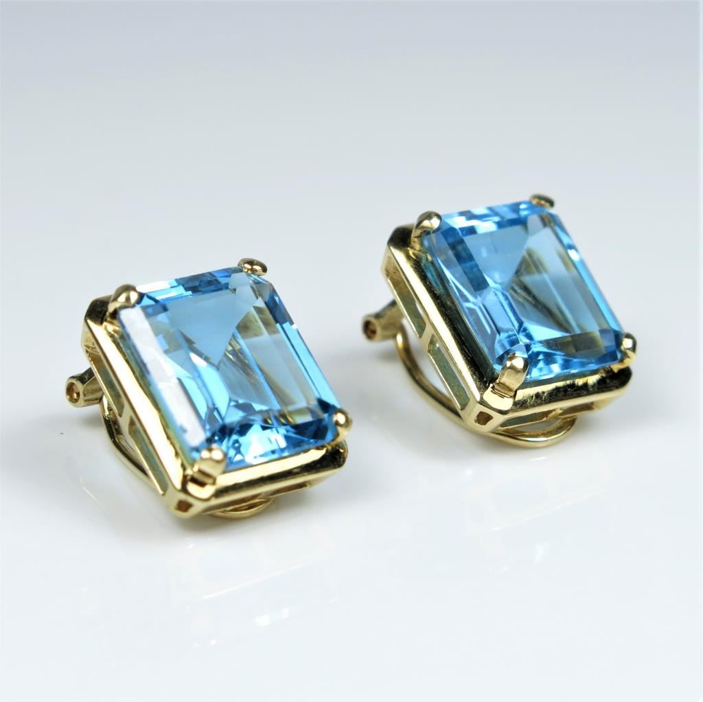 Stunning Swiss Blue Topaz and Diamond Earrings featuring 2 emerald cut Blue Topaz weighing approx. 10.00-12.00 carats total set in quality 14 karat yellow gold clip back earrings. Estimates $800-$1,200