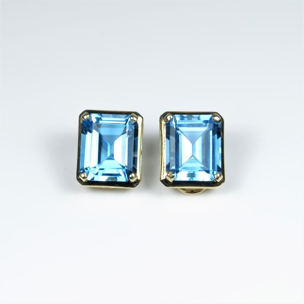 Lot 425a Stunning Swiss Blue Topaz and Diamond Earrings featuring 2 emerald cut Blue Topaz weighing approx.