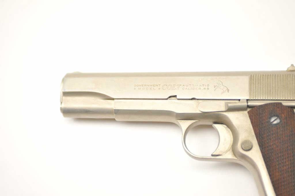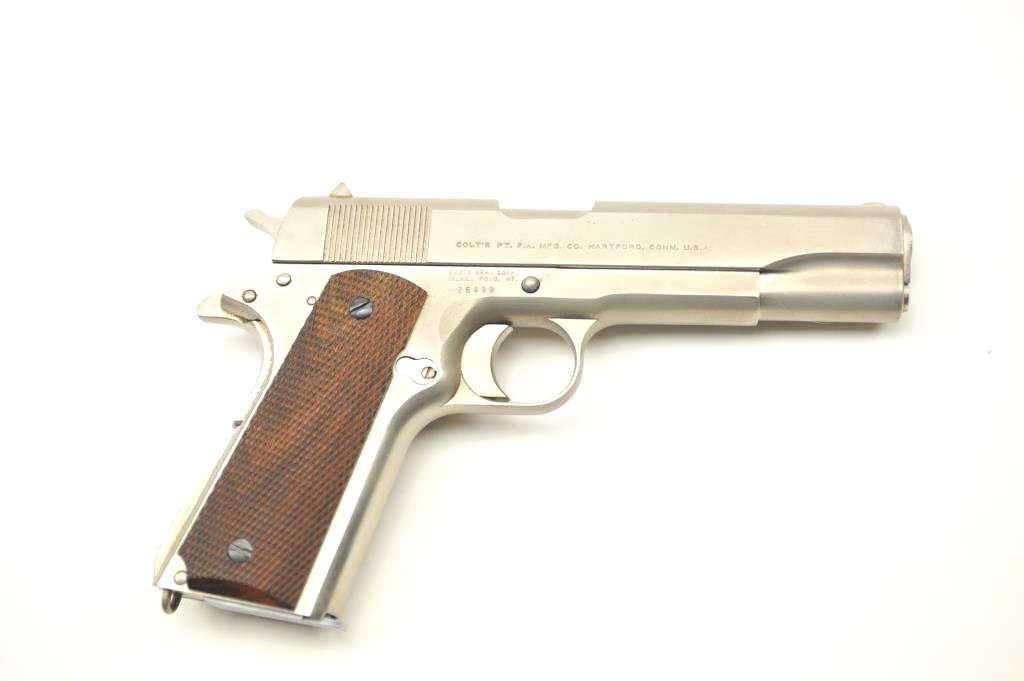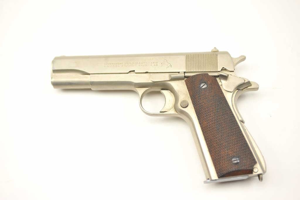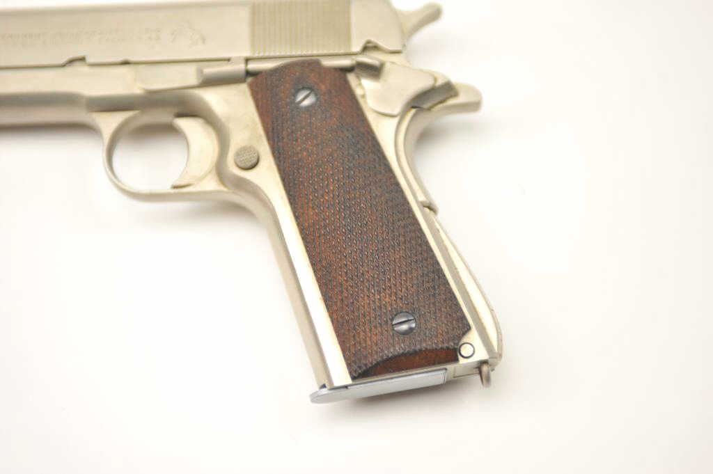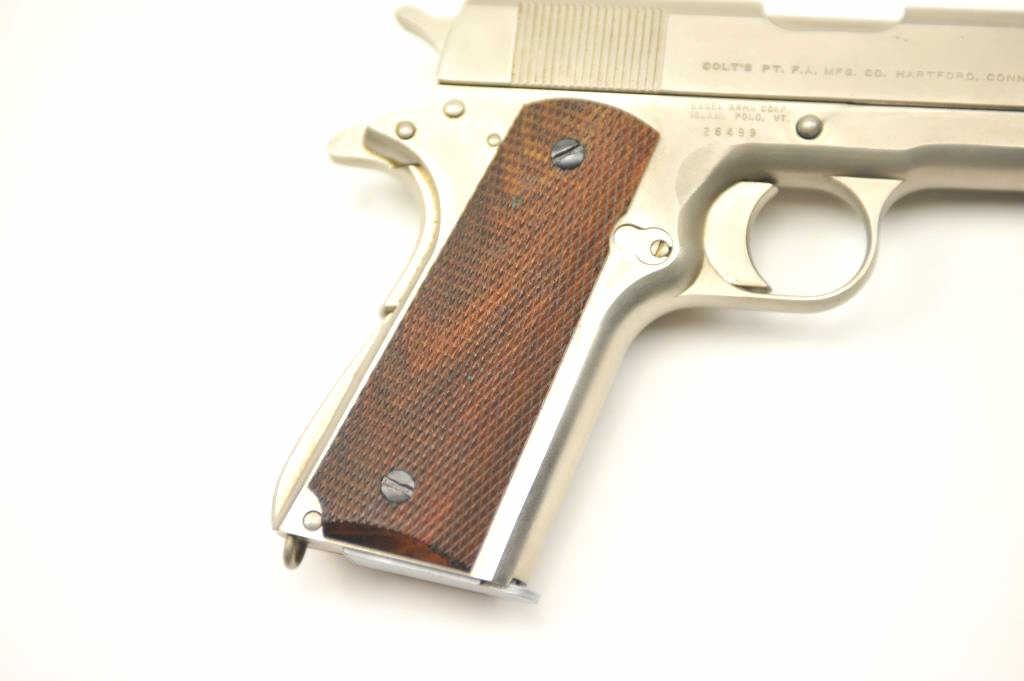 Custom 1911A1 Semi-Auto Pistol in .45 ACP caliber showing Colt Government model slide on Essex steel frame, S/N 26499. Hard chrome or satin nickel finish and checkered wood grips. A good quality build up to factory ormilitary standards with commercial after market barrel and parts. Military type trigger pull. Very good plus with minor toning to finish that would polish or clean up. (Modern/PPT) Est.: $400-$800