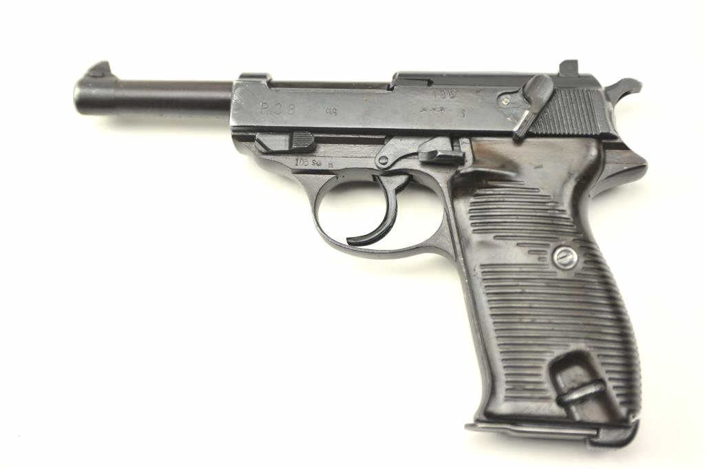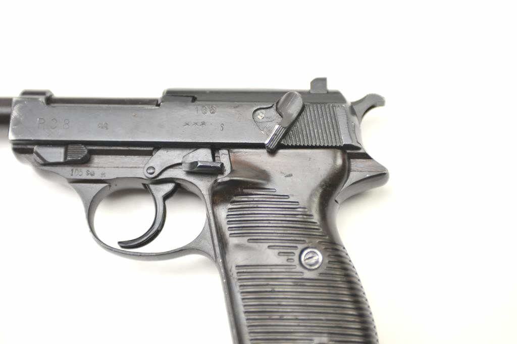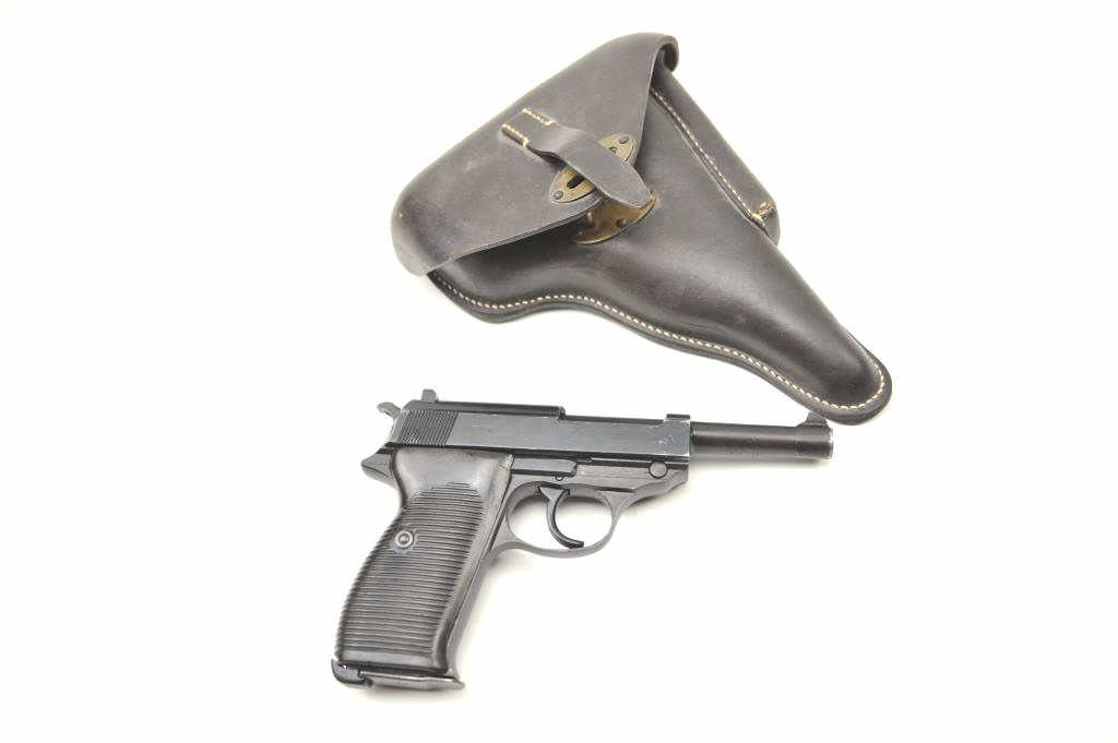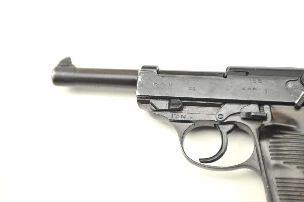 P.38 9mm German military issue by CYQ (Spreewerk) marking along with post war “S” marking and number 106 on the left of the slide. Import marked with good reproduction holster and extra mag. Bright bore and goodmechanically. (C&R/PPT) Est.: $300-$600