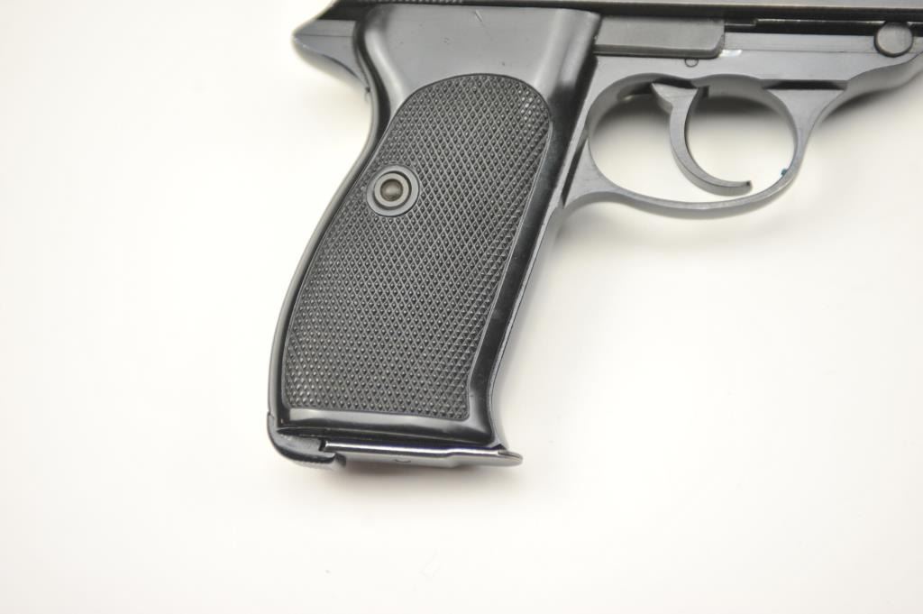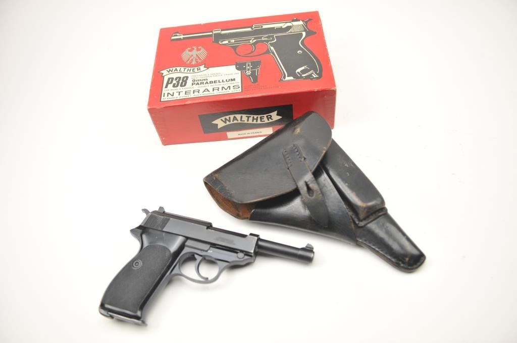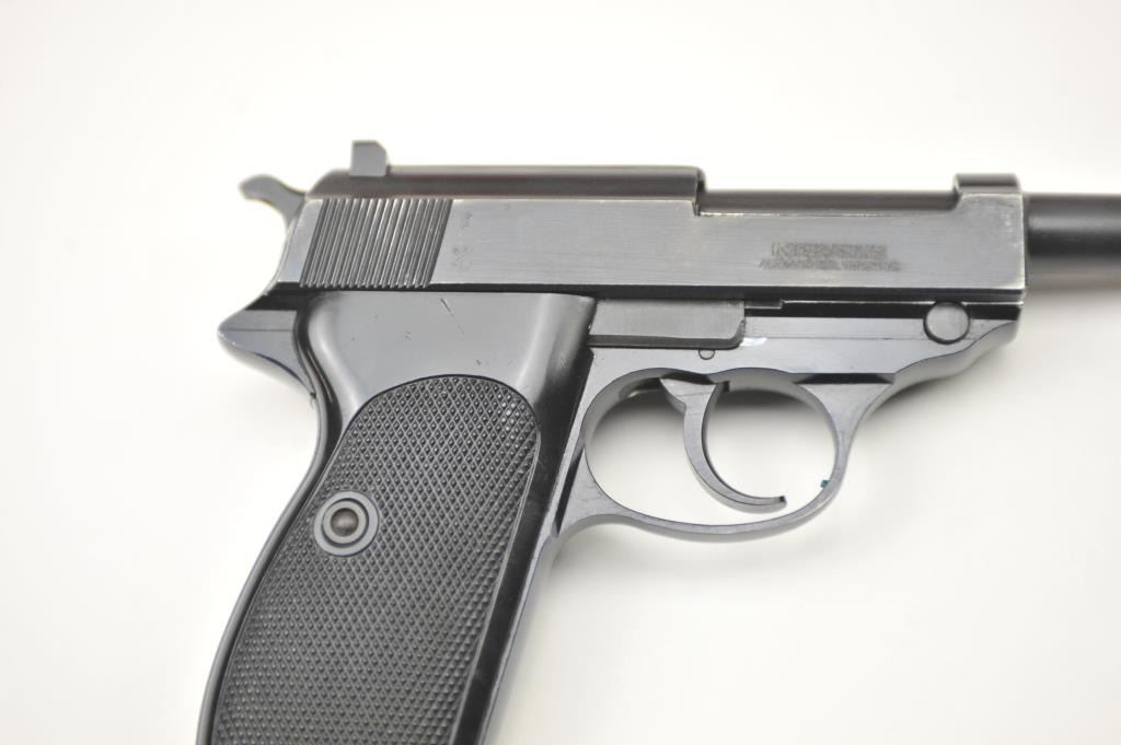 Manurhin P1 Semi-Auto pistol in 9x19 mm caliber (West German police trade in) with military style 1963 dated holster and extra mag in Interarms box. Made in France on Walther machinery. Very good plus usedcondition. 80%-90% dull military finish with good grips and bright bore that is very good to fine. Going up in price and drying up. (Modern/PPT) Est.: $250-$500