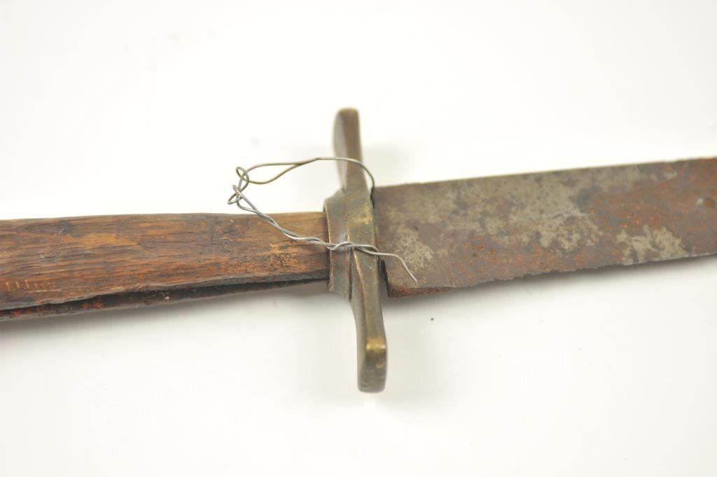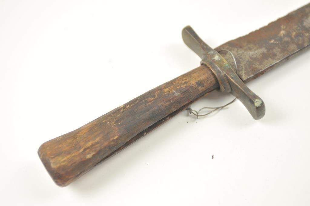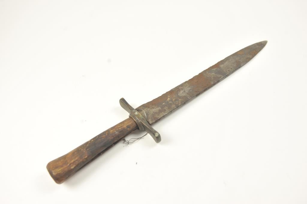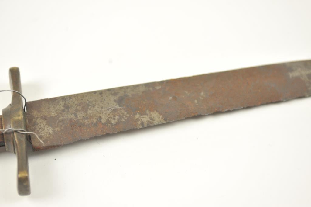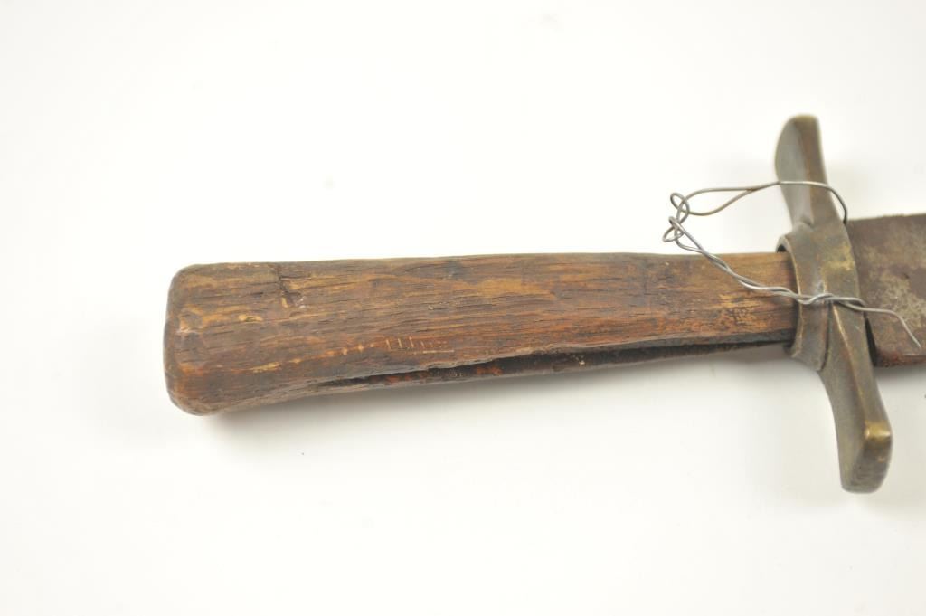Relic condition original Rifleman’s knife with the hilt and grip altered during use. No blade marks with “W.D.” on the guard. A very cool U.S. issue and frontier re-tasked knife or Bowie. Est.: $500-$1,000.