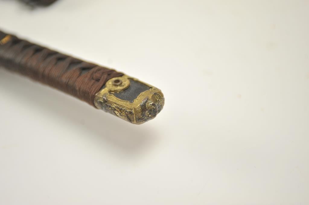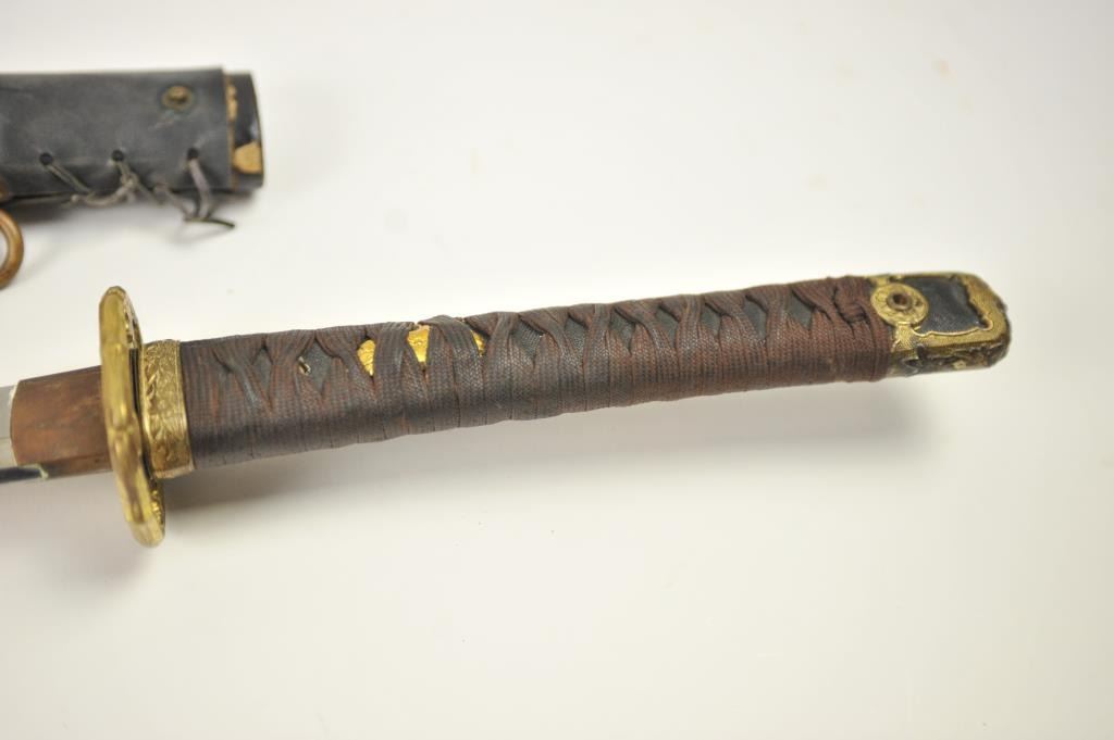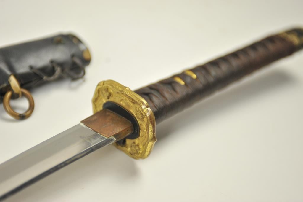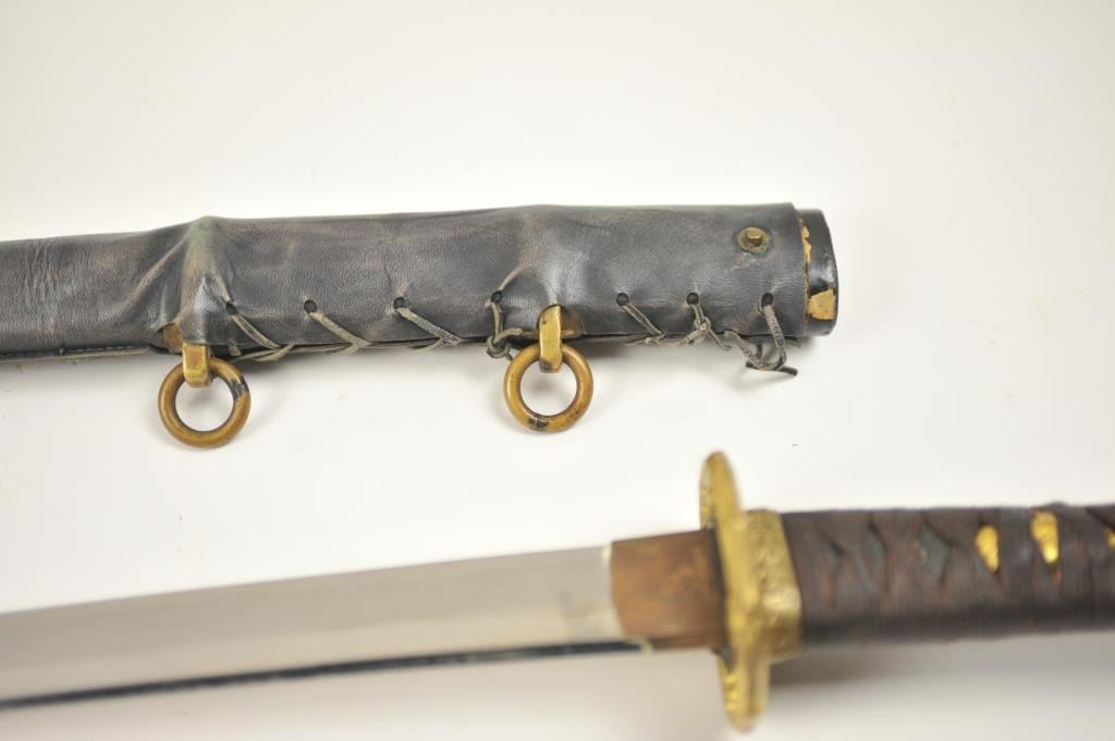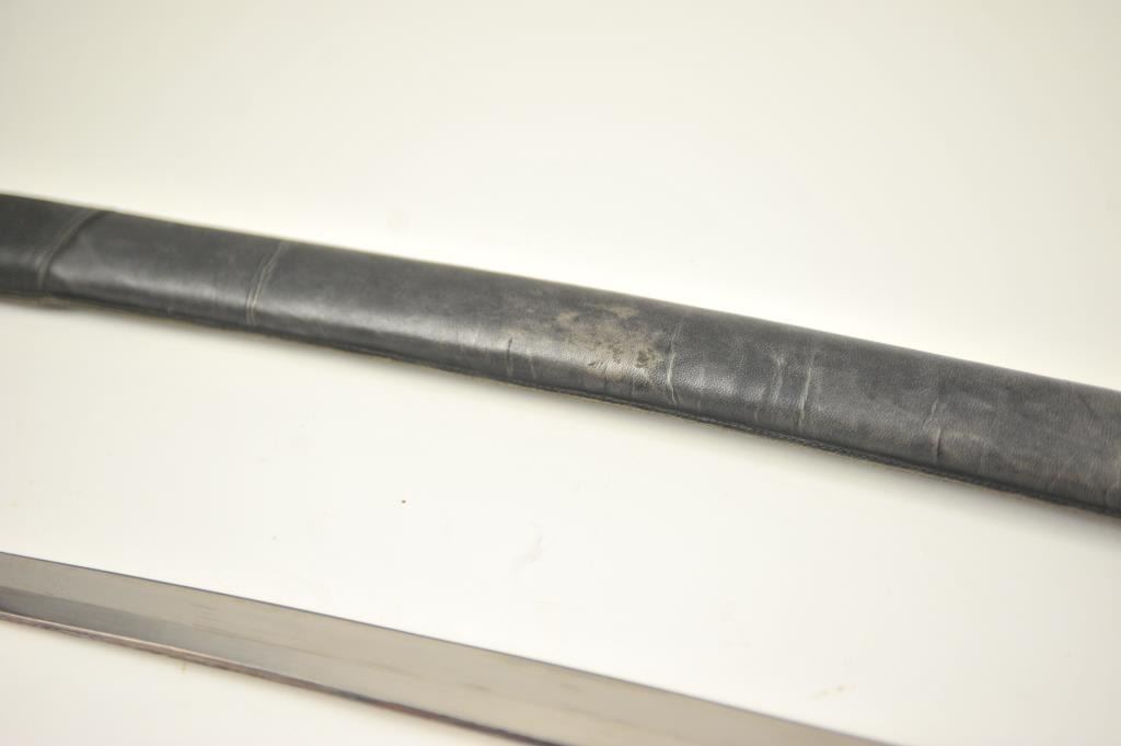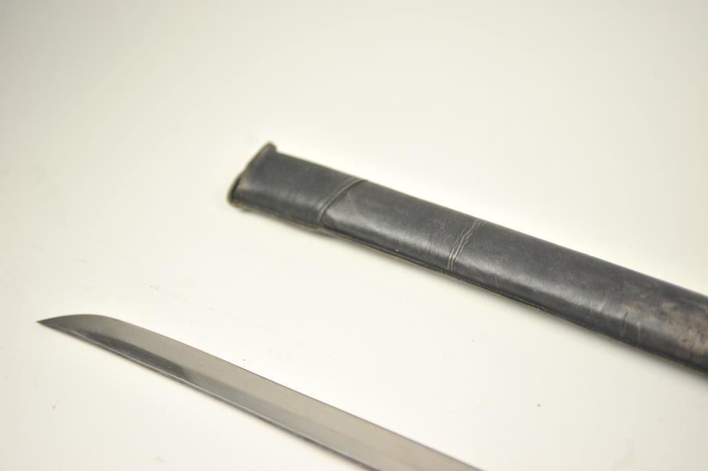 Japanese naval style mounted Samurai sword with signed blade, army tsuba and leather covering on the scabbard. The katana size blade measures 26 ½” and temper to the tip. The blade has been over cleaned with somescabbard scratches. The blade is somewhat light with nice curve. Mounts are good to very good. Est.: $400-$800