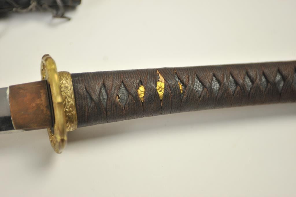 Lot 520 Japanese naval style mounted Samurai sword with signed blade, army tsuba and leather covering on t
