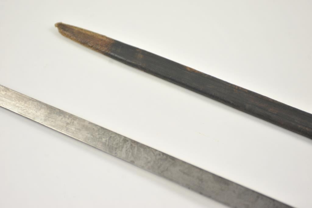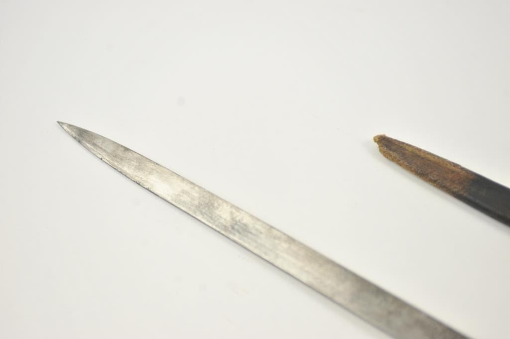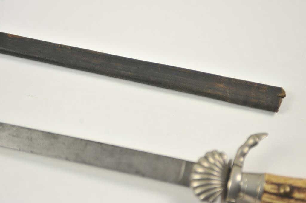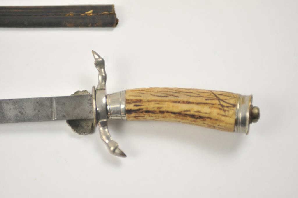 German stag gripped hunting dagger Hirschfanger with etched blade. Late 19th to early 20th century. The blade measures 18 ½”. Silvered shell guard and deer foot cross guard. The blade is etched throughout most of its length but etching is worn and the blade is stained. A classic German “Deer catcher”. Has a fragment of its original scabbard. Est.: $200-$400