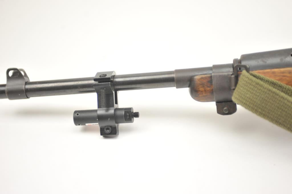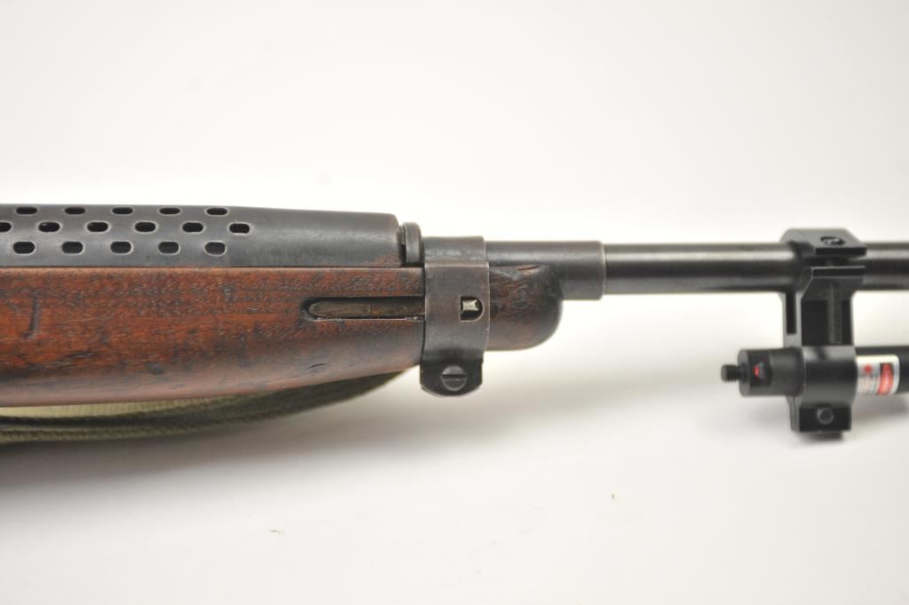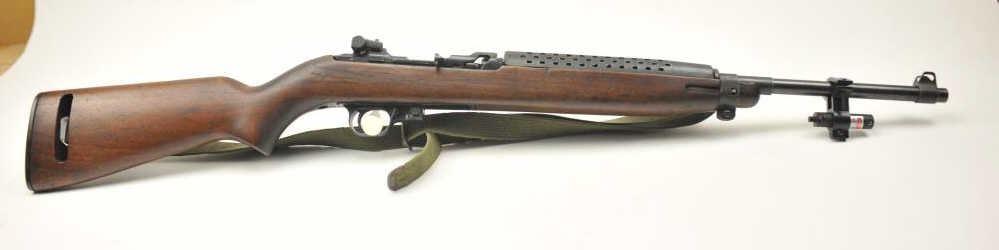 Universal M1 semi-automatic carbine, .30 caliber, Serial #197215. The carbine is in very good overall condition with an 18” barrel with a ventilated steel handguard and a red dot sight added at the muzzle. Thecarbine retains the majority of the blue finish with wear consistent with carry and use. The smooth wood stock with dents from carry and use. The lot includes a canvas OD green sling with the oiler. The bore is good and the action is crisp. The lot includes three correct magazines and a copy of the U. S. Army Basic Field manual dated 1942. One of the magazines is high capacity and is not available to California residents or whereprohibited. Est.: $300-$600. (Modern).