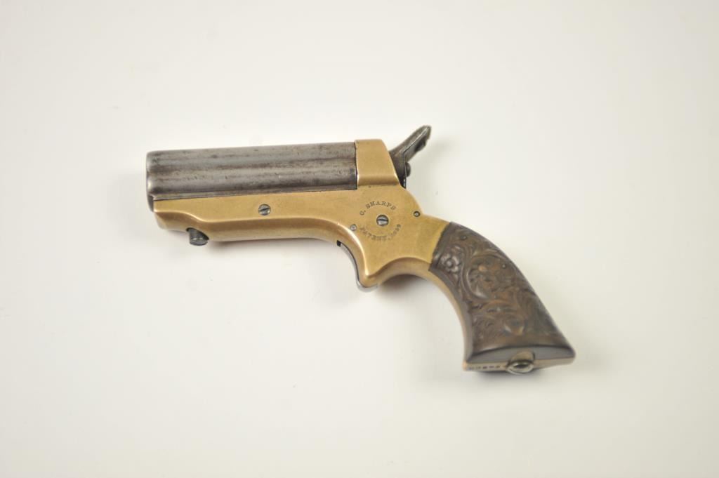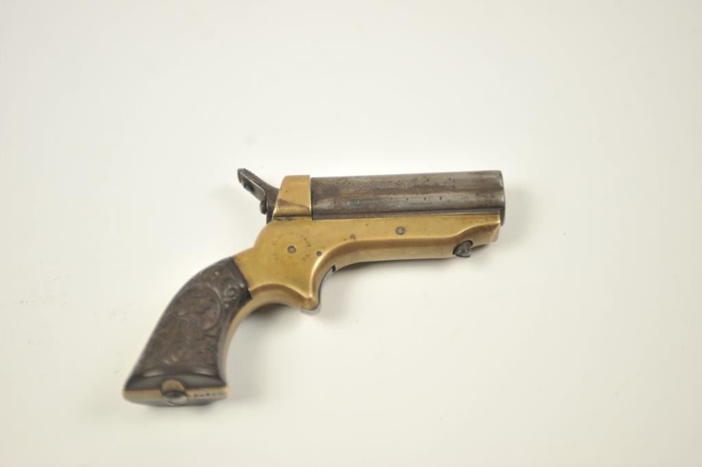 Sharps 4 shot derringer in .22 caliber with early forward release and floral gutta percha grips, S/N 29595. Made in Civil War era. Good markings and natural patina. Good grips. The action is tight and the hammer revolverproperly. Above average overall. (Antique) Est.: $300-$600