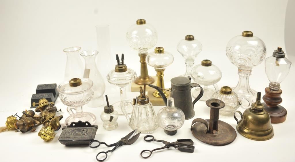 Lot of 19th century (whale) oil lamps and accessories from the Colonial period to the 19th century. Est.: $350-$700.