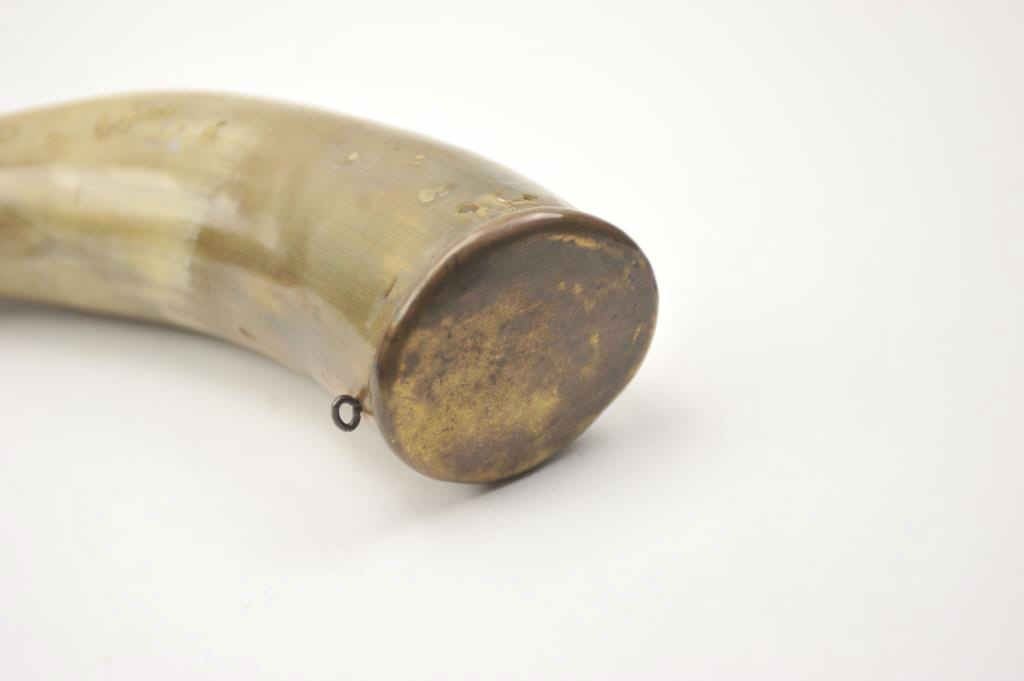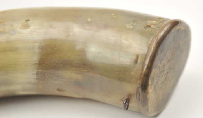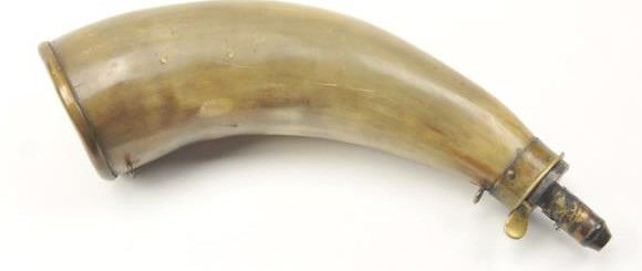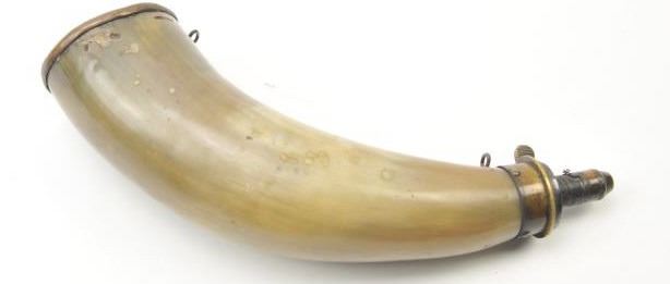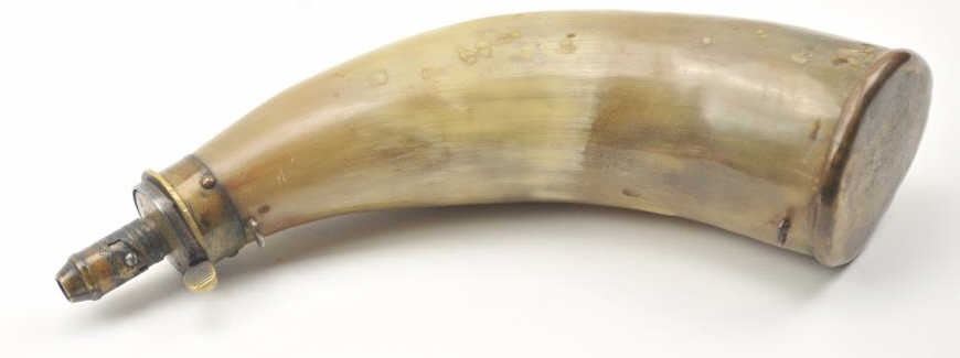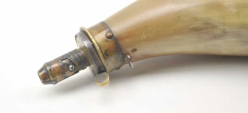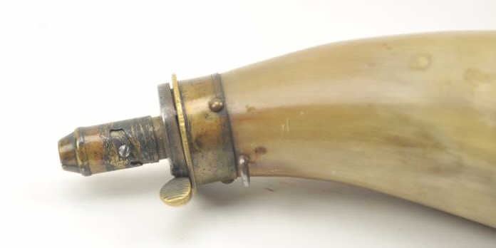 Lot 554 A large 19th century American or English powder horn with Dixon adjustable charger. Brass plug. Me
