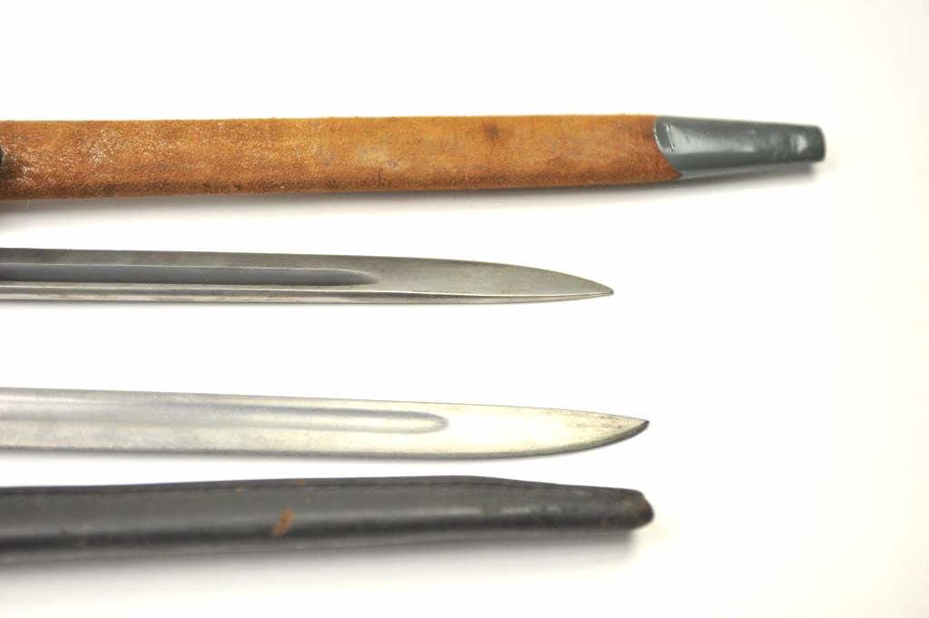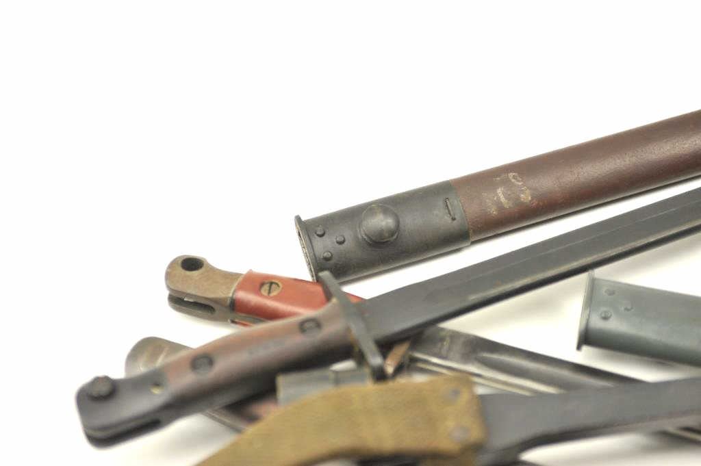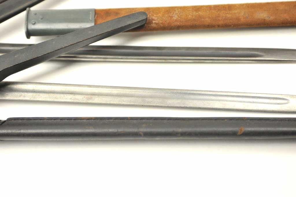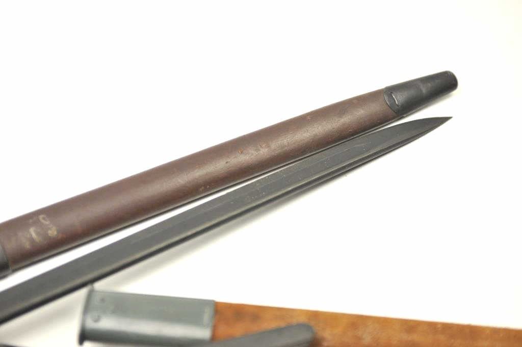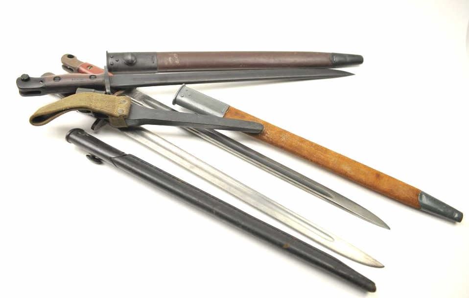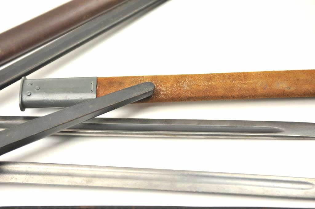 Lot of 4 Englis bayonets with scabbards as described: 1. 12-42 Broadhead Stamped bayonet. No tip. Fair condition 2. M-A-1904-42 rework XMA. Fine asrefurbished 3. Spike bayonet No. 4 MK II with scabbard and web hanger. Very good condition 4. Lithgow 1916 bayonet with replaced composite grip. Grey metal and brownscabbard. Very good condition. Est.: $150-$300