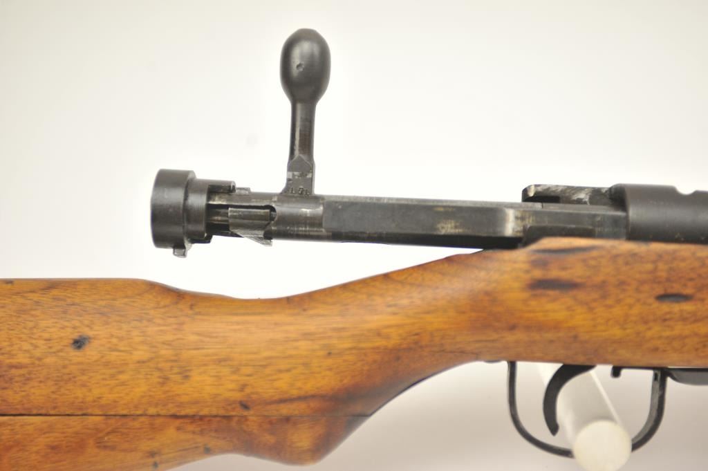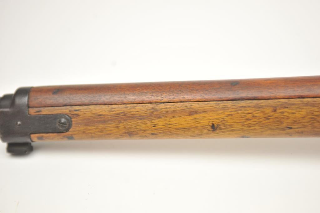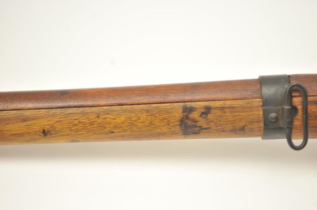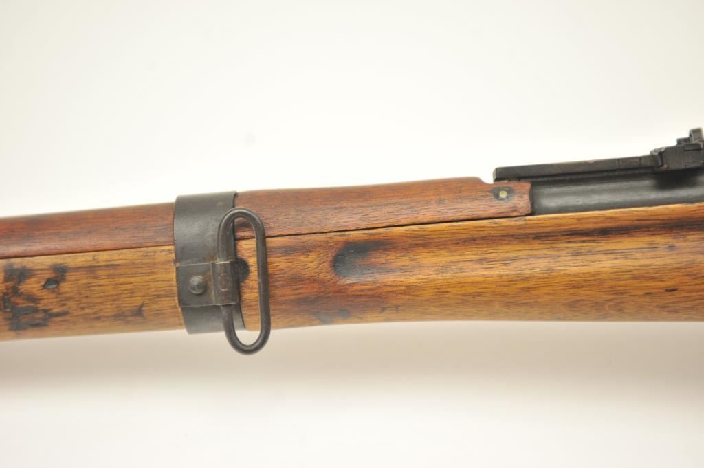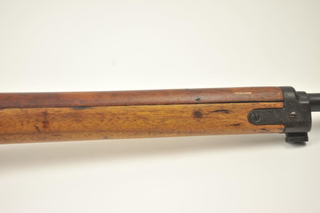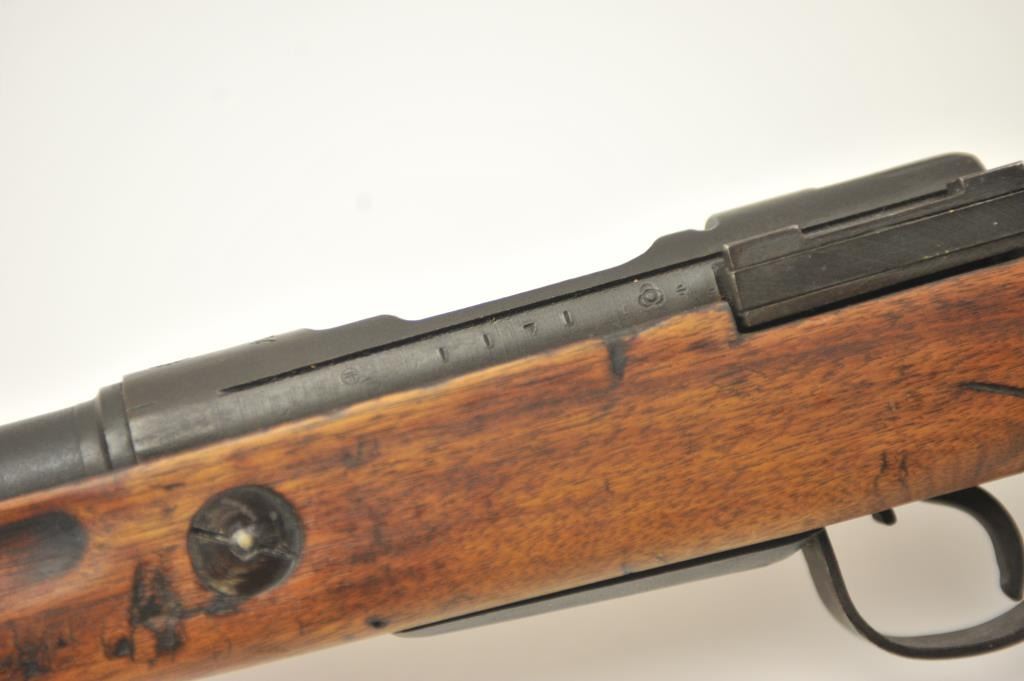 Japanese Arisaka Type 99 bolt action rifle, 7.7 Japanese caliber, Serial #1171. The rifle is in good overall condition with a 26” barrel with a blade front and aircraft style rear sight missing the aircraft wings. Themetal surfaces have gone to brown patina. The barrel has the Tokyo Arsenal mark on the rail and the mum is retained. The smooth wood stock is in good condition with mars and bruises. The bore is fair and the actionworks. Est.: $150-$300. (C+R).