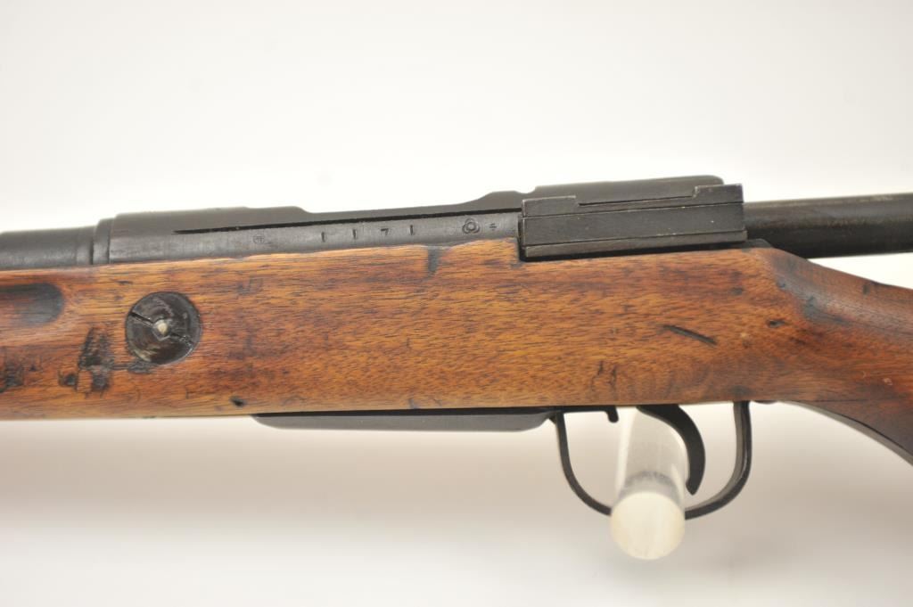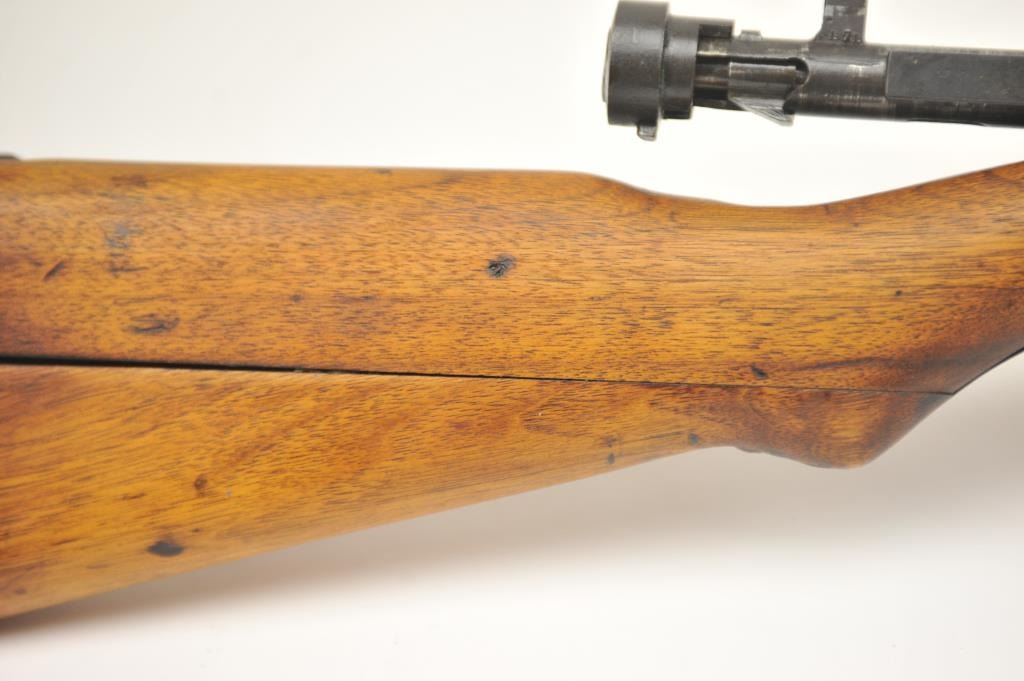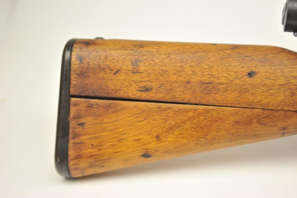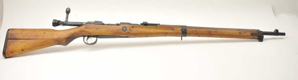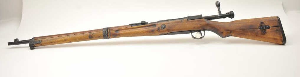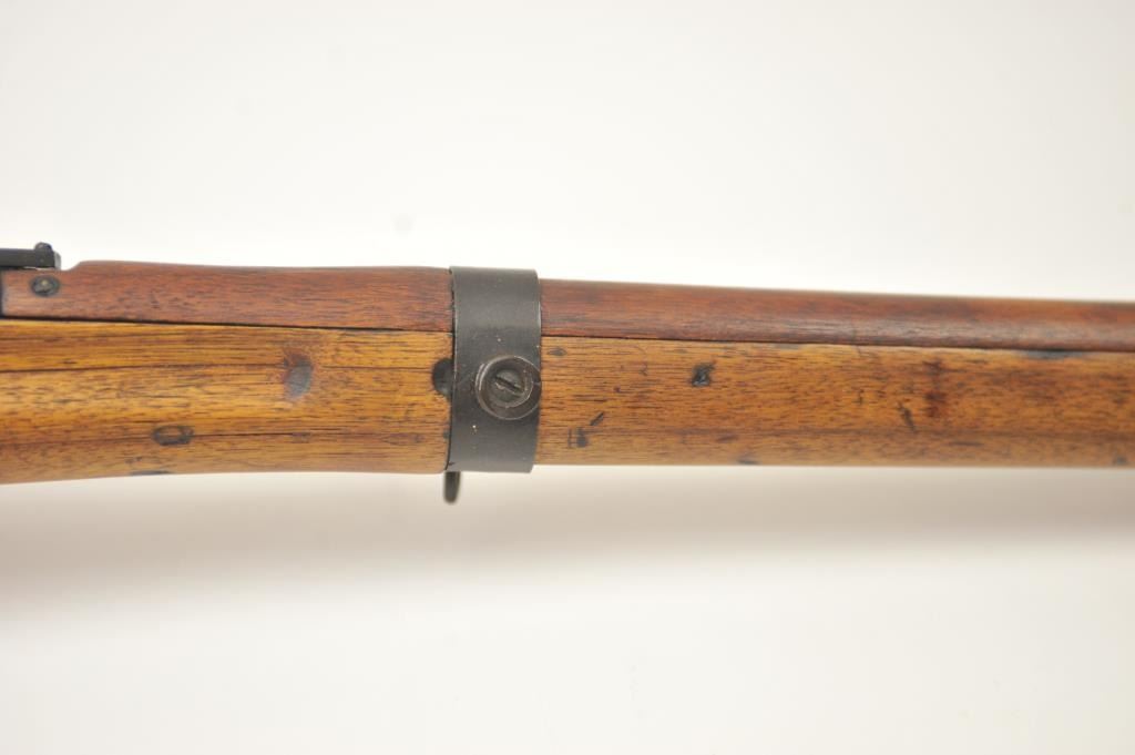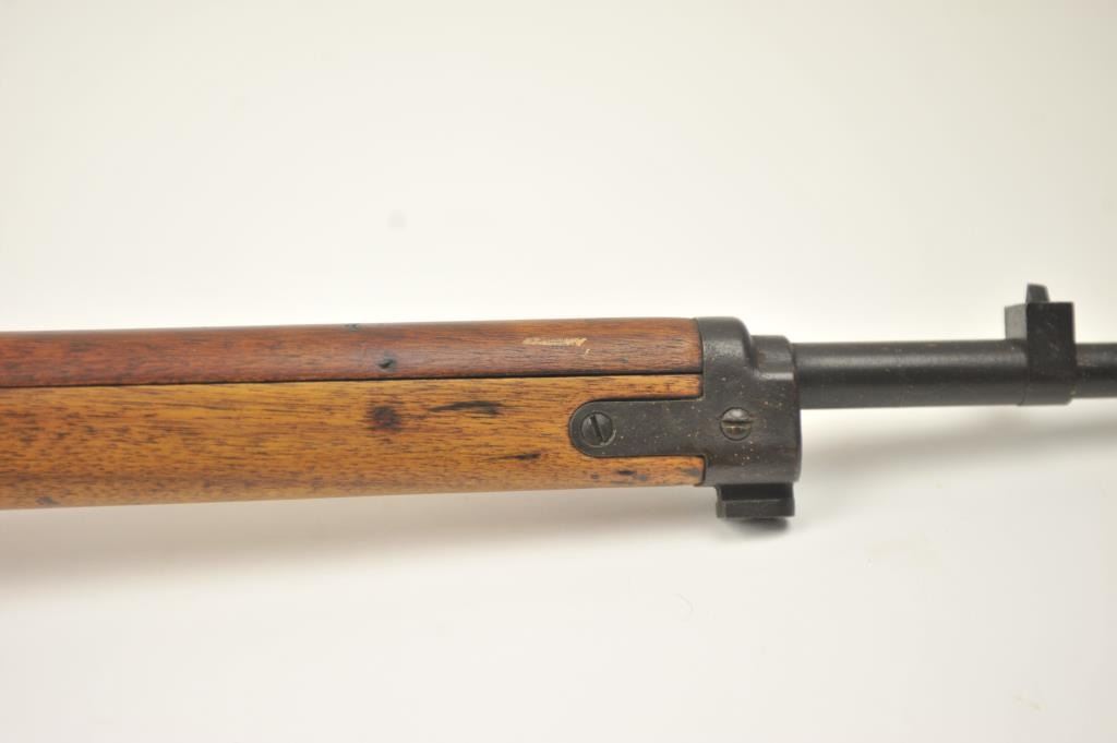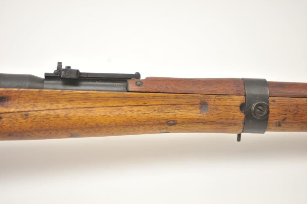 Japanese Arisaka Type 99 bolt action rifle, 7.7 Japanese caliber, Serial #1171. The rifle is in good overall condition with a 26” barrel with a blade front and aircraft style rear sight missing the aircraft wings. Themetal surfaces have gone to brown patina. The barrel has the Tokyo Arsenal mark on the rail and the mum is retained. The smooth wood stock is in good condition with mars and bruises. The bore is fair and the actionworks. Est.: $150-$300. (C+R).