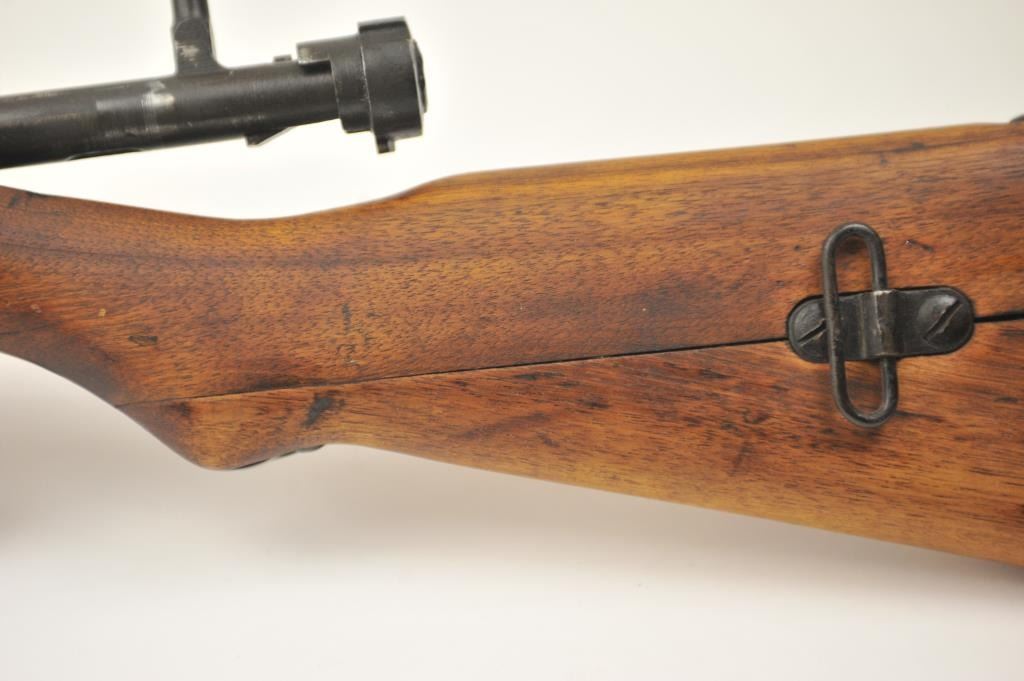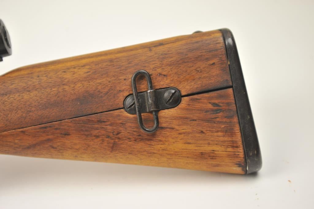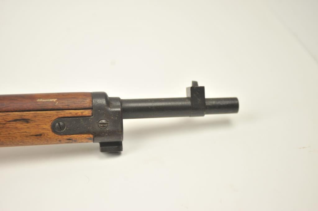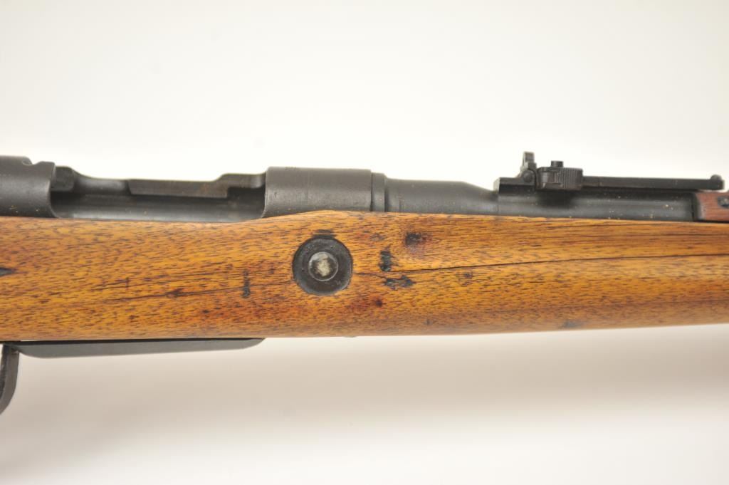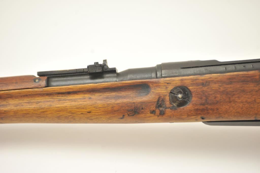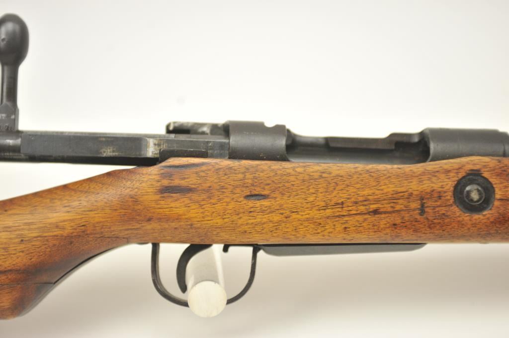 Japanese Arisaka Type 99 bolt action rifle, 7.7 Japanese caliber, Serial #1171. The rifle is in good overall condition with a 26” barrel with a blade front and aircraft style rear sight missing the aircraft wings. Themetal surfaces have gone to brown patina. The barrel has the Tokyo Arsenal mark on the rail and the mum is retained. The smooth wood stock is in good condition with mars and bruises. The bore is fair and the actionworks. Est.: $150-$300. (C+R).