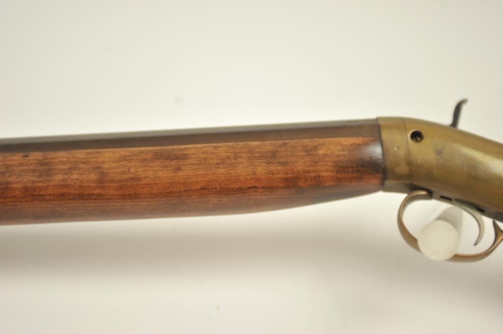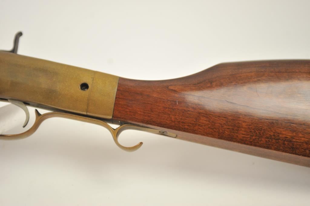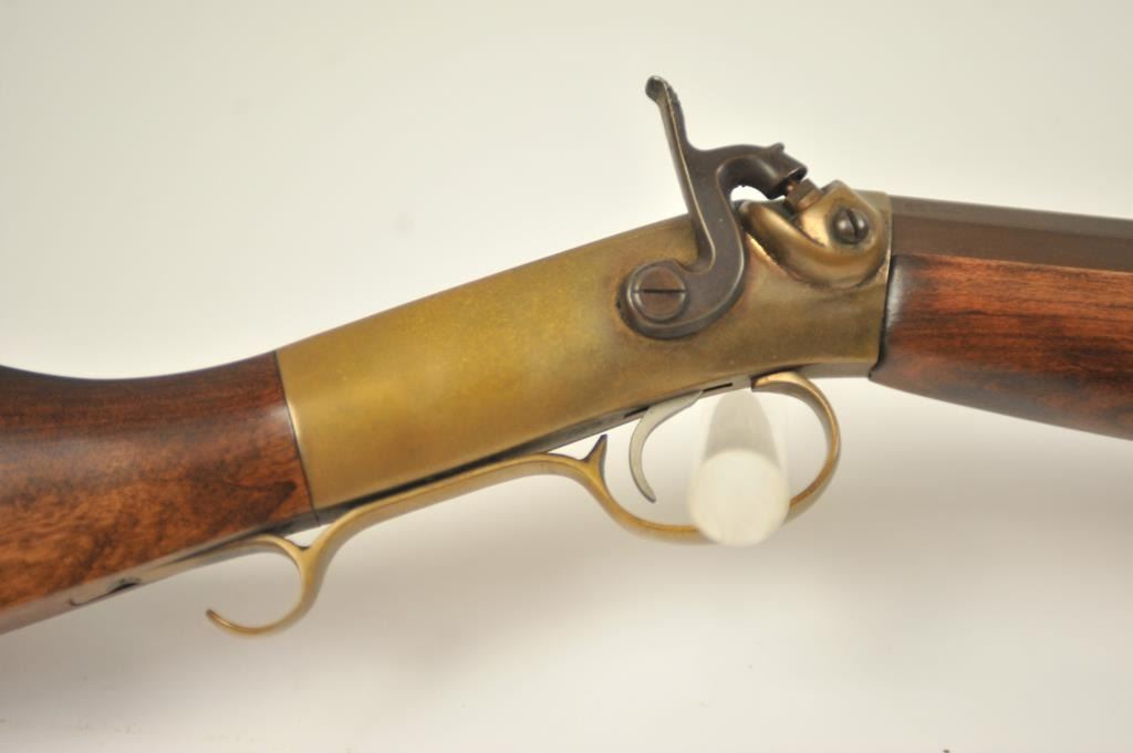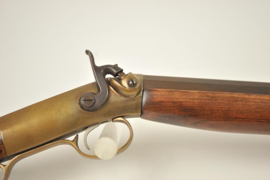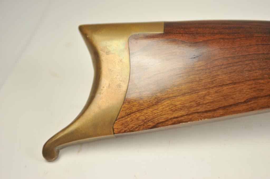 Mowrey Olney of Texas Bicenntenial Model reproduction brass single shot percussion rifle, .50 caliber, #1517 OF 5,000. The rifle is in fine overall condition with 32” octagon barrel with a brass knife blade front sight, brass tipped wooden ramrod, brass frame and trigger guard. The smooth wood stock is in very good condition with a brass schutzen style butt plate. Est.: Est.: $150-$300.
