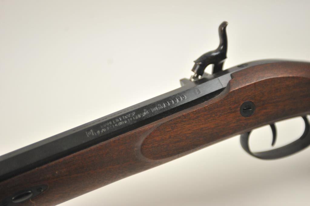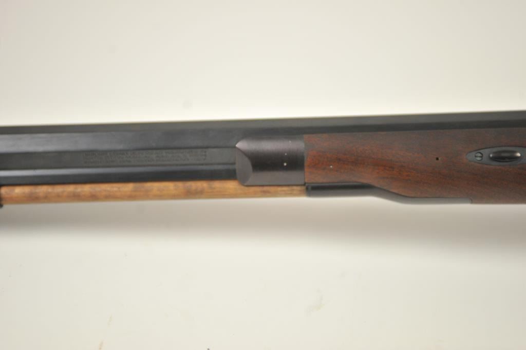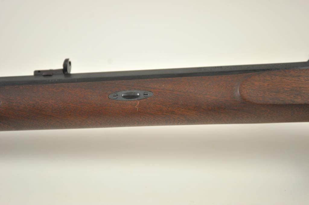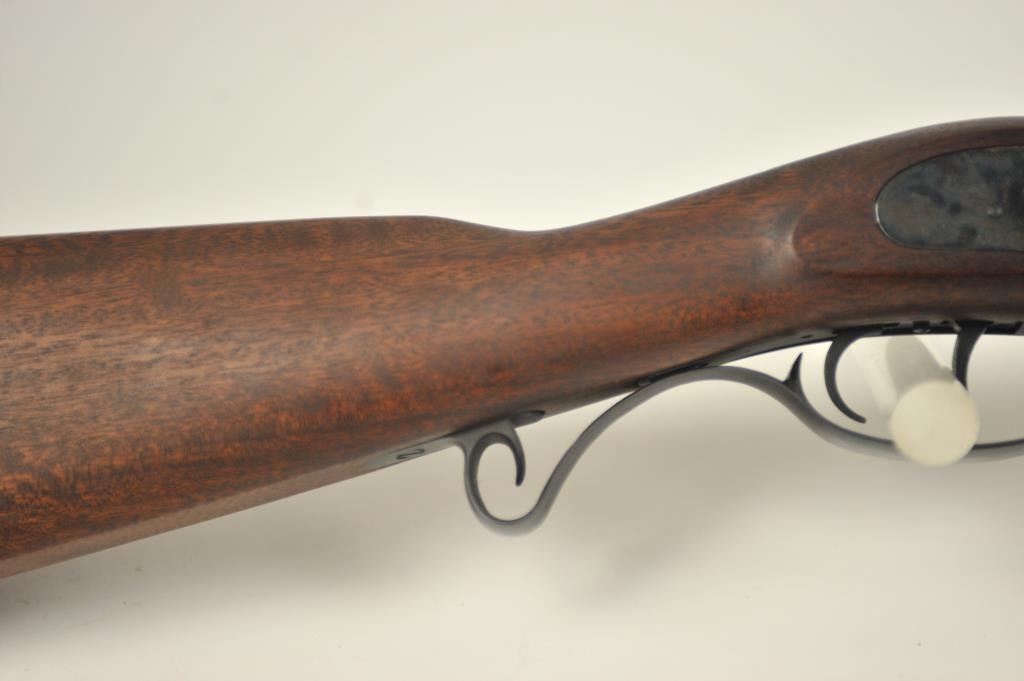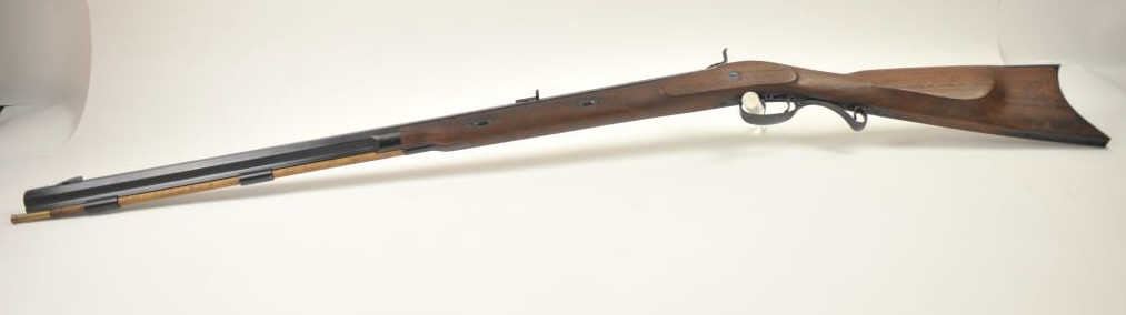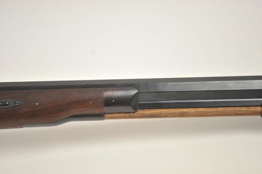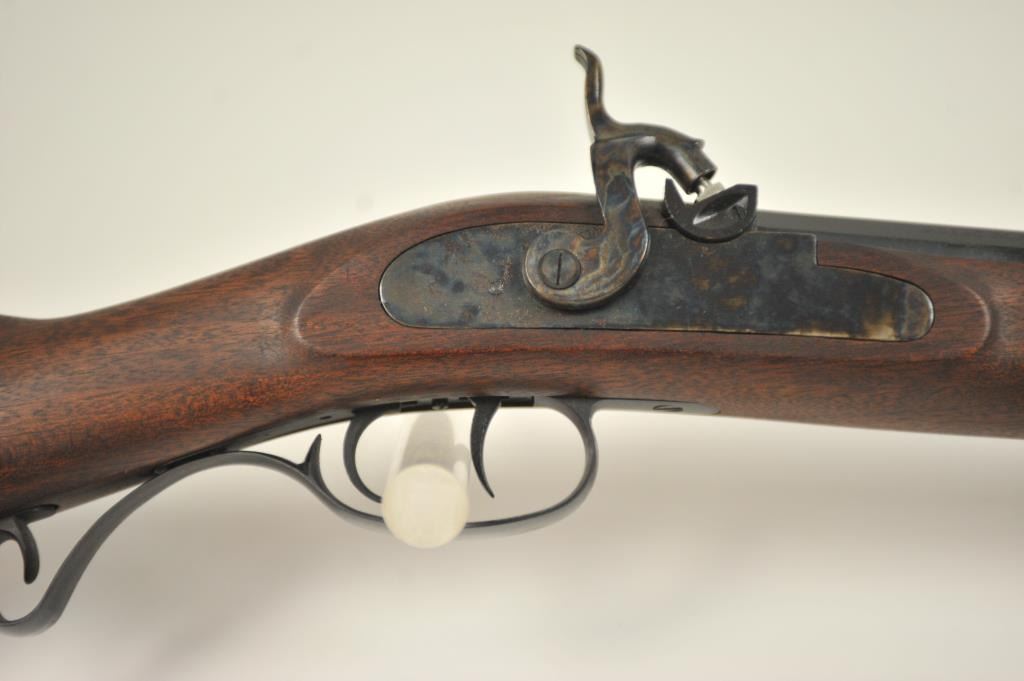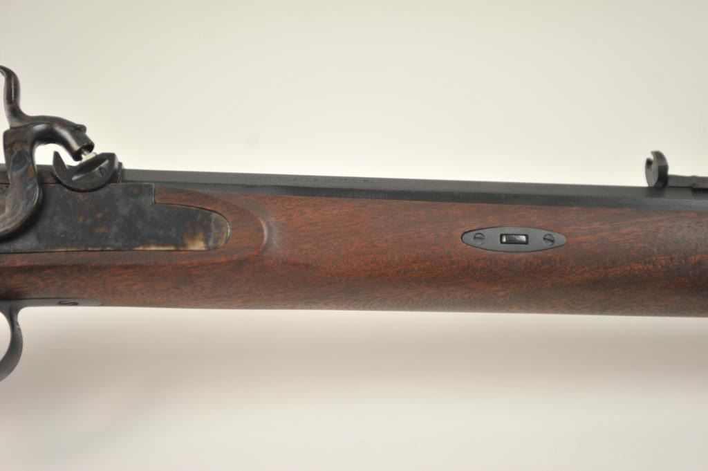 Lyman Reproduction Great Plains Model percussion rifle, .54 caliber, Serial #169090. The rifle is in nearly excellent overall condition with a 32” octagon barrel with a blade front and buckhorn rear sights. The rifle retains nearly all of the blue finish with sharp edges. The side plate is case colored. The smooth wood stock is in nearly excellent condition with a smooth steel crescent butt plate. Est.: $150-$300.