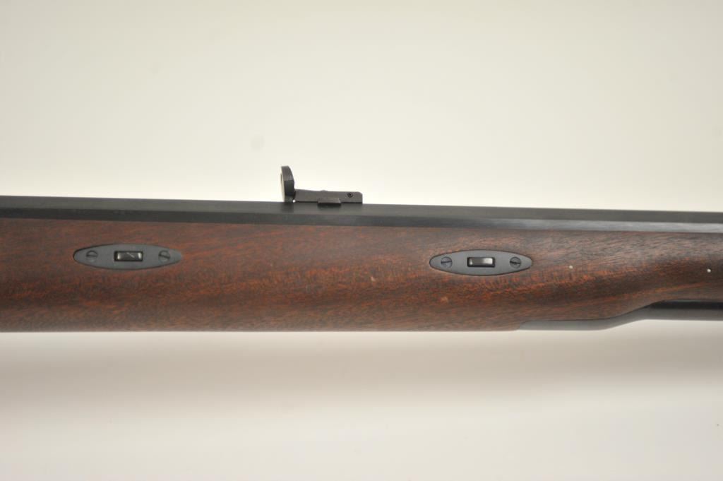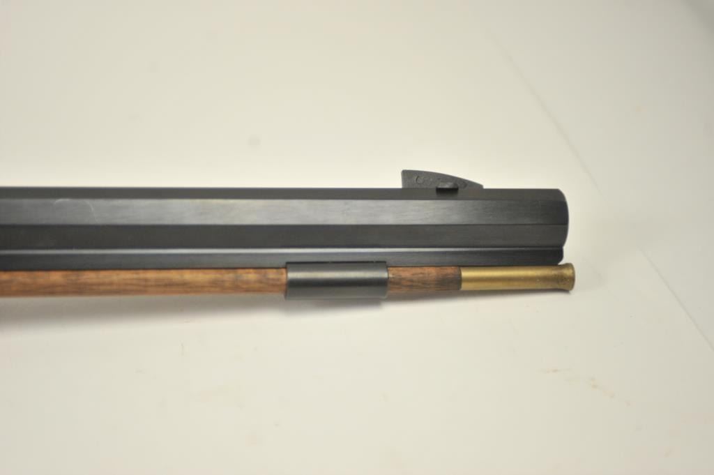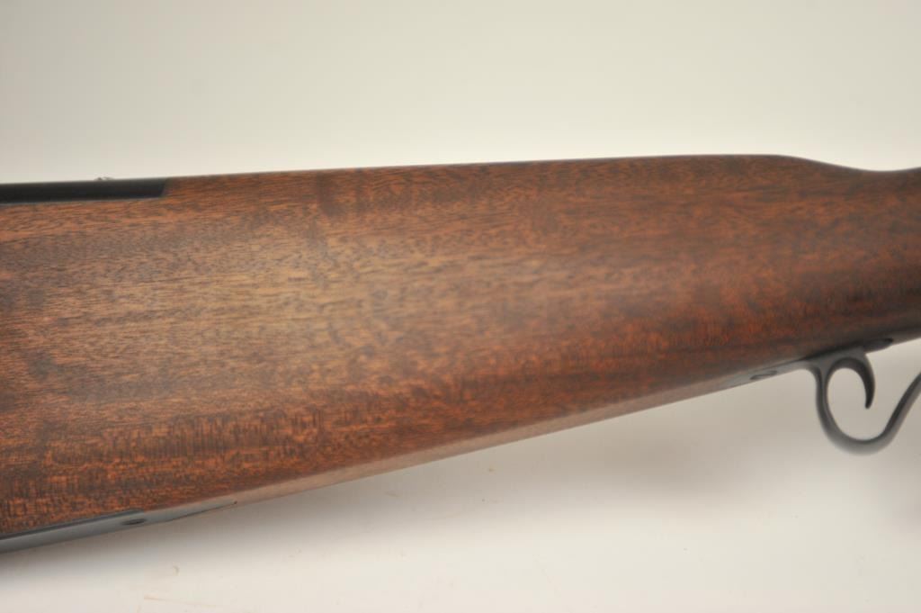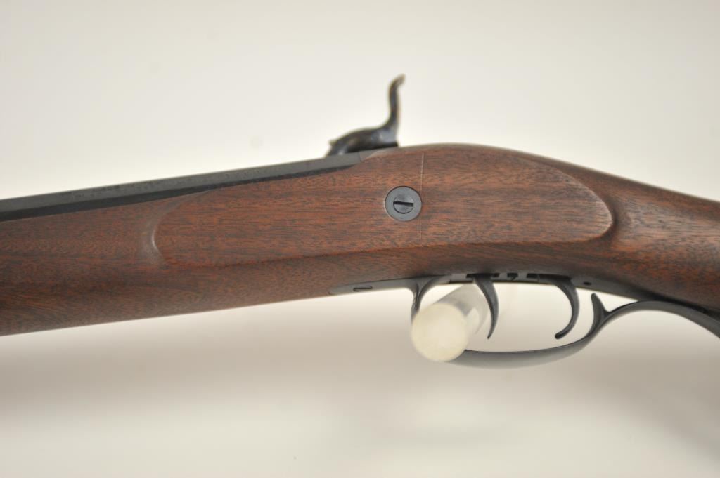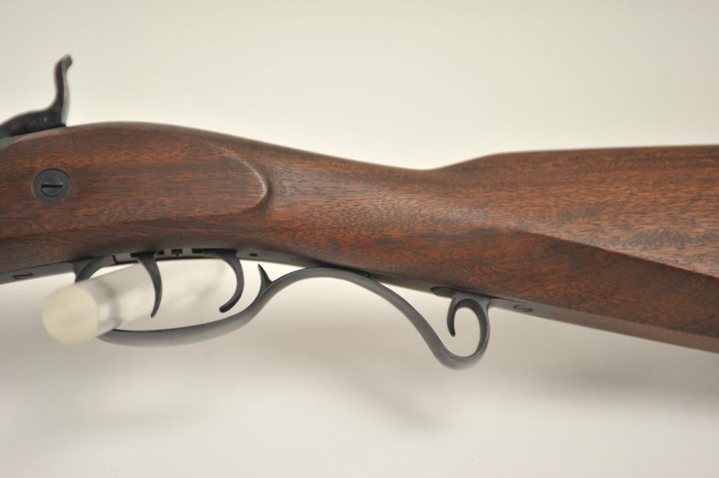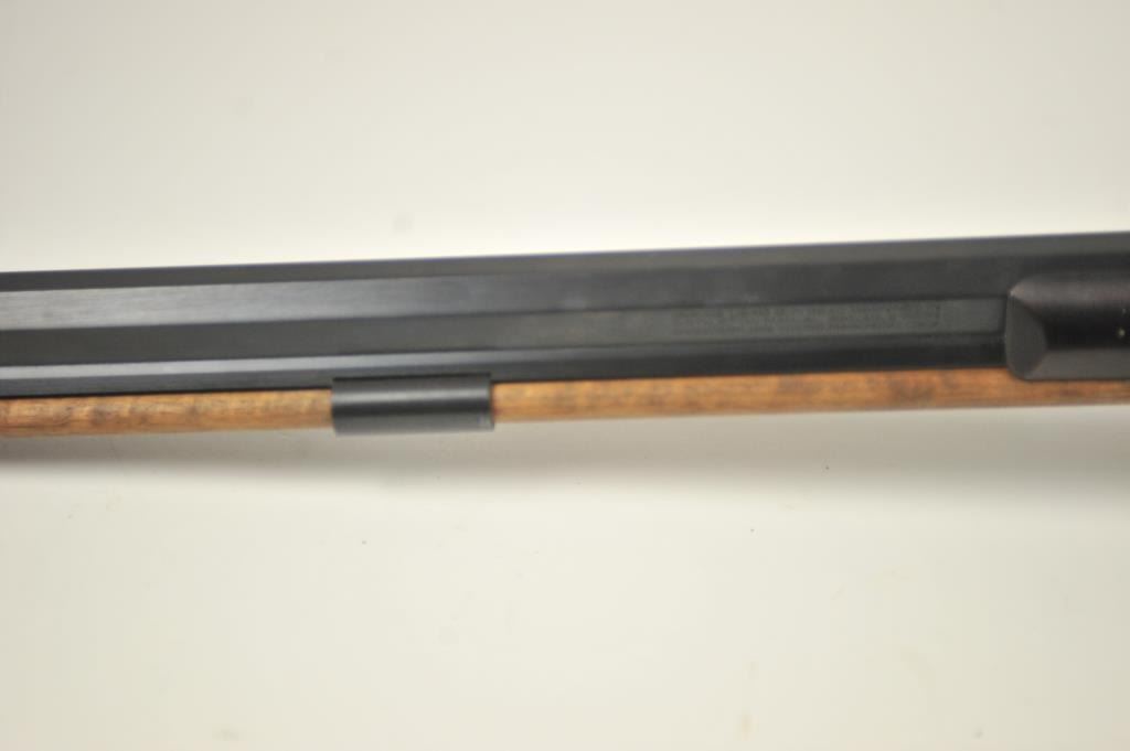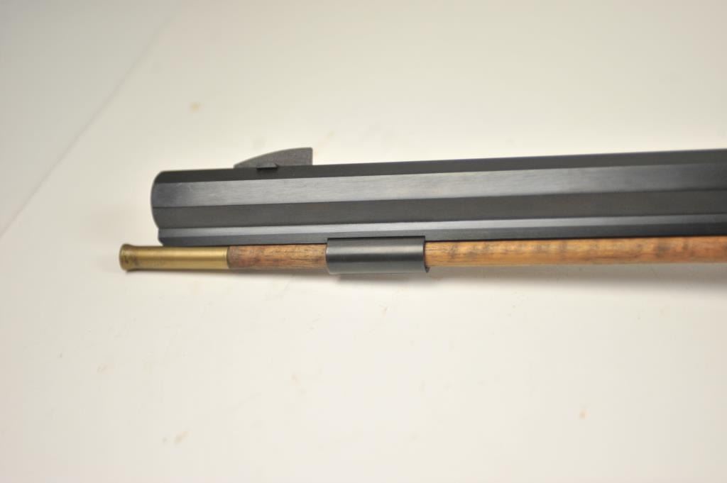 Lyman Reproduction Great Plains Model percussion rifle, .54 caliber, Serial #169090. The rifle is in nearly excellent overall condition with a 32” octagon barrel with a blade front and buckhorn rear sights. The rifle retains nearly all of the blue finish with sharp edges. The side plate is case colored. The smooth wood stock is in nearly excellent condition with a smooth steel crescent butt plate. Est.: $150-$300.