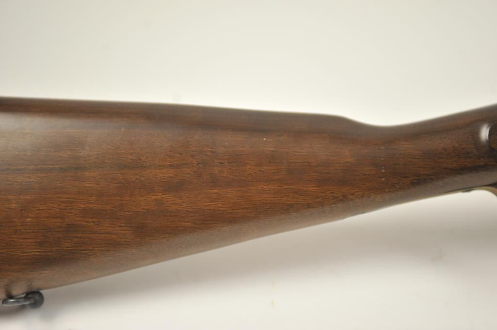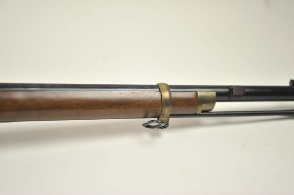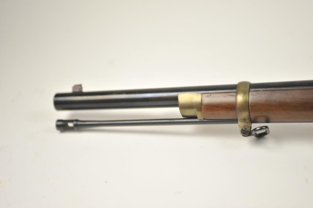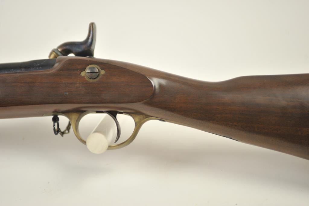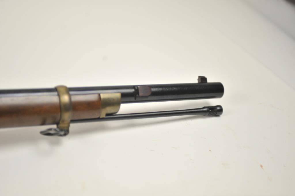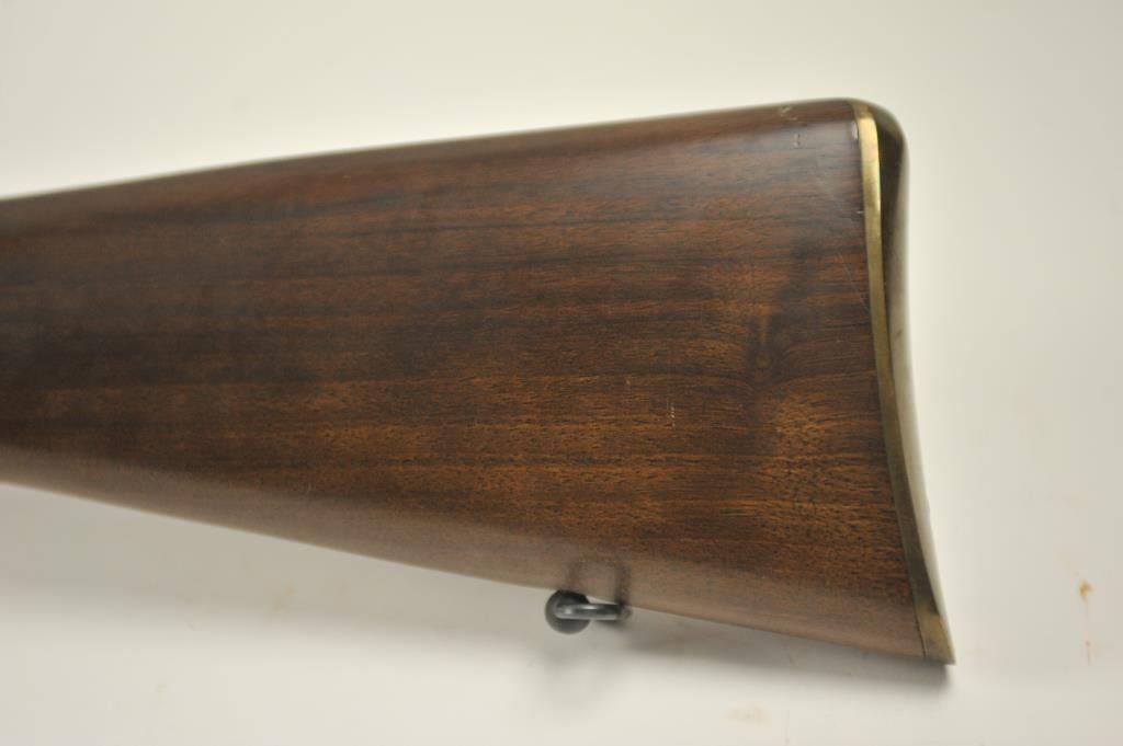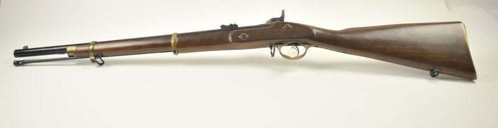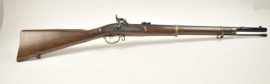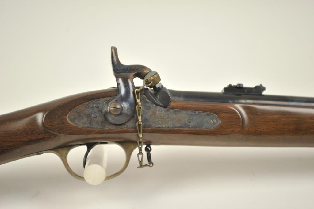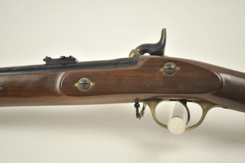Lyman Reproduction 1861 Enfield percussion carbine, .58 caliber, Serial #0743. The carbine is in fine overall condition with a 23” barrel with a ramped blade front and folding ladder style rear sights. The barrel retains nearly all of the blue finish with brass barrel bands and the side plate is case colored. The smooth wood stock is in very good condition. Est.: $250-$500.