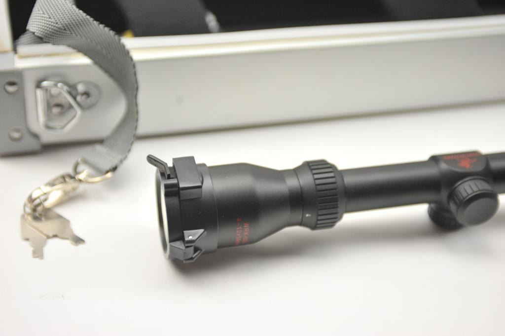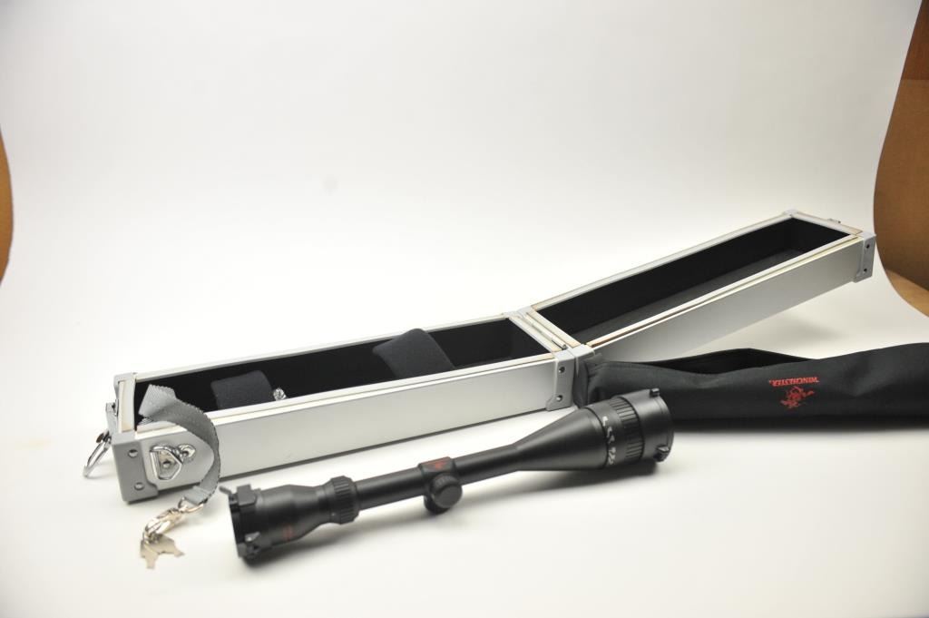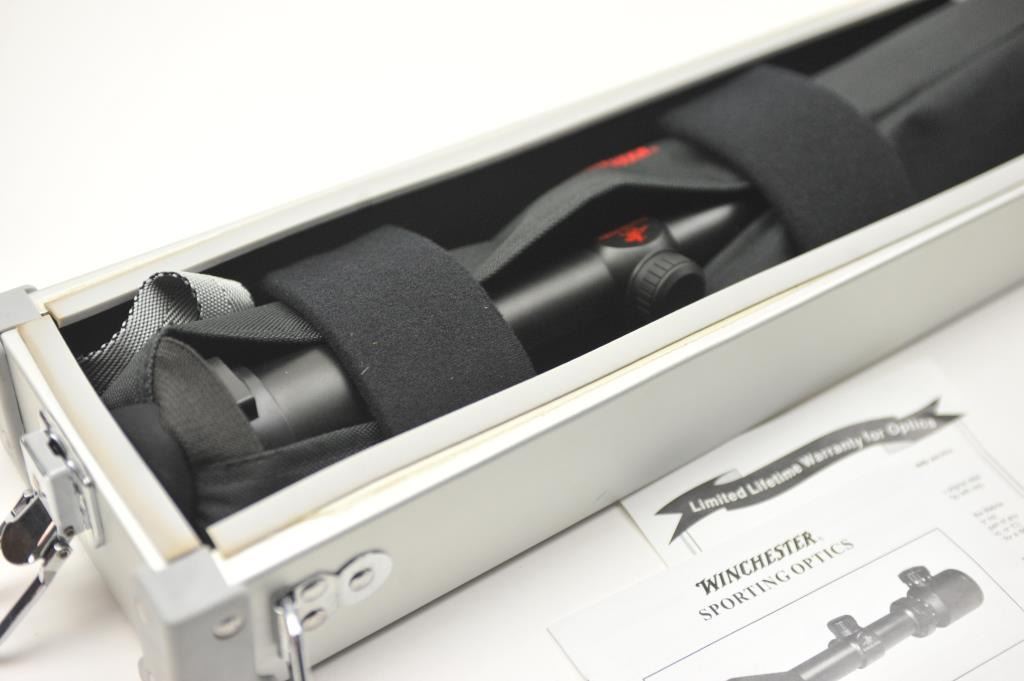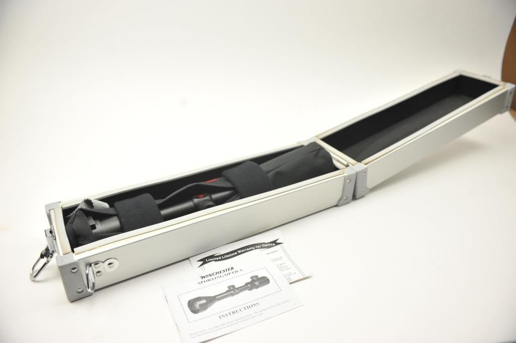 Winchester Model WRK-533 4 x 12 x 50 variable power scope with an adjustable objective. The scope is brand new in the factory Winchester marked aluminum case with flip down covers and scope case. Est.:$200-$400.