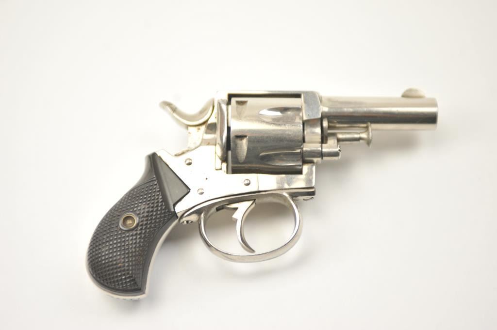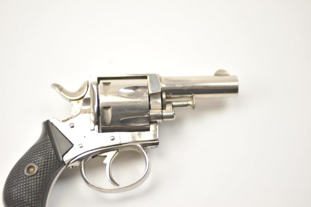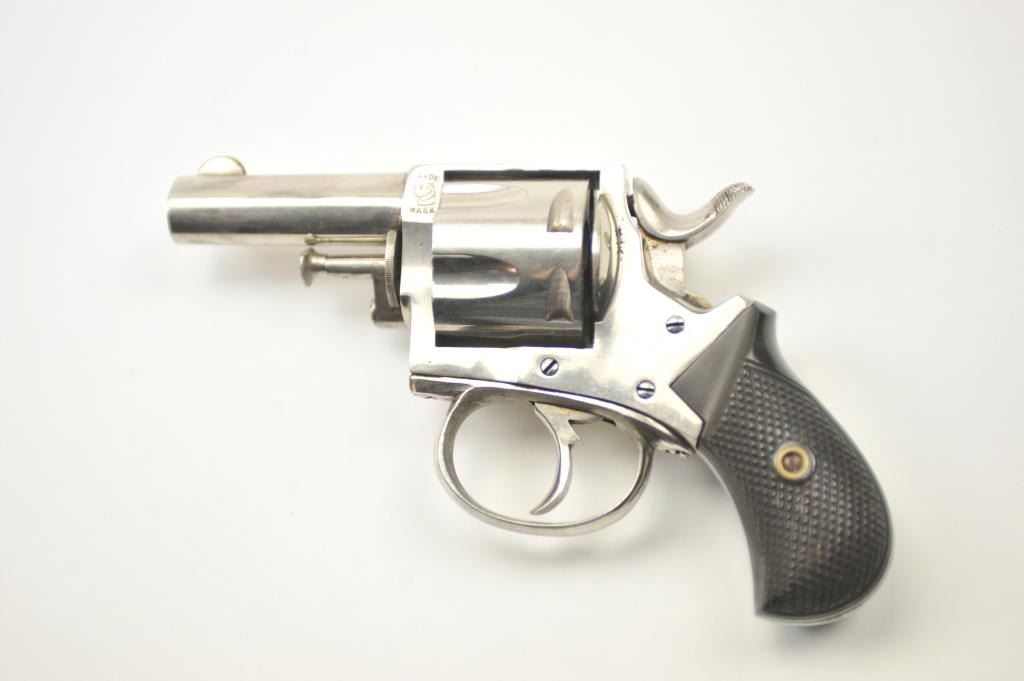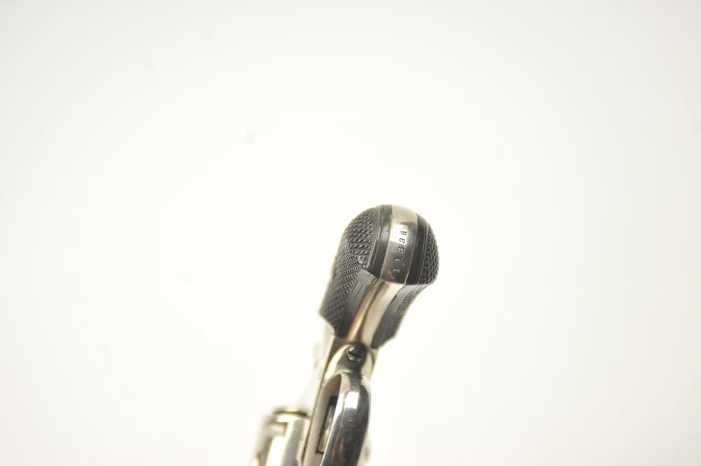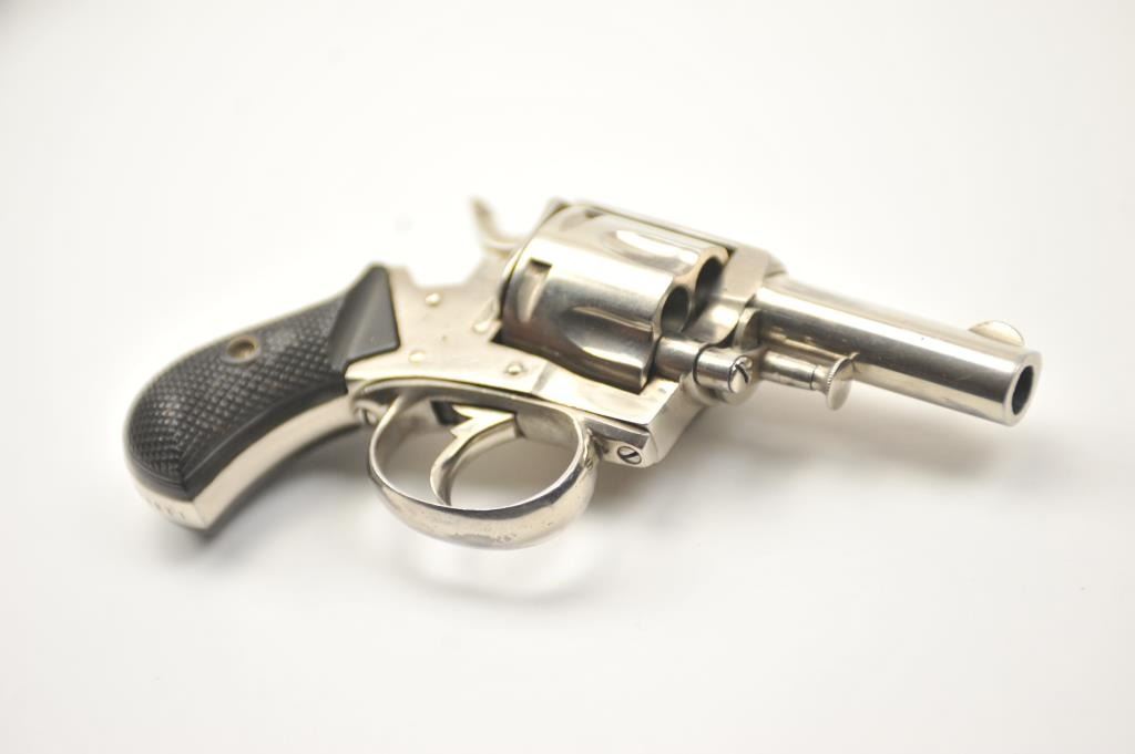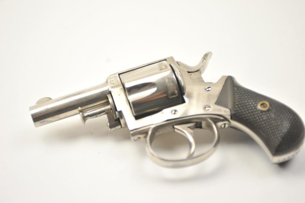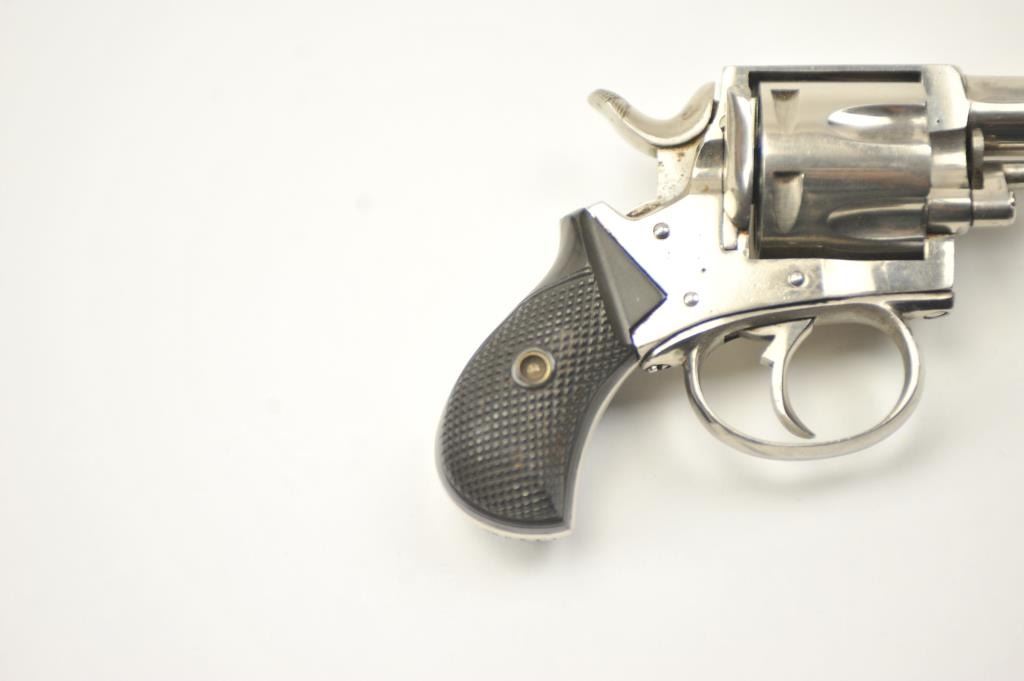 British Bulldog DA revolver, .38 caliber, Serial #11638. The pistol is in fine overall condition with a 2 ½” barrel. The pistol retains approximately 93-95% of the nickel finish with edge wear and thinning at themuzzle. The top strap is clearly marked, British Bulldog and there is a crisp trademark on the left side of the frame. The checkered hard rubber grips are in very good condition with sharp checkering. The action works well and the bore is bright. Est.: $200-$400. (Antique).