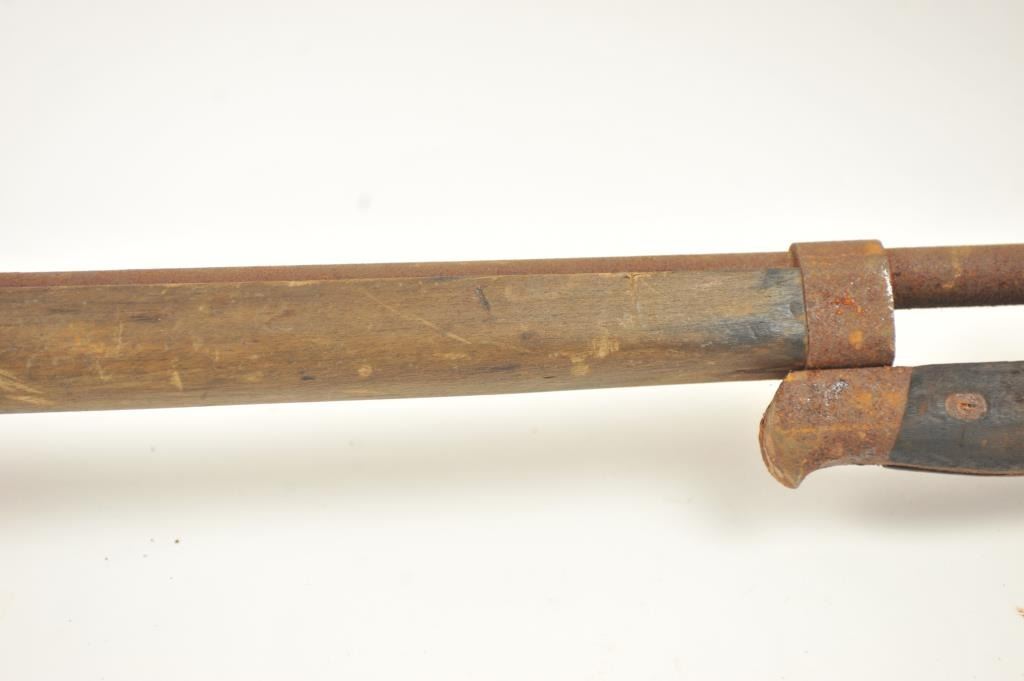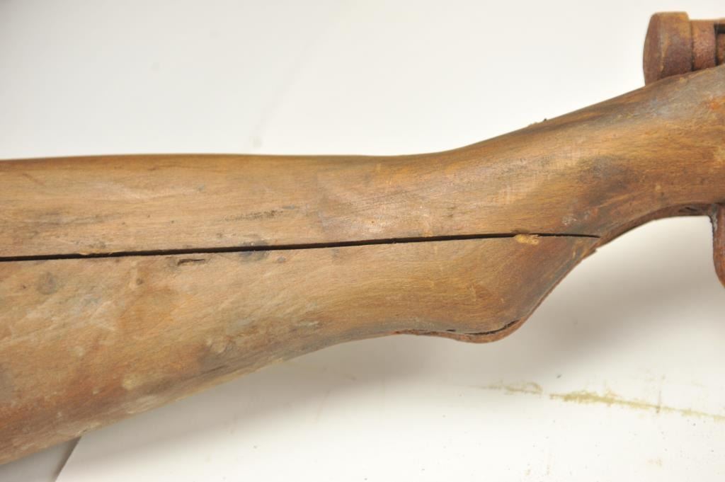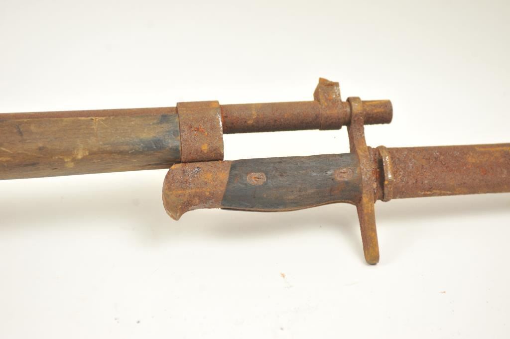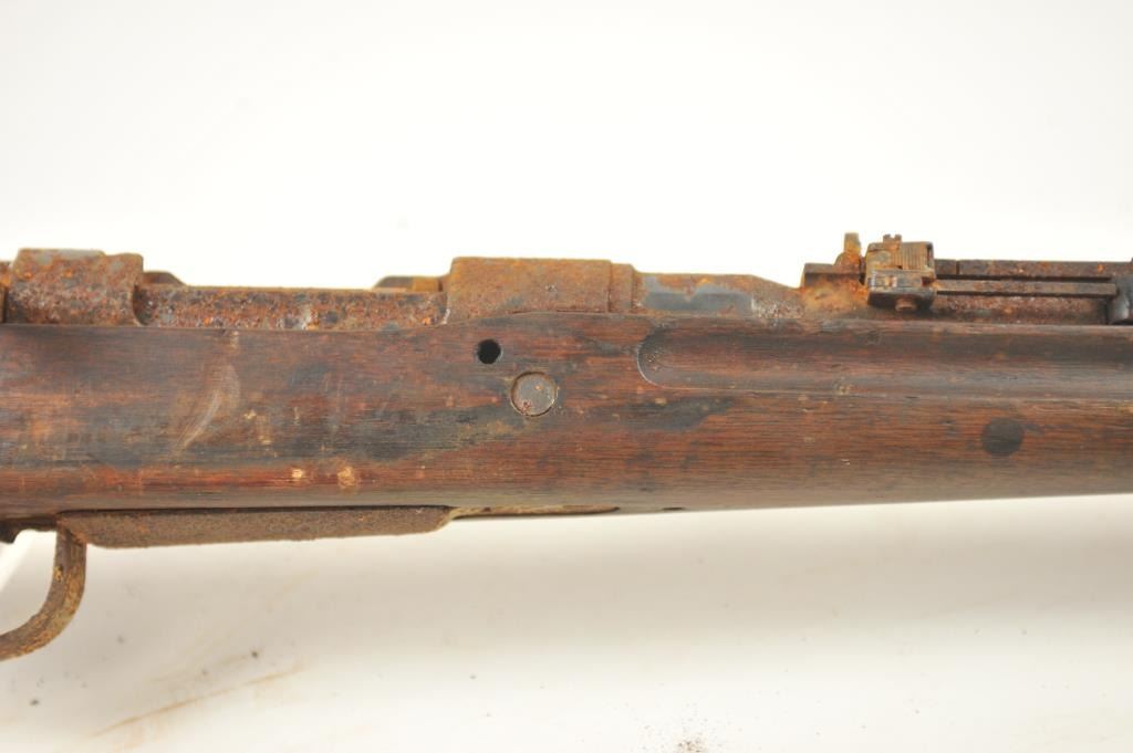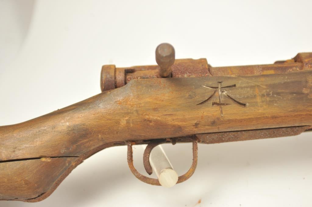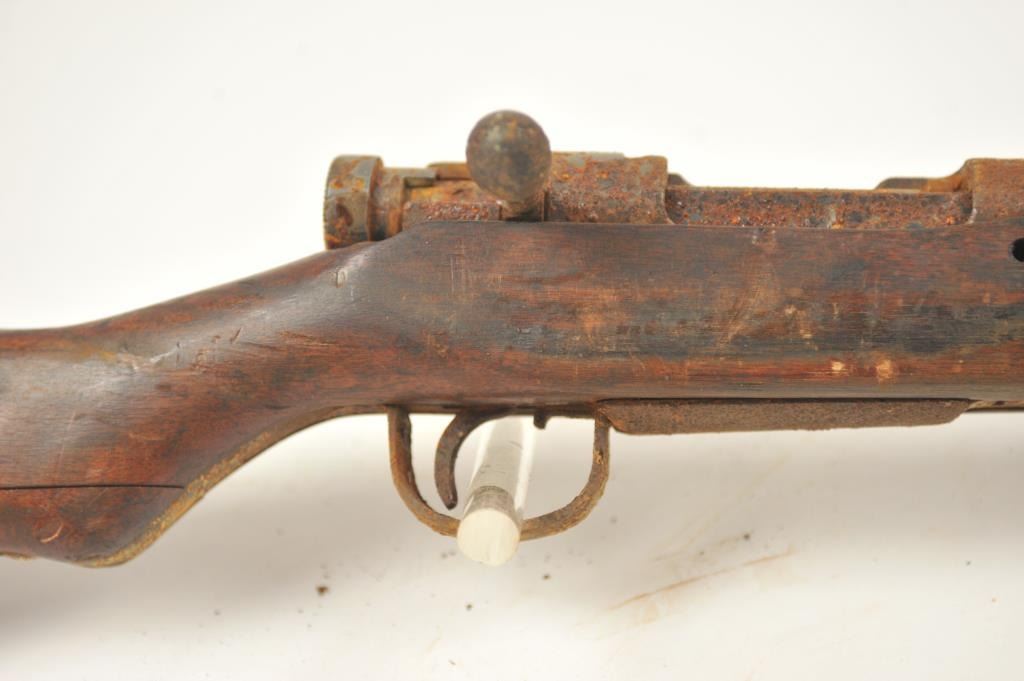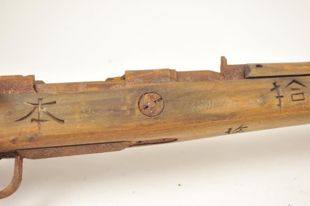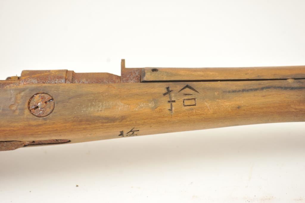 Lot of two Japanese Arisaka rifles. 1. Japanese Arisaka bolt action rifle, 7.7 mm Japanese caliber, Serial #550062. The rifle has a 26” barrel with the aircraft style rear sight with the wings intact. Thestock retains the ramrod with a monopod rest. The receiver still shows the Mum on the front ring and the Kokura marking on the rail. 2. Japanese Arisaka Last Ditch bolt actionrifle, 7.7 Japanese caliber, Serial #24301. The rifle has a 26” barrel with the Mum still visible on the front ring, Nagoya marking on the rail, bayonet with scabbard and Japanese characters carved into the stock.The rifles are water damaged and rusted, needing restoration. The rifles are sold as is, where is, with no warranty made or implied. Est.: $100-$200. (C+R).