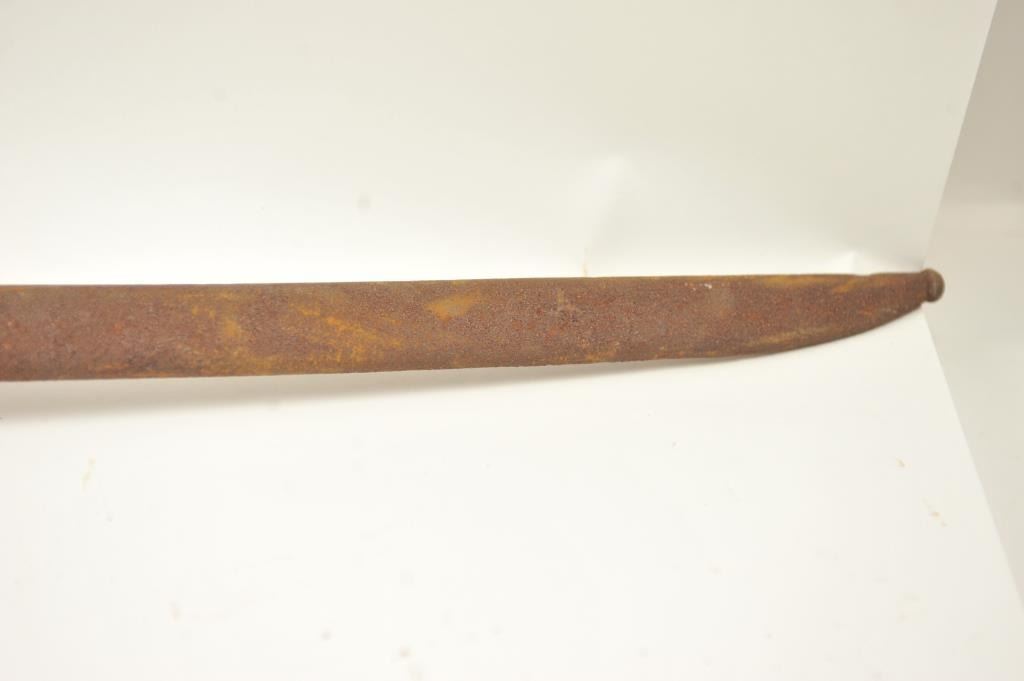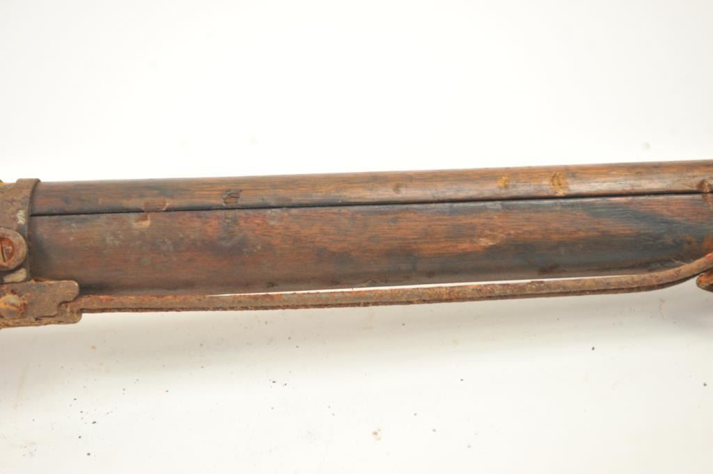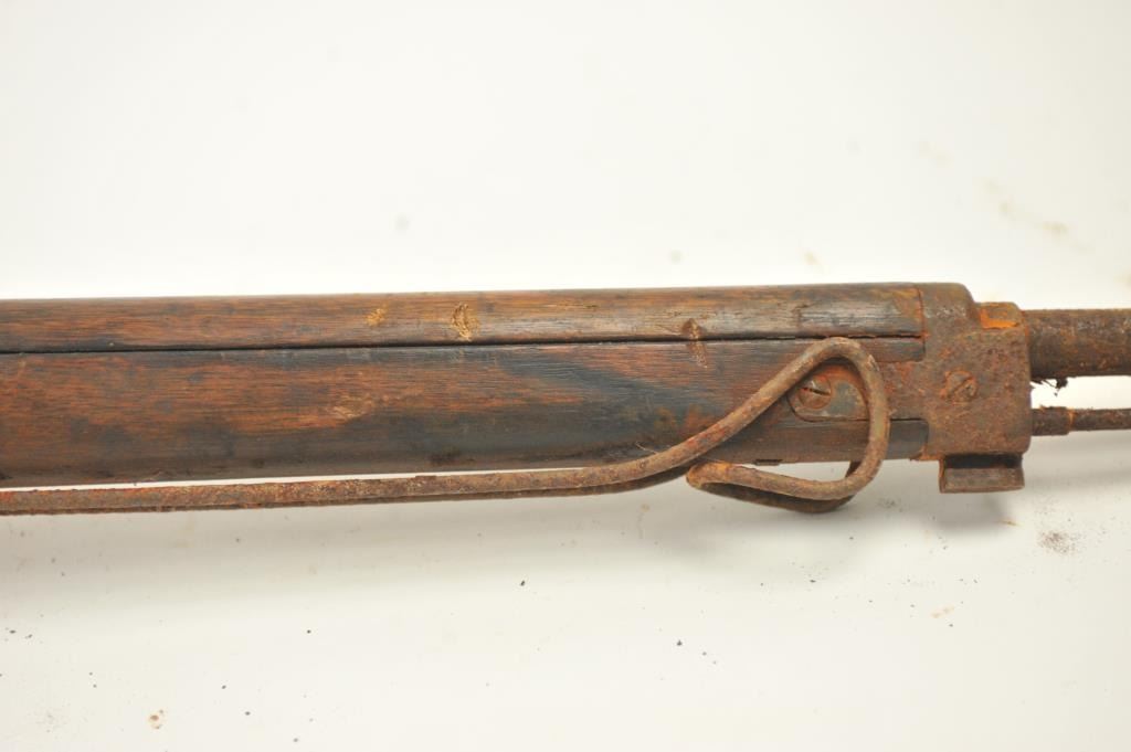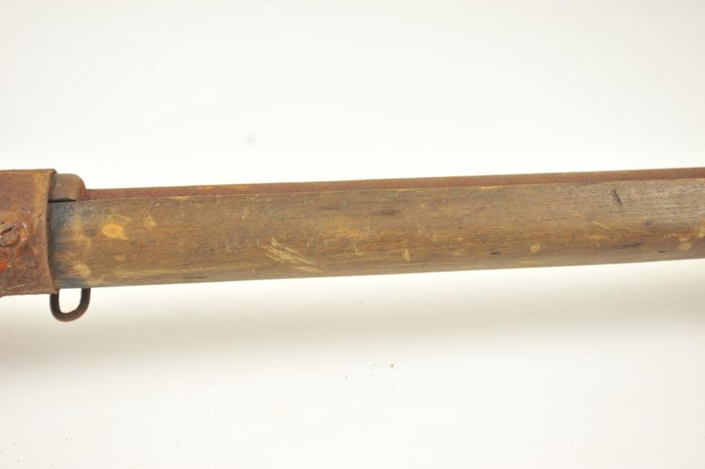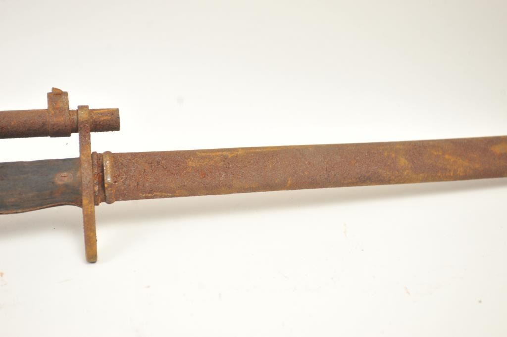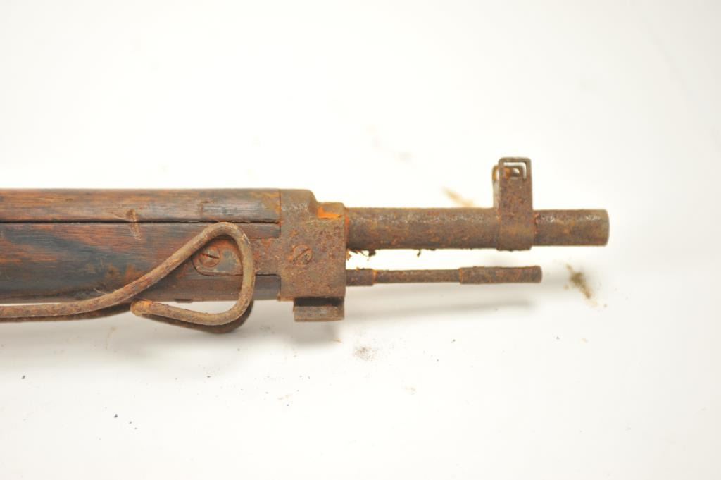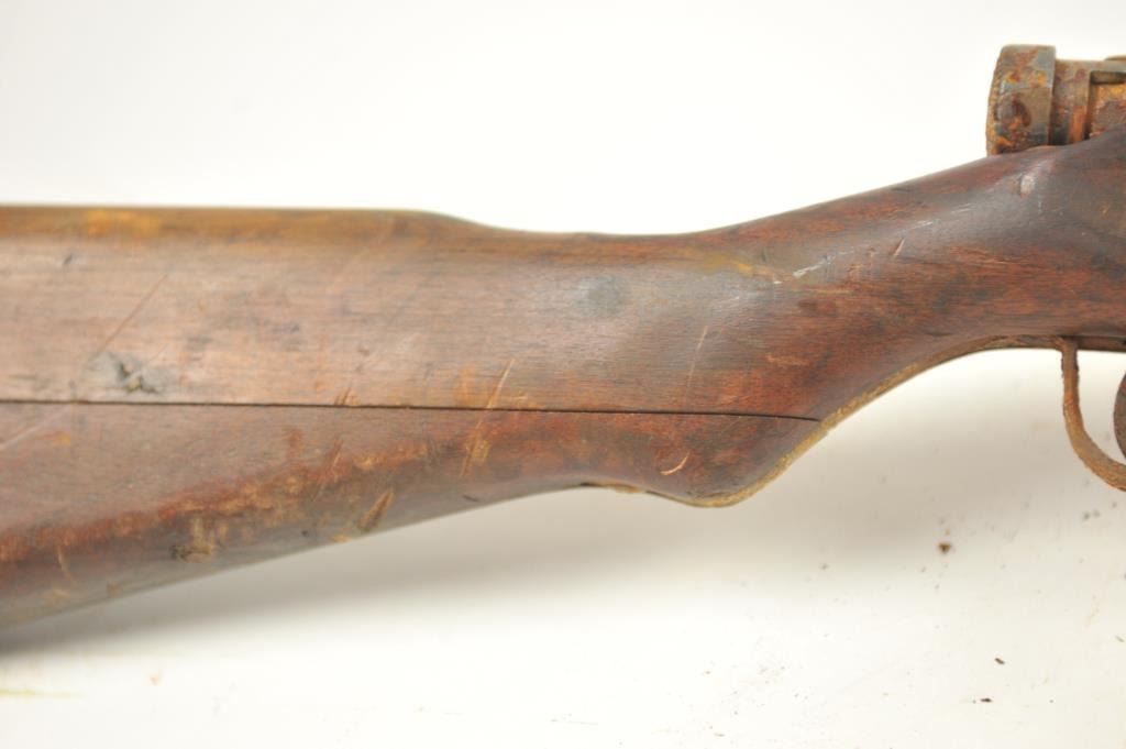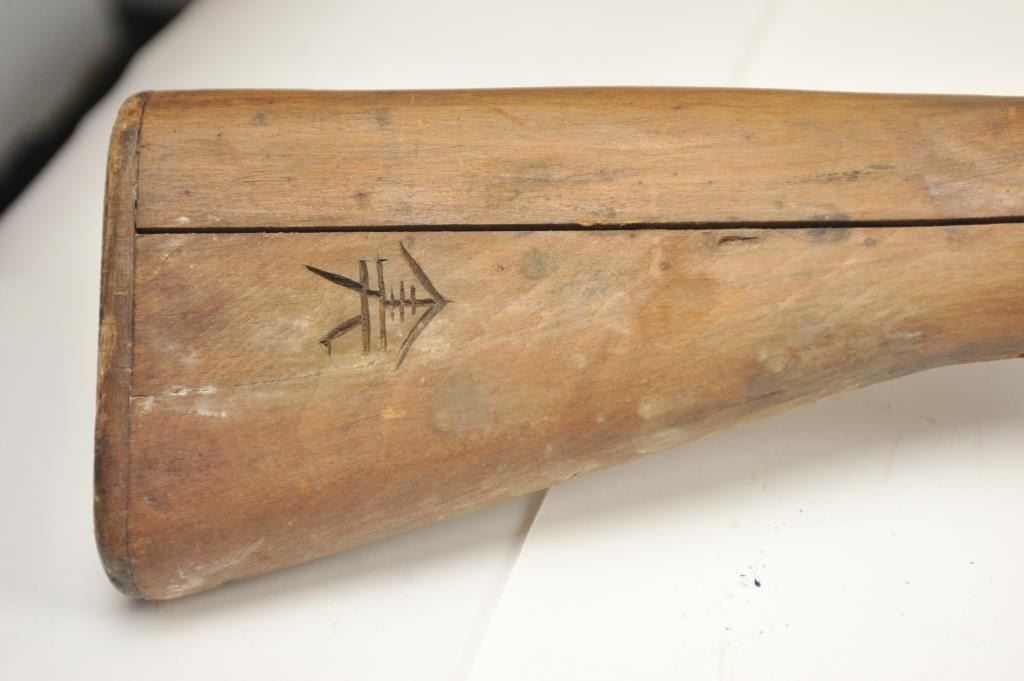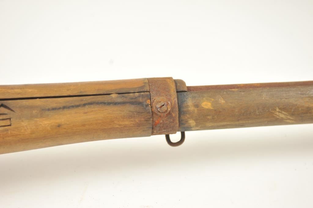 Lot of two Japanese Arisaka rifles. 1. Japanese Arisaka bolt action rifle, 7.7 mm Japanese caliber, Serial #550062. The rifle has a 26” barrel with the aircraft style rear sight with the wings intact. Thestock retains the ramrod with a monopod rest. The receiver still shows the Mum on the front ring and the Kokura marking on the rail. 2. Japanese Arisaka Last Ditch bolt actionrifle, 7.7 Japanese caliber, Serial #24301. The rifle has a 26” barrel with the Mum still visible on the front ring, Nagoya marking on the rail, bayonet with scabbard and Japanese characters carved into the stock.The rifles are water damaged and rusted, needing restoration. The rifles are sold as is, where is, with no warranty made or implied. Est.: $100-$200. (C+R).