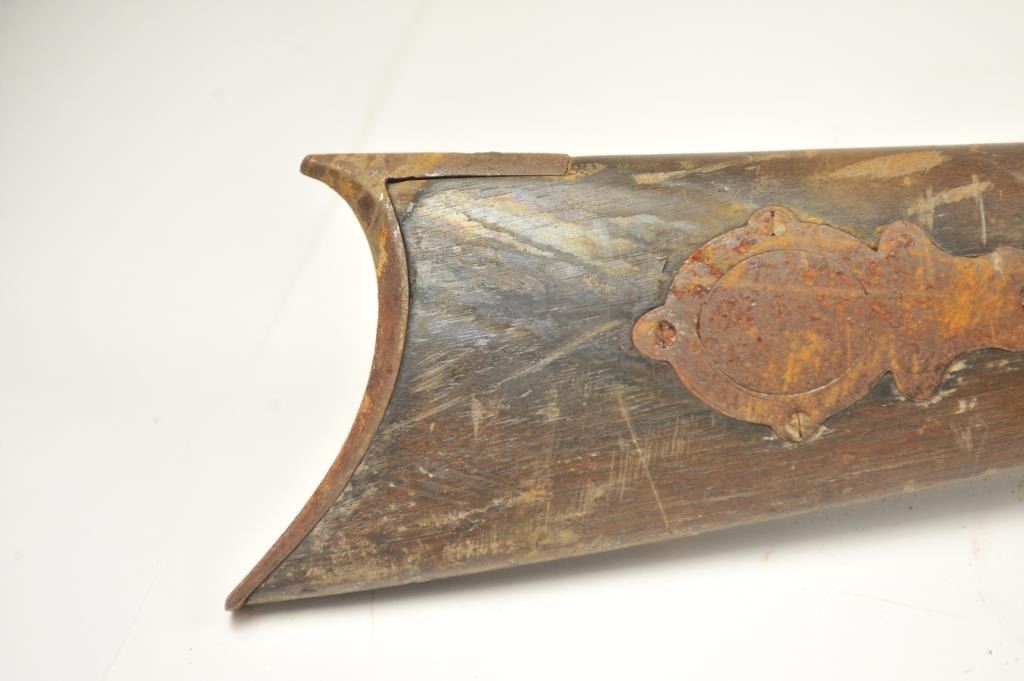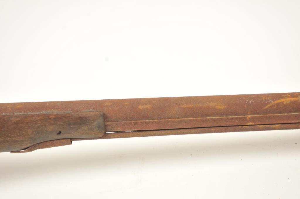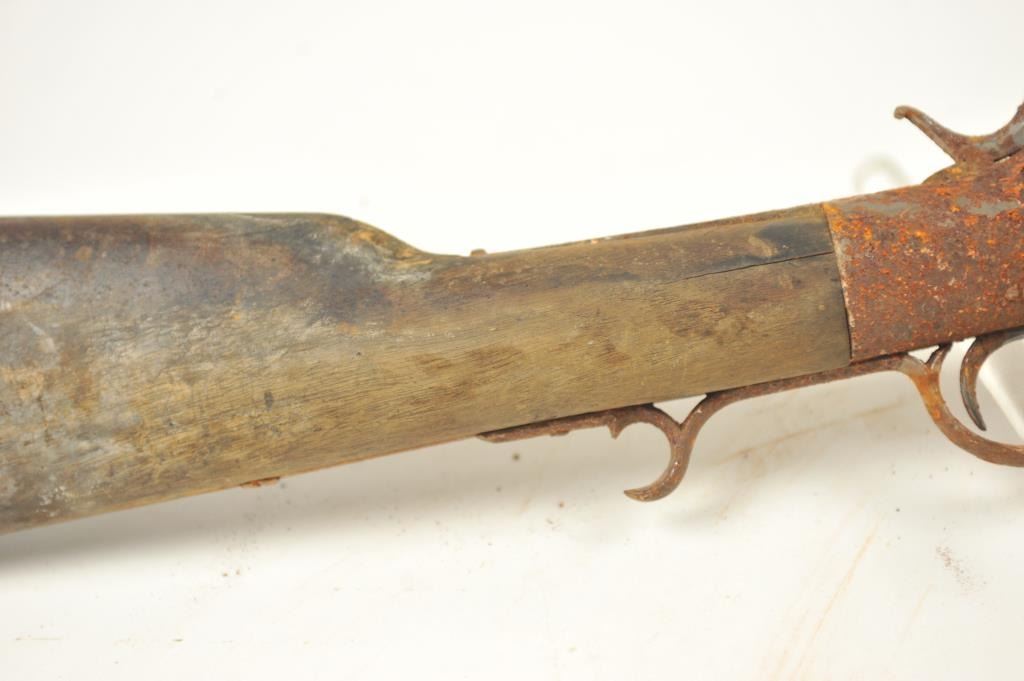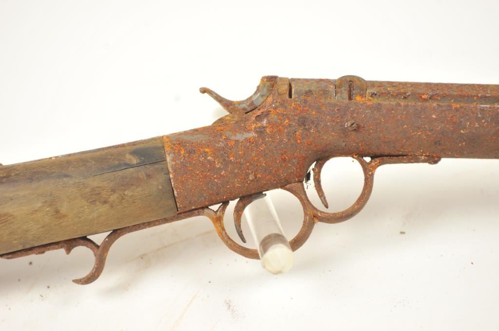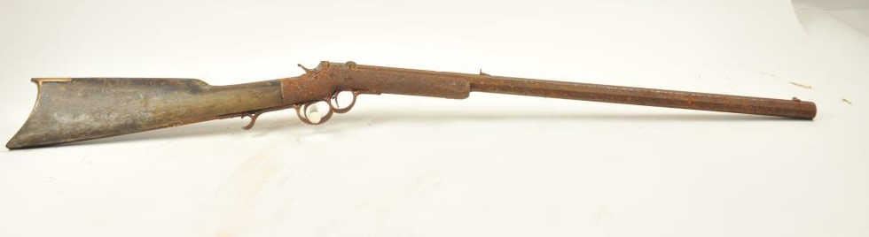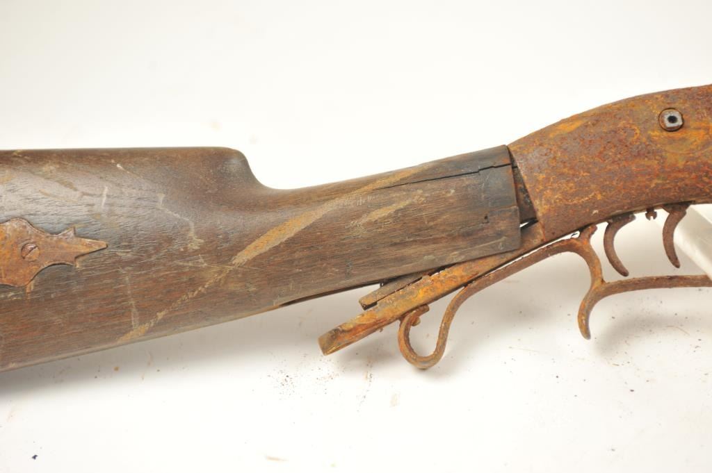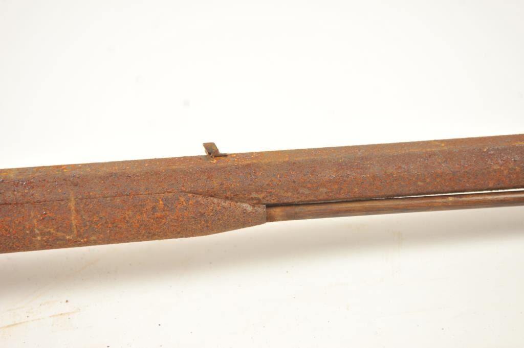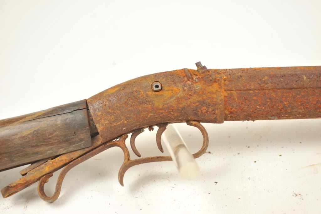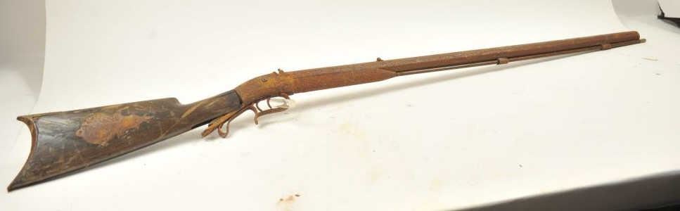 Lot of four rusty relic antique rifles, missing parts in relic condition. The lot includes a Frank Wesson single shot, English Enfield flintlock, Dersch U. Richter percussion Plains rifle and a an unmarkedpercussion single shot, missing the hammer. All four rifles are water damaged and rusted, needing restoration. The rifles are sold as is, where is, with no warranty made or implied. Est.: $150-$300.
