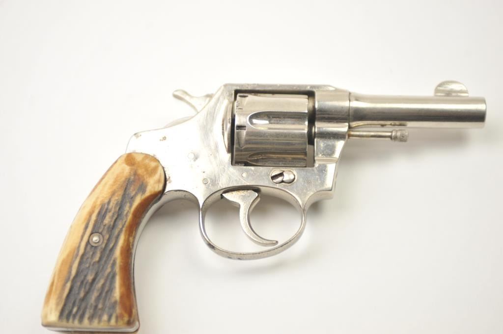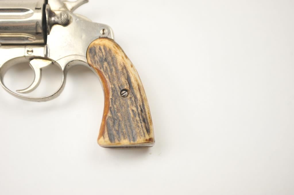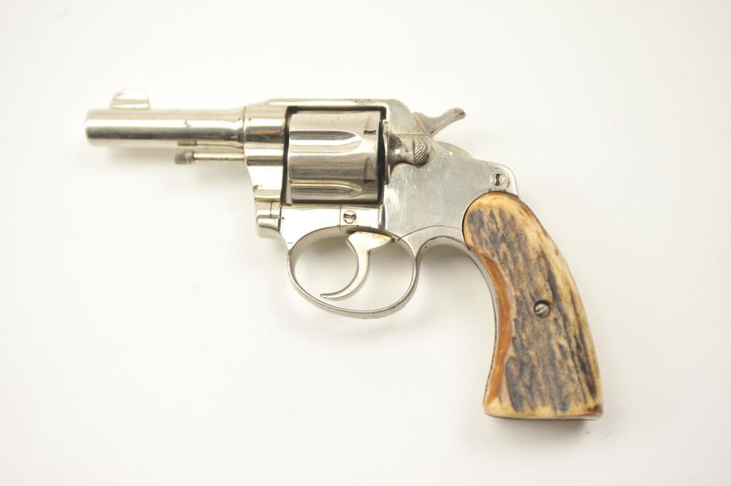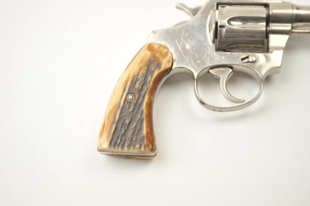 Colt Police Positive DA revolver, .38 caliber, Serial #114103. The pistol is in very good overall condition as refinished with a 3” barrel. The pistol retains the majority of an old re-nickel with themarkings partially removed and light surface rust on the top strap. The replacement stag grips are proud on the edges but show nice figure with a prior owner’s initials scratched into the butt. The action workswell and the bore is fair. Est.: $200-$400. (C+R).