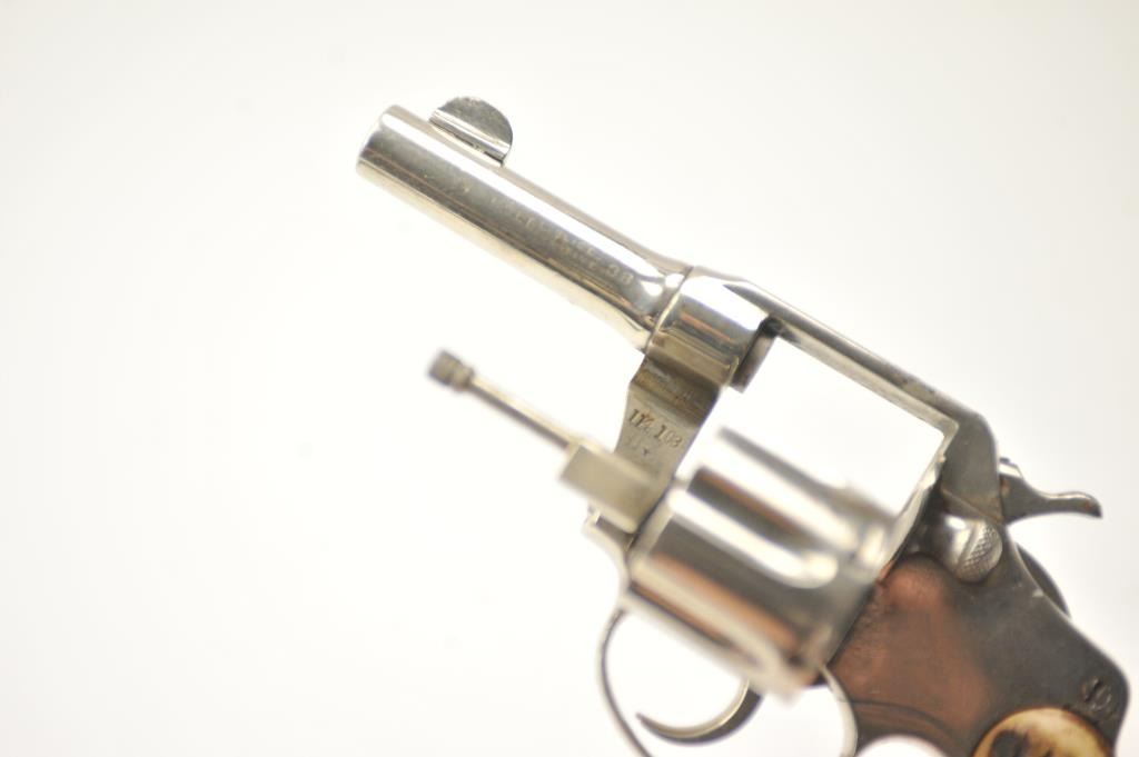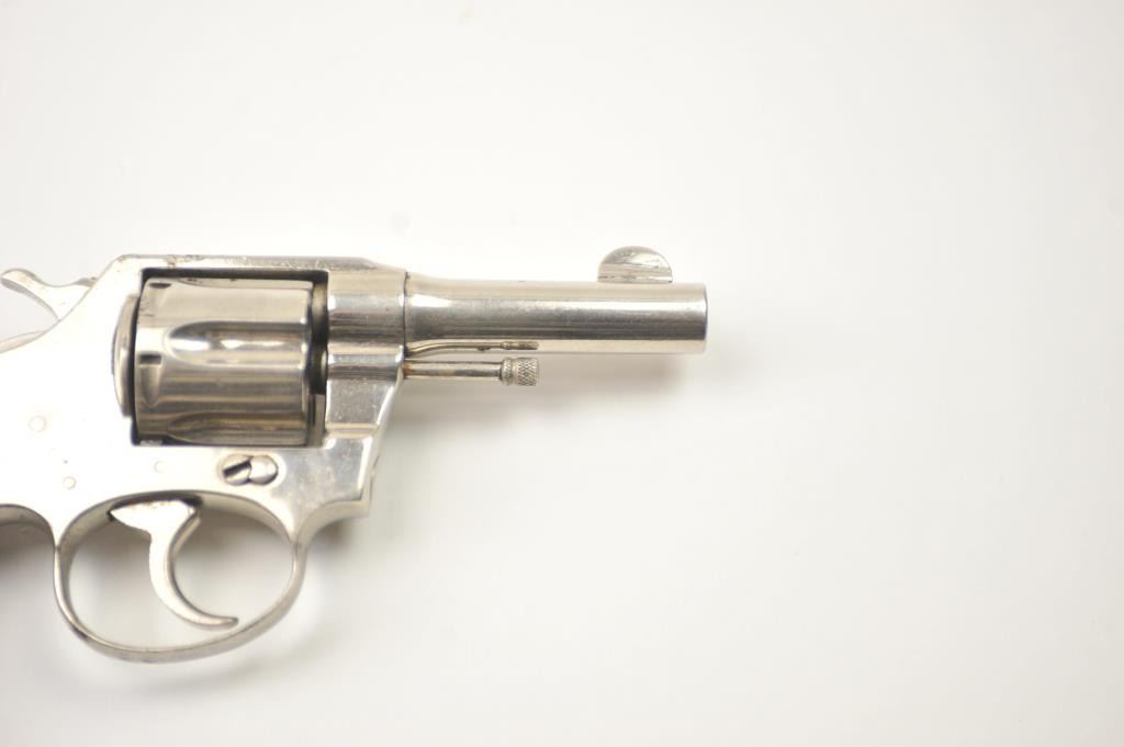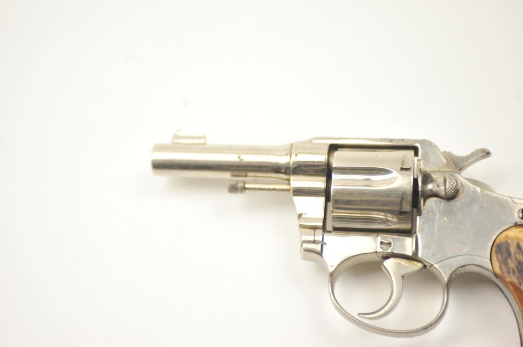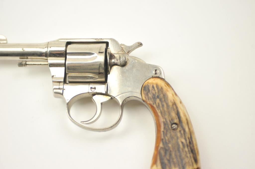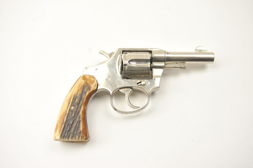 Colt Police Positive DA revolver, .38 caliber, Serial #114103. The pistol is in very good overall condition as refinished with a 3” barrel. The pistol retains the majority of an old re-nickel with themarkings partially removed and light surface rust on the top strap. The replacement stag grips are proud on the edges but show nice figure with a prior owner’s initials scratched into the butt. The action workswell and the bore is fair. Est.: $200-$400. (C+R).
